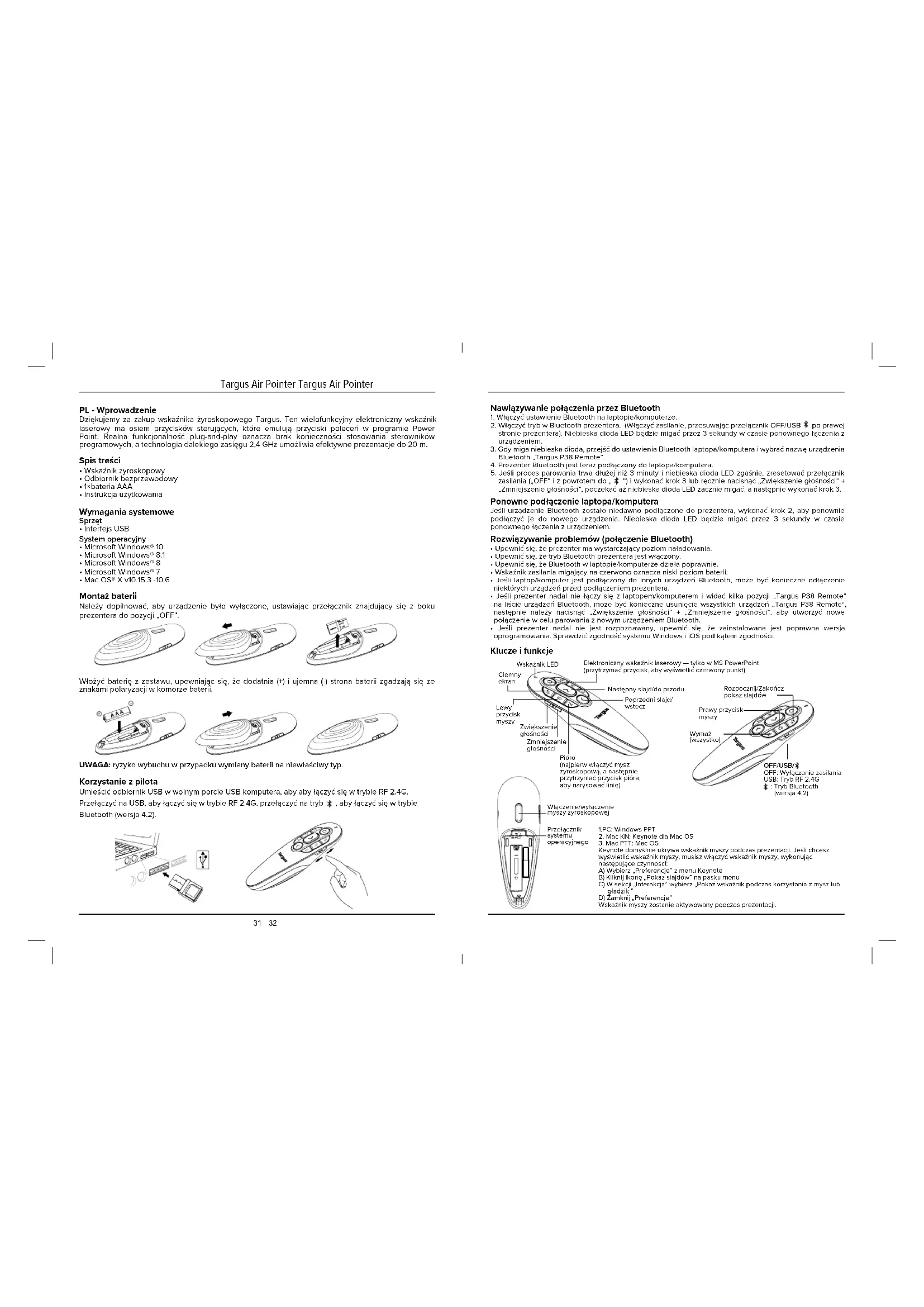 - Mac OS® X v10.15.3 -10.6 Montaż baterii Należy dopilnować, aby urządzenie było wyłączone, ustawiając przełącznik znajdujący się z boku prezentera do pozycji „OFF”. Włożyć baterię z zestawu, upewniając się, że dodatnia (+) i ujemna (-) strona baterii zgadzają się ze znakami polaryzacji w komorze baterii. UWAGA: ryzyko wybuchu w przypadku wymiany baterii na niewłaściwy typ. Korzystanie z pilota Umieścić odbiornik USB w wolnym porcie USB komputera, aby aby łączyć się w trybie RF 2.4G. Przełączyć na USB, aby łączyć się w trybie RF 2.4G, przełączyć na tryb , aby łączyć się w trybie Bluetooth (wersja 4.2). Klucze i funkcje Wskaźnik LEDCiemny ekranNastępny slajd/do przoduPoprzedni slajd/wsteczZwiększenie głośnościZmniejszenie głośnościRozpocznij/Zakończ pokaz slajdówPrawy przycisk myszyWymaż (wszystko)Elektroniczny wskaźnik laserowy — tylko w MS PowerPoint (przytrzymać przycisk, aby wyświetlić czerwony punkt)Przełącznik systemu operacyjnegoWłączenie/wyłączenie myszy żyroskopowejLewy przycisk myszyPióro (najpierw włączyć mysz żyroskopową, a następnie przytrzymać przycisk pióra, aby narysować linię) Nawiązywanie połączenia przez Bluetooth