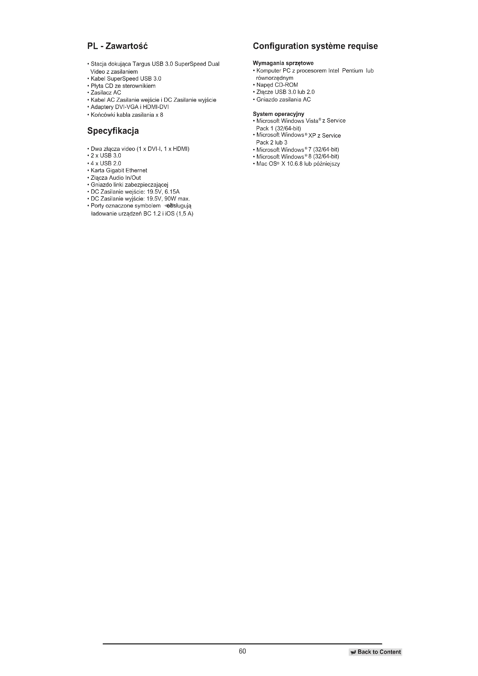- Porty oznaczone symbolem obsługują ładowanie urządzeń BC 1.2 i iOS (1,5 A) Conguration système requise Wymagania sprzętowe
