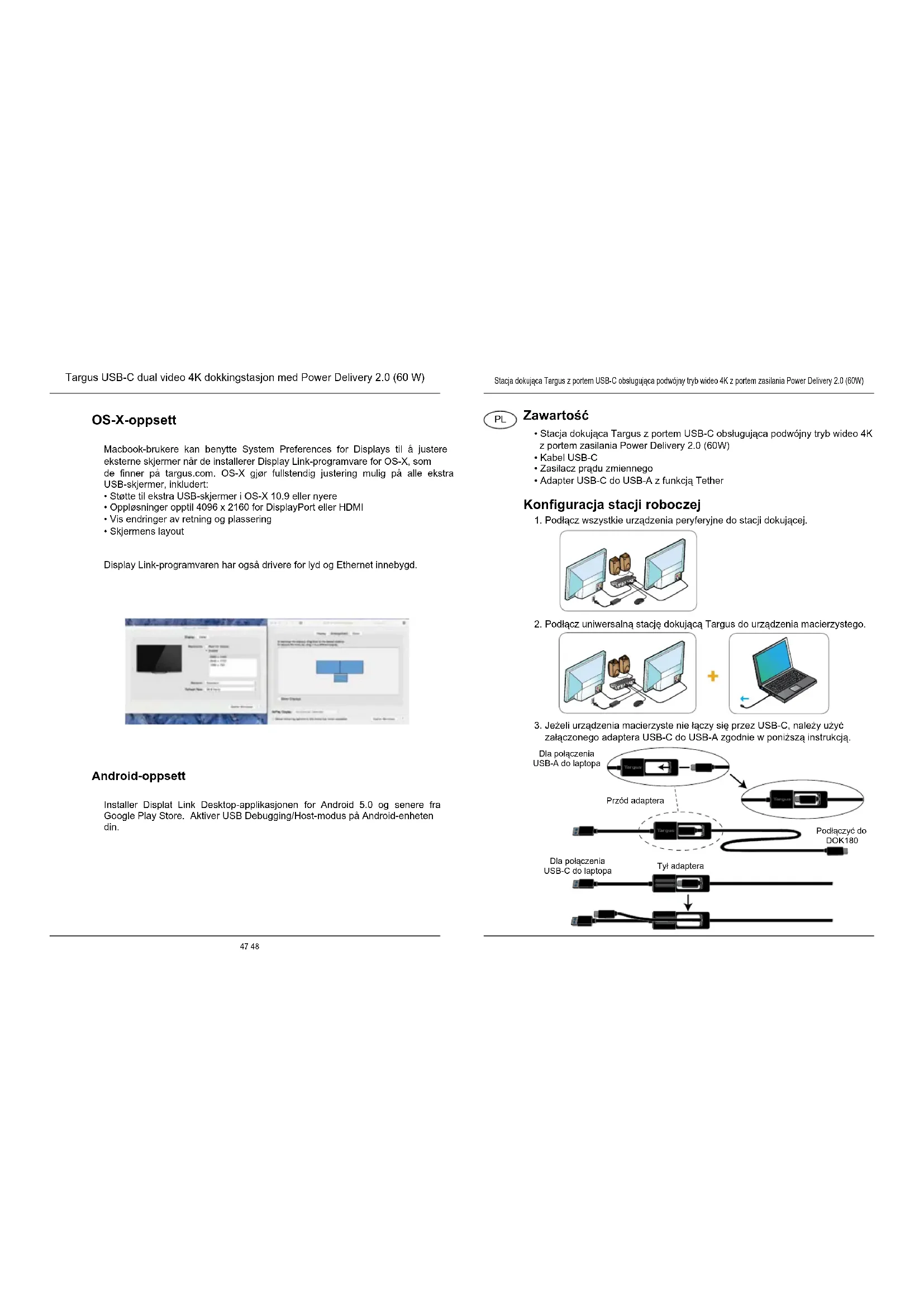 - Zasilacz 20,5 V, 120 W Dane techniczne51 52folding line2 staples here (saddle stitching)folding line2 staples here (saddle stitching)Open size: 10”W x7”H Folded Size: 5”W x 7”H Material: 80gsm woodfree paper Color: GrayscaleDiecut Konguracja w systemie OS-X Konguracja w systemie Android Po zainstalowaniu oprogramowania Display Link dla systemu OS-X, dostępnego na stronie www.targus.com, użytkownicy urządzeń MacBook mogą skonfigurować zewnętrzne monitory, korzystając z okna Preferencji systemowych dotyczacych wyświetlaczy. OS-X umożliwia konfigurację wszystkich dodatkowych wyświetlaczy USB, w tym:
