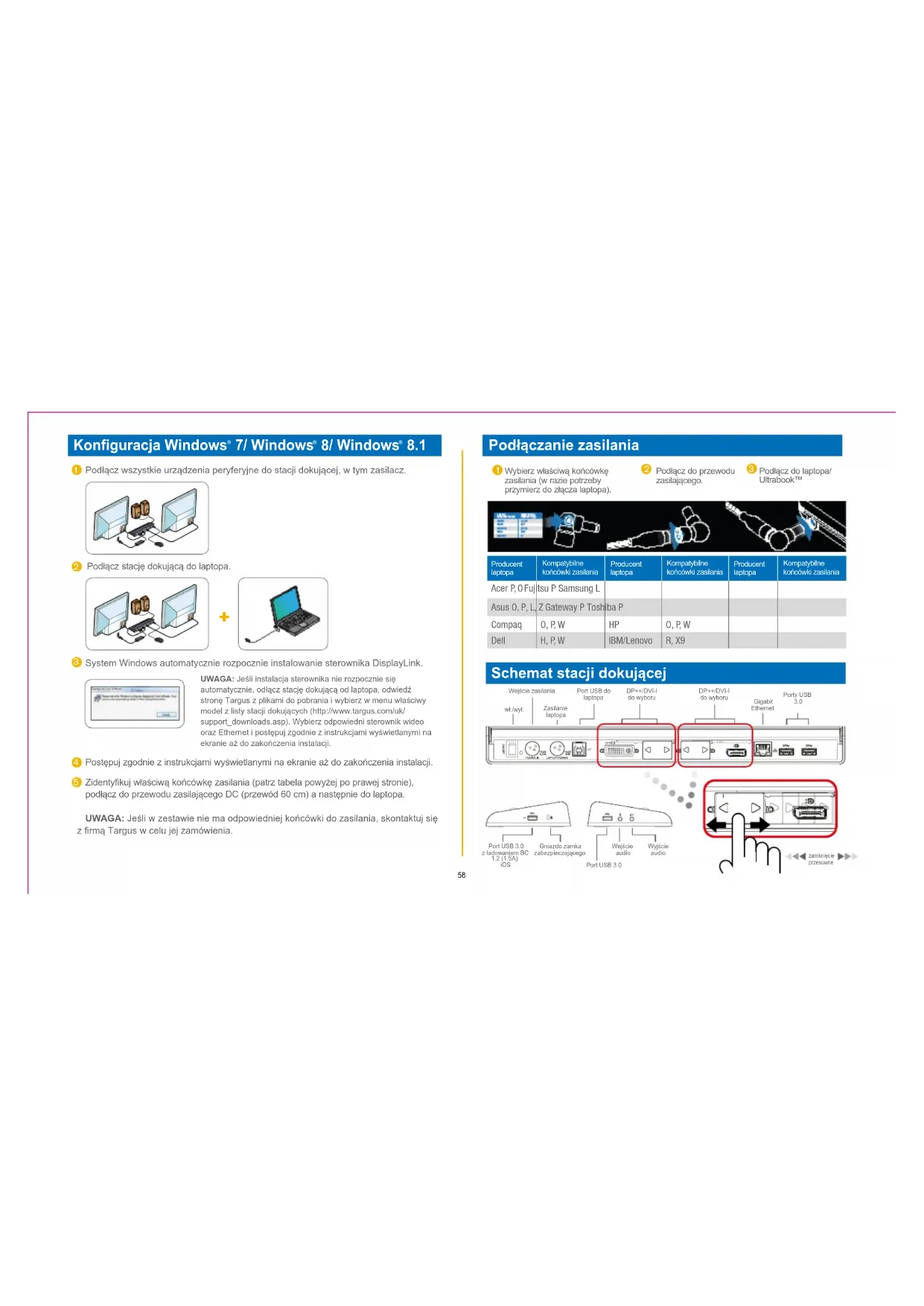 Podłącz do laptopa/Ultrabook™Producent laptopaKompatybilne końcówki zasilaniaProducent laptopaKompatybilne końcówki zasilaniaProducent laptopaKompatybilne końcówki zasilania Acer P, O Fujitsu P Samsung L Asus O, P, L, Z Gateway P Toshiba P Compaq O, P, W HP O, P, W Dell H, P, W IBM/Lenovo R, X9 wł./wył.Port USB do laptopaPorty USB Wejście zasilaniaZasilanie laptopaGigabit EthernetDP++/DVI-Ido wyboruDP++/DVI-Ido wyboruWejście audioPort USB 3.0Wyjście audioGniazdo zamka zabezpieczającegoPort USB 3.0z ładowaniem BC 1.2 (1.5A) iOS