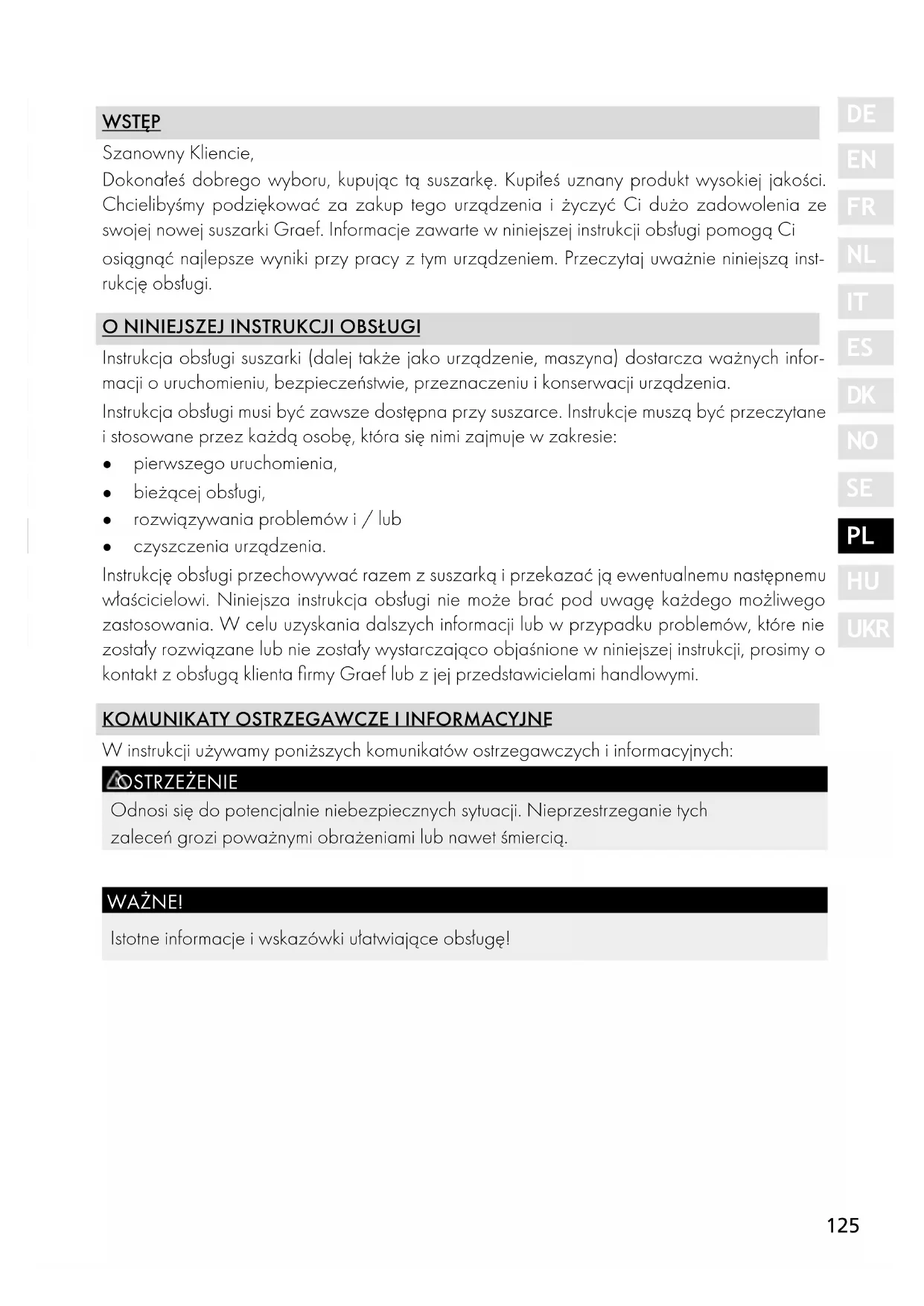 UKR WSTĘP Szanowny Kliencie, Dokonałeś dobrego wyboru, kupując tą suszarkę. Kupiłeś uznany produkt wysokiej jakości. Chcielibyśmy podziękować za zakup tego urządzenia i życzyć Ci dużo zadowolenia ze swojej nowej suszarki Graef. Informacje zawarte w niniejszej instrukcji obsługi pomogą Ci osiągnąć najlepsze wyniki przy pracy z tym urządzeniem. Przeczytaj uważnie niniejszą inst- rukcję obsługi.