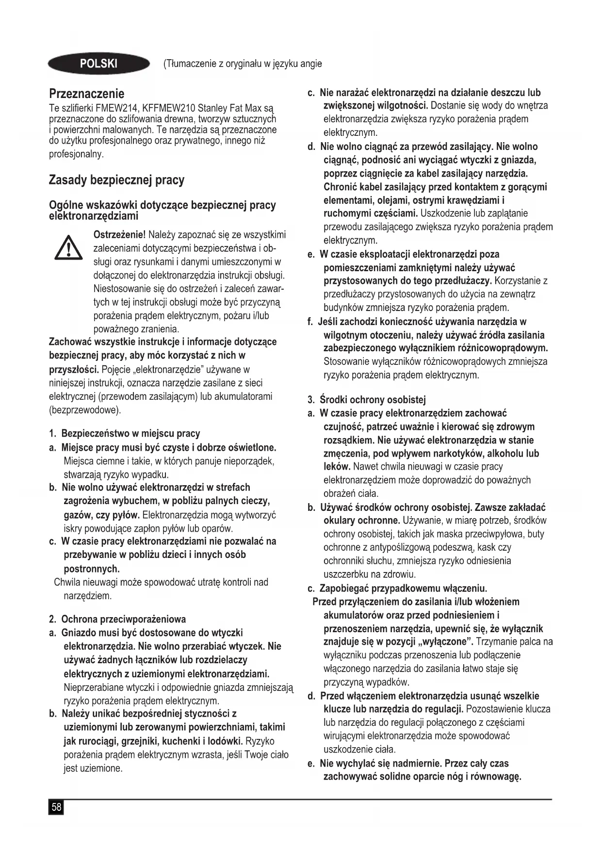 για να λαμβάνετε ενημερώσεις σχετικά με νέα προϊόντα και ειδικές προσφορές.58 (Tłumaczenie z oryginału w języku angielskim) POLSKI Przeznaczenie Te szlierki FMEW214, KFFMEW210 Stanley Fat Max są przeznaczone do szlifowania drewna, tworzyw sztucznych i powierzchni malowanych. Te narzędzia są przeznaczone do użytku profesjonalnego oraz prywatnego, innego niż profesjonalny. Zasady bezpiecznej pracy Ogólne wskazówki dotyczące bezpiecznej pracy elektronarzędziami
