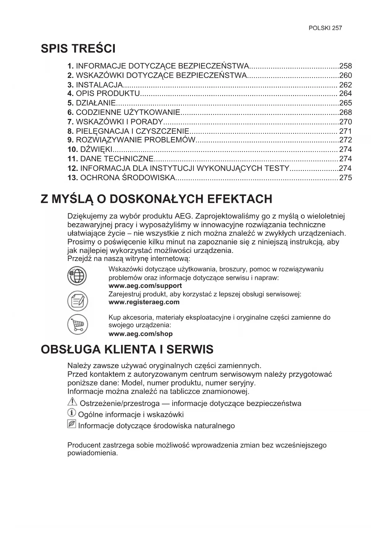 Z MYŚLĄ O DOSKONAŁYCH EFEKTACH Dziękujemy za wybór produktu AEG. Zaprojektowaliśmy go z myślą o wieloletniej bezawaryjnej pracy i wyposażyliśmy w innowacyjne rozwiązania techniczne ułatwiające życie – nie wszystkie z nich można znaleźć w zwykłych urządzeniach. Prosimy o poświęcenie kilku minut na zapoznanie się z niniejszą instrukcją, aby jak najlepiej wykorzystać możliwości urządzenia. Przejdź na naszą witrynę internetową: Wskazówki dotyczące użytkowania, broszury, pomoc w rozwiązywaniu problemów oraz informacje dotyczące serwisu i napraw: www.aeg.com/support Zarejestruj produkt, aby korzystać z lepszej obsługi serwisowej: www.registeraeg.com Kup akcesoria, materiały eksploatacyjne i oryginalne części zamienne do swojego urządzenia: www.aeg.com/shop