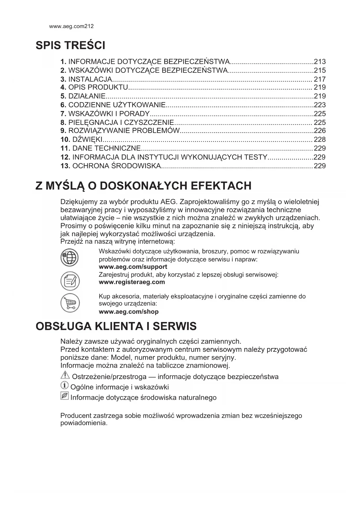 Należy zawsze używać oryginalnych części zamiennych. Przed kontaktem z autoryzowanym centrum serwisowym należy przygotować poniższe dane: Model, numer produktu, numer seryjny. Informacje można znaleźć na tabliczce znamionowej. Ostrzeżenie/przestroga — informacje dotyczące bezpieczeństwa Ogólne informacje i wskazówki Informacje dotyczące środowiska naturalnego Producent zastrzega sobie możliwość wprowadzenia zmian bez wcześniejszego powiadomienia. www.aeg.com2121. INFORMACJE DOTYCZĄCE BEZPIECZEŃSTWA Przed przystąpieniem do instalacji i rozpoczęciem eksploatacji urządzenia należy uważnie zapoznać się z dołączoną instrukcją obsługi. Producent nie odpowiada za obrażenia ciała ani szkody spowodowane nieprawidłową instalacją lub eksploatacją urządzenia. Należy zachować instrukcję obsługi w bezpiecznym i łatwo dostępnym miejscu w celu wykorzystania w przyszłości.