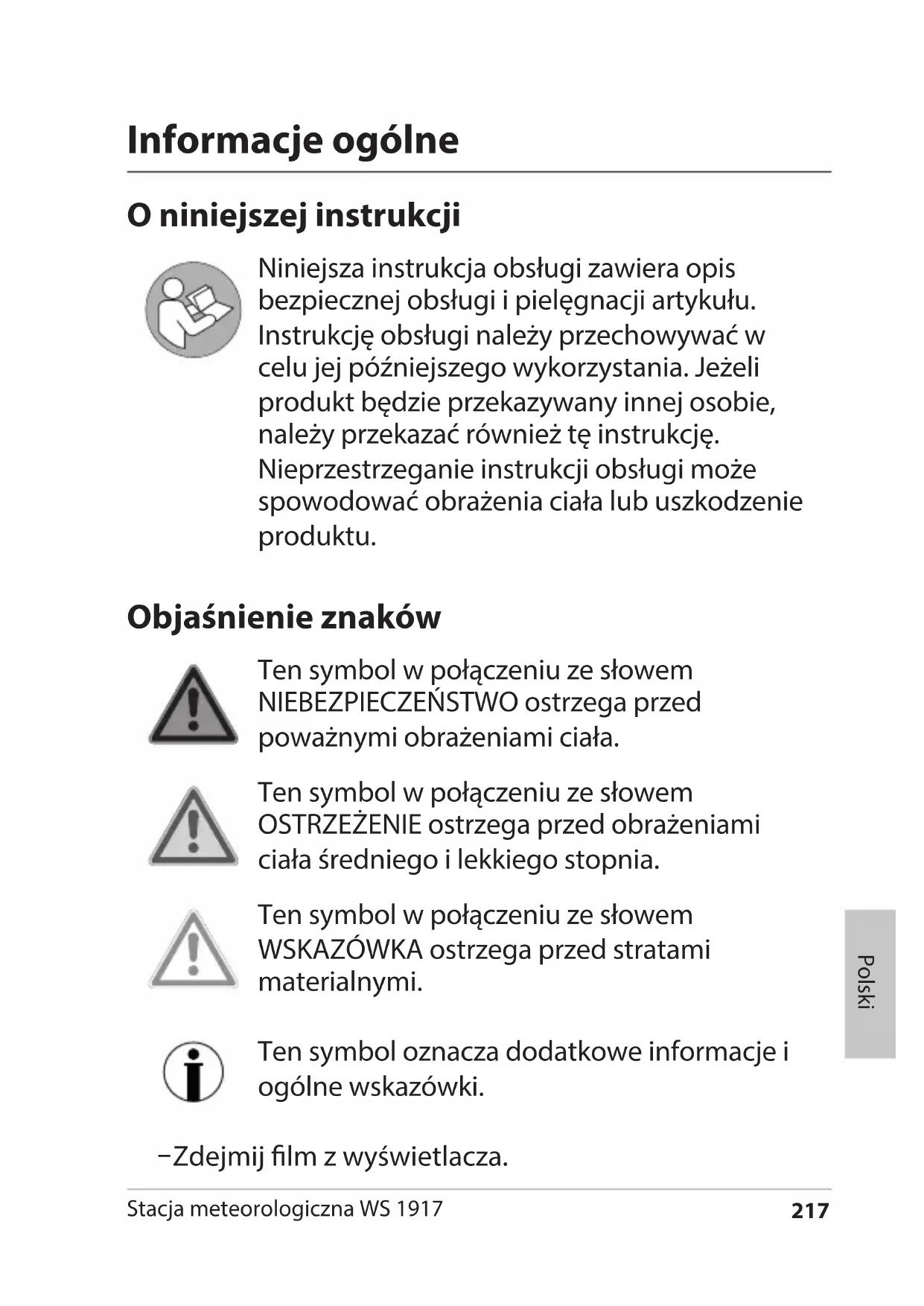 - Utylizacja 17 Stacja meteorologiczna WS 1917 Polski Informacje ogólne O niniejszej instrukcji Niniejsza instrukcja obsługi zawiera opis bezpiecznej obsługi i pielęgnacji artykułu. Instrukcję obsługi należy przechowywać w celu jej późniejszego wykorzystania. Jeżeli produkt będzie przekazywany innej osobie, należy przekazać również tę instrukcję. Nieprzestrzeganie instrukcji obsługi może spowodować obrażenia ciała lub uszkodzenie produktu. Objaśnienie znaków Ten symbol w połączeniu ze słowem NIEBEZPIECZEŃSTWO ostrzega przed poważnymi obrażeniami ciała. Ten symbol w połączeniu ze słowem OSTRZEŻENIE ostrzega przed obrażeniami ciała średniego i lekkiego stopnia. Ten symbol w połączeniu ze słowem WSKAZÓWKA ostrzega przed stratami materialnymi. Ten symbol oznacza dodatkowe informacje i ogólne wskazówki. − Zdejmij lm z wyświetlacza.218 Stacja meteorologiczna WS 1917 Bezpieczeństwo To urządzenie może być używane przez dzieci w wieku do lat 8 oraz przez osoby z ograniczonymi zdolnościami zycznymi, sensorycznymi lub mentalnymi bądź którym brakuje doświadczenia i/ lub wiedzy tylko wtedy, gdy są nadzorowane lub przeszły przeszkolenie z zakresu bezpiecznego użytkowania urządzenia i zrozumiały wynikające z tego niebezpieczeństwa. Urządzenie oraz zasilacz powinny znajdować się z dala od dzieci w wieku poniżej 8 lat. Dzieci nie mogą czyścić ani serwisować urządzenia, chyba że mają 8 lat lub więcej i są nadzorowane. Baterie mogą stanowić śmiertelne zagrożenie. Dlatego należy trzymać baterię poza zasięgiem małych dzieci. Jeśli bateria zostanie połknięta lub w inny sposób przedostanie się do ciała, należy natychmiast wezwać pomoc medyczną. W przeciwnym razie w ciągu 2godzin może dojść do ciężkich obrażeń wewnętrznych, które mogą prowadzić do śmierci. Dzieci muszą być pod stałym nadzorem, aby zapewnić, że nie będą bawiły się urządzeniem. Radiowej stacji pogodowej ani zasilacza nie wolno zanurzać w wodzie ani innych płynach. Niebezpieczeństwo porażenia prądem! Dlatego właśnie podstawy radiowej stacji pogodowej nie wolno również używać w pobliżu źródeł wilgoci, jak np. zlewu.219 Stacja meteorologiczna WS 1917 Polski Należy używać wyłącznie dostarczonego zasilacza i wymieniać go tylko na zasilacz tego samego rodzaju. Zasilacz wolno stosować wyłącznie w suchych pomieszczeniach, chroniąc go przed wilgocią. Niebezpieczeństwodla dzieci Dzieci należy trzymać również z dala od opakowania i małych elementów znajdujących się w zakresie dostawy. Połknięcie grozi uduszeniem. Niebezpieczeństwo spowodowane elektrycznością Urządzenie należy podłączyć do prawidłowo zamontowanego gniazdka elektrycznego, które odpowiada napięciu podanemu w części „Dane techniczne”. Aby zapewnić możliwość szybkiego wyjęcia zasilacza w razie potrzeby, gniazdo powinno być łatwo dostępne. W przypadku uszkodzenia zasilacza lub kabla zasilającego nie wolno używać radiowej stacji pogodowej. Nie wolno zasłaniać zasilacza sieciowego zasłonami, gazetami itd. oraz należy zapewnić dostateczną wentylację. Zasilacz sieciowy może się rozgrzać. Przed podłączeniem należy całkowicie odwinąć kabel zasilacza sieciowego. Zwrócić przy tym uwagę, aby kabel nie został uszkodzony przez ostre krawędzie lub gorące przedmioty.220 Stacja meteorologiczna WS 1917 Zasilacz sieciowy należy wyciągać z gniazdka: − przed czyszczeniem radiowej stacji pogodowej, − kiedy podczas obsługi dojdzie do oczywistej usterki, podczas burzy. − Zawsze należy przy tym ciągnąć za wtyczkę, a nie za kabel. Nie modykować produktu ani kabla przyłączeniowego. Naprawy zlecać tylko specjalistycznym zakładom, ponieważ niewłaściwie naprawiane urządzenia stanowią zagrożenie dla użytkownika. Nie wolno wymieniać kabla zasilacza sieciowego. W przypadku uszkodzenia kabla lub zasilacza sieciowego należy go zutylizować i zastąpić zasilaczem sieciowym tego samego typu. Niebezpieczeństwo obrażeń ciała Uwaga: Zagrożenie wybuchem w przypadku nieprawidłowego obchodzenia się z bateriami. Baterii nie wolno ładować, reaktywować w inny sposób, rozkładać na części, wrzucać w ogień lub powodować ich zwarcia. Należy unikać kontaktu płynu baterii ze skórą, oczami czy śluzówką. W przypadku takiego kontaktu dane miejsca należy spłukać obcie czystą wodą i natychmiast udać się do lekarza. Informacja o szkodach rzeczowych Stację bazową i czujnik zewnętrzny należy chronić przed kurzem, uderzeniami, skrajnymi temperaturami oraz bezpośrednim nasłonecznieniem.221 Stacja meteorologiczna WS 1917 Polski Stację bazową należy również chronić przed wilgocią. Należy ją umieszczać wyłącznie w suchym, zamkniętym pomieszczeniu. Czujnik zewnętrzny jest zabezpieczony przed wilgocią, musi być jednak chroniony przed bezpośrednim zawilgoceniem, np. podczas deszczu. Wyjąć baterie ze stacji bazowej i z czujnika zewnętrznego, jeżeli są zużyte lub jeżeli stacja pogodowa nie będzie używana przez dłuższy czas. W ten sposób unika się uszkodzeń, jakie mogą powstać na skutek wycieku. Nie narażać baterii na oddziaływanie skrajnych warunków np. poprzez składowanie ich na grzejnikach lub bezpośrednio w miejscach nasłonecznionych. Podwyższone niebezpieczeństwo wycieku! W razie potrzeby przed włożeniem należy wyczyścić styki baterii i urządzenia. Zawsze wymieniać jednocześnie wszystkie baterie w stacji bazowej lub w czujniku zewnętrznym. Stosować tylko baterie tego samego typu, nie używać różnych typów ani nie mieszać zużytych i nowych baterii. Nie modykować urządzenia. Naprawy zlecać tylko specjalistycznym zakładom i przestrzegać warunków gwarancji. Do czyszczenia stacji pogodowej nigdy nie używać twardych, zarysowujących lub trących środków czyszczących itp. Może dojść bowiem do zarysowań powierzchni.222 Sta