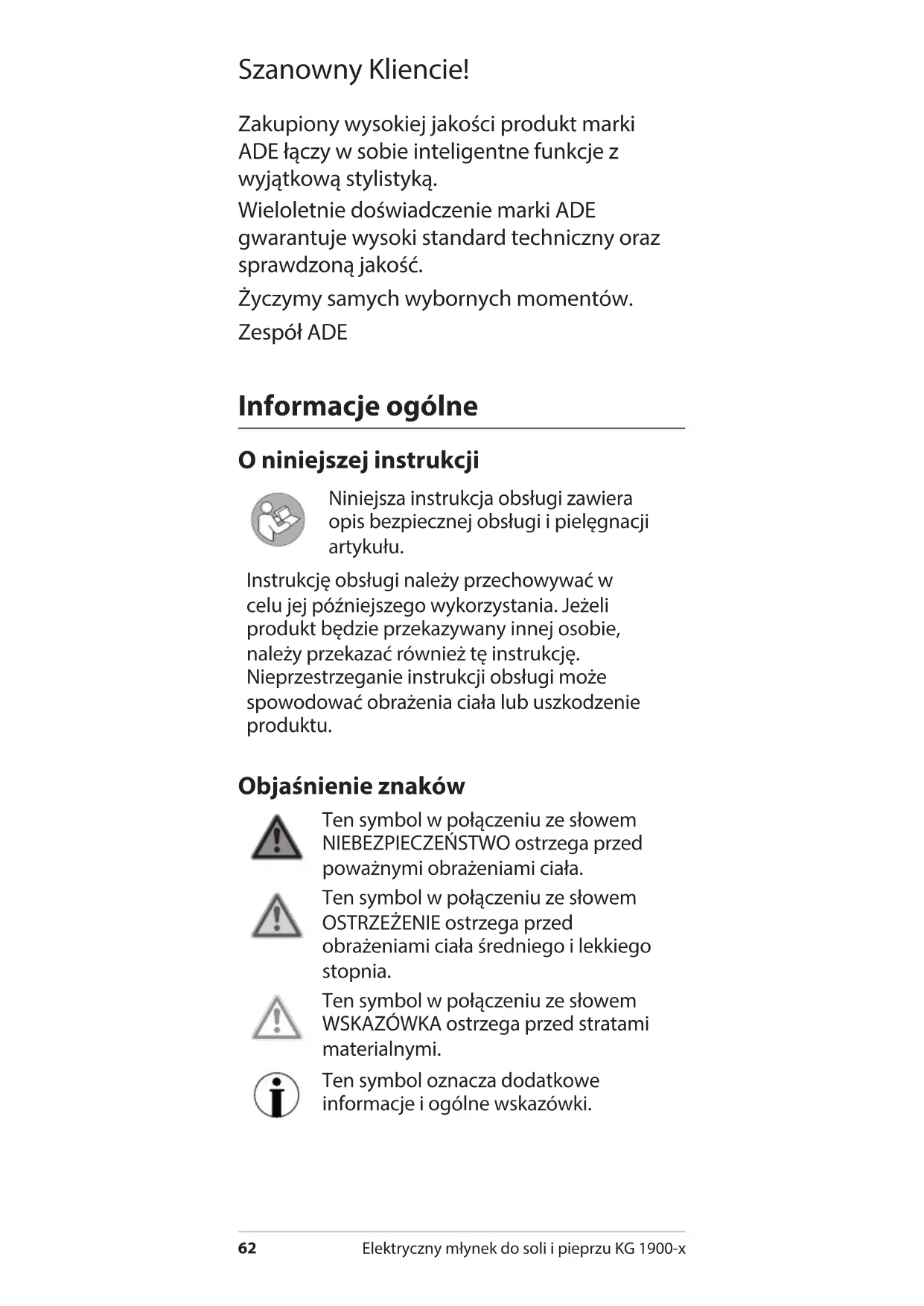 Italiano Smaltimento del prodotto Smaltire il prodotto secondo le norme vigenti nel proprio paese. Il dispositivo non deve essere smaltito con i normali rifiuti domestici Al termine della sua vita utile, l'apparecchio deve essere smaltito in modo appropriato. In tal modo si rende possibile il riutilizzo del materiale riciclabile contenuto nell’apparecchio limitando l’impatto sull’ambiente. Smaltire l’apparecchio usato presso un centro di raccolta per rifiuti elettrici o un centro di riciclaggio. Per ulteriori informazioni rivolgersi alla ditta di smaltimento locale o alla propria amministrazione comunale. Le batterie e gli accumulatori non devono essere smaltiti con i rifiuti domestici Le batterie e gli accumulatori devono essere consegnati presso un centro di raccolta comunale o di quartiere, oppure presso il proprio rivenditore. Al fine di garantire il loro smaltimento in modo rispettoso dell'ambiente.62 Elektryczny młynek do soli i pieprzu KG 1900-x Szanowny Kliencie! Zakupiony wysokiej jakości produkt marki ADE łączy w sobie inteligentne funkcje z wyjątkową stylistyką. Wieloletnie doświadczenie marki ADE gwarantuje wysoki standard techniczny oraz sprawdzoną jakość. Życzymy samych wybornych momentów. Zespół ADE Informacje ogólne O niniejszej instrukcji Niniejsza instrukcja obsługi zawiera opis bezpiecznej obsługi i pielęgnacji artykułu. Instrukcję obsługi należy przechowywać w celu jej późniejszego wykorzystania. Jeżeli produkt będzie przekazywany innej osobie, należy przekazać również tę instrukcję. Nieprzestrzeganie instrukcji obsługi może spowodować obrażenia ciała lub uszkodzenie produktu. Objaśnienie znaków Ten symbol w połączeniu ze słowem NIEBEZPIECZEŃSTWO ostrzega przed poważnymi obrażeniami ciała. Ten symbol w połączeniu ze słowem OSTRZEŻENIE ostrzega przed obrażeniami ciała średniego i lekkiego stopnia. Ten symbol w połączeniu ze słowem WSKAZÓWKA ostrzega przed stratami materialnymi. Ten symbol oznacza dodatkowe informacje i ogólne wskazówki.Elektryczny młynek do soli i pieprzu KG 1900-x