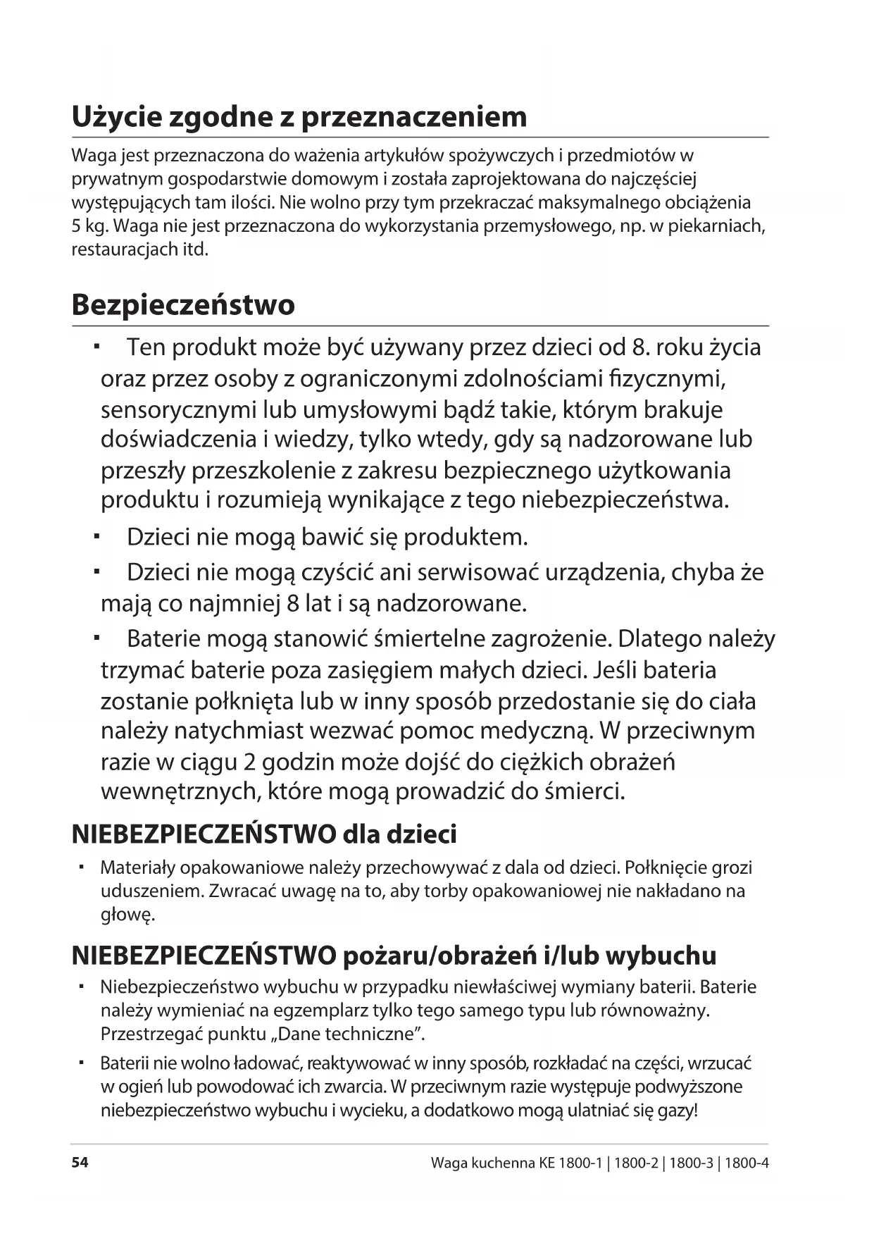 Waga kuchenna KE 1800-1 | 1800-2 | 1800-3 | 1800-4 Użycie zgodne z przeznaczeniem Waga jest przeznaczona do ważenia artykułów spożywczych i przedmiotów w prywatnym gospodarstwie domowym i została zaprojektowana do najczęściej występujących tam ilości. Nie wolno przy tym przekraczać maksymalnego obciążenia 5 kg. Waga nie jest przeznaczona do wykorzystania przemysłowego, np. w piekarniach, restauracjach itd. Bezpieczeństwo Ten produkt może być używany przez dzieci od 8. roku życia oraz przez osoby z ograniczonymi zdolnościami zycznymi, sensorycznymi lub umysłowymi bądź takie, którym brakuje doświadczenia i wiedzy, tylko wtedy, gdy są nadzorowane lub przeszły przeszkolenie z zakresu bezpiecznego użytkowania produktu i rozumieją wynikające z tego niebezpieczeństwa. Dzieci nie mogą bawić się produktem. Dzieci nie mogą czyścić ani serwisować urządzenia, chyba że mają co najmniej 8 lat i są nadzorowane. Baterie mogą stanowić śmiertelne zagrożenie. Dlatego należy trzymać baterie poza zasięgiem małych dzieci. Jeśli bateria zostanie połknięta lub w inny sposób przedostanie się do ciała należy natychmiast wezwać pomoc medyczną. W przeciwnym razie w ciągu 2 godzin może dojść do ciężkich obrażeń wewnętrznych, które mogą prowadzić do śmierci. NIEBEZPIECZEŃSTWO dla dzieci Materiały opakowaniowe należy przechowywać z dala od dzieci. Połknięcie grozi uduszeniem. Zwracać uwagę na to, aby torby opakowaniowej nie nakładano na głowę. NIEBEZPIECZEŃSTWO pożaru/obrażeń i/lub wybuchu Niebezpieczeństwo wybuchu w przypadku niewłaściwej wymiany baterii. Baterie należy wymieniać na egzemplarz tylko tego samego typu lub równoważny. Przestrzegać punktu „Dane techniczne”. Baterii nie wolno ładować, reaktywować w inny sposób, rozkładać na części, wrzucać w ogień lub powodować ich zwarcia. W przeciwnym razie występuje podwyższone niebezpieczeństwo wybuchu i wycieku, a dodatkowo mogą ulatniać się gazy!Bezpieczeństwo
