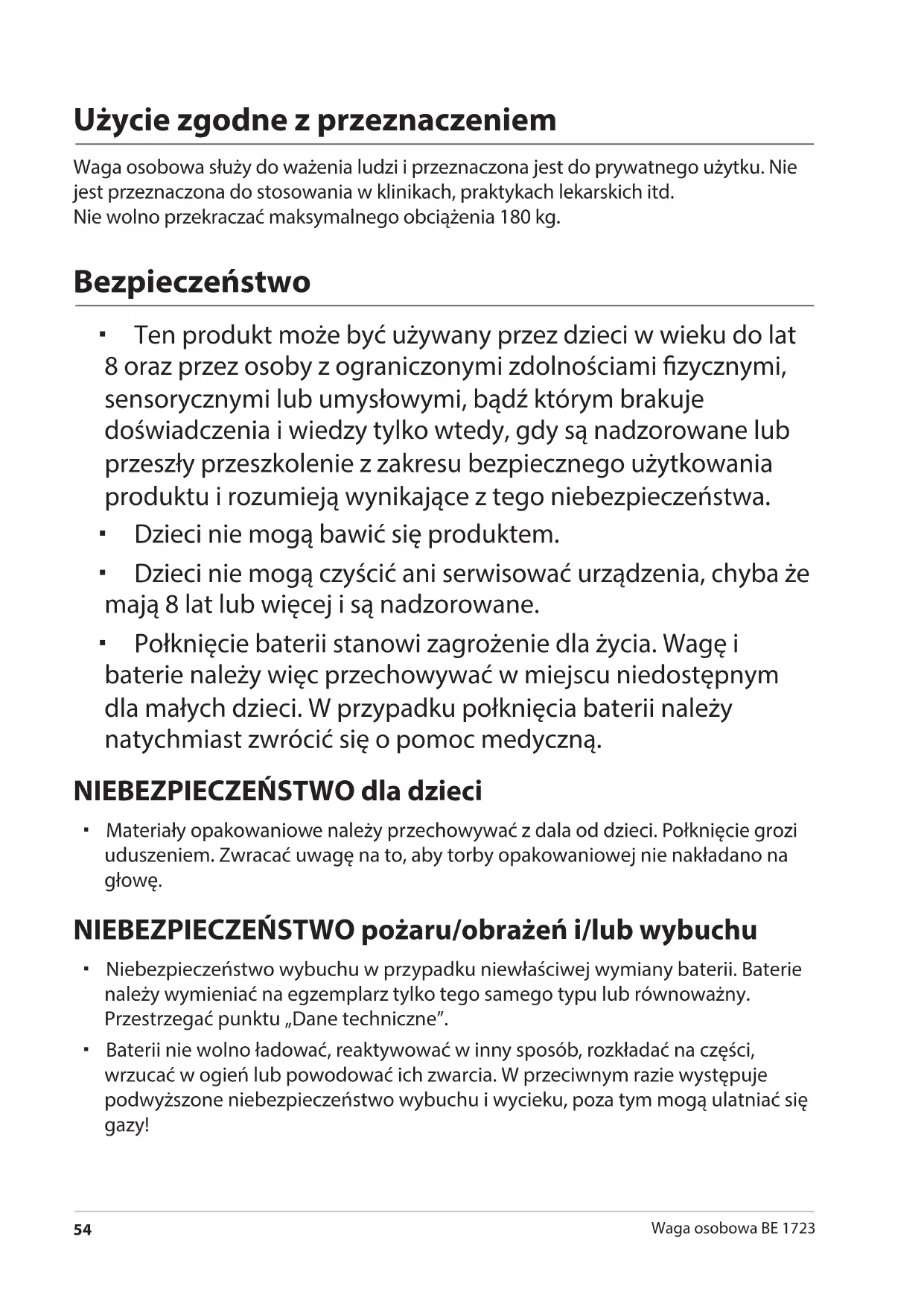 Waga osobowa BE 1723 Użycie zgodne z przeznaczeniem Waga osobowa służy do ważenia ludzi i przeznaczona jest do prywatnego użytku. Nie jest przeznaczona do stosowania w klinikach, praktykach lekarskich itd. Nie wolno przekraczać maksymalnego obciążenia 180 kg. Bezpieczeństwo Ten produkt może być używany przez dzieci w wieku do lat 8oraz przez osoby z ograniczonymi zdolnościami zycznymi, sensorycznymi lub umysłowymi, bądź którym brakuje doświadczenia i wiedzy tylko wtedy, gdy są nadzorowane lub przeszły przeszkolenie z zakresu bezpiecznego użytkowania produktu i rozumieją wynikające z tego niebezpieczeństwa. Dzieci nie mogą bawić się produktem. Dzieci nie mogą czyścić ani serwisować urządzenia, chyba że mają 8 lat lub więcej i są nadzorowane. Połknięcie baterii stanowi zagrożenie dla życia. Wagę i baterie należy więc przechowywać w miejscu niedostępnym dla małych dzieci. W przypadku połknięcia baterii należy natychmiast zwrócić się o pomoc medyczną. NIEBEZPIECZEŃSTWO dla dzieci Materiały opakowaniowe należy przechowywać z dala od dzieci. Połknięcie grozi uduszeniem. Zwracać uwagę na to, aby torby opakowaniowej nie nakładano na głowę. NIEBEZPIECZEŃSTWO pożaru/obrażeń i/lub wybuchu Niebezpieczeństwo wybuchu w przypadku niewłaściwej wymiany baterii. Baterie należy wymieniać na egzemplarz tylko tego samego typu lub równoważny. Przestrzegać punktu „Dane techniczne”. Baterii nie wolno ładować, reaktywować w inny sposób, rozkładać na części, wrzucać w ogień lub powodować ich zwarcia. W przeciwnym razie występuje podwyższone niebezpieczeństwo wybuchu i wycieku, poza tym mogą ulatniać się gazy! Koerperwaage BE 1723.indb 54 15.01.2018 10:17:15Bezpieczeństwo