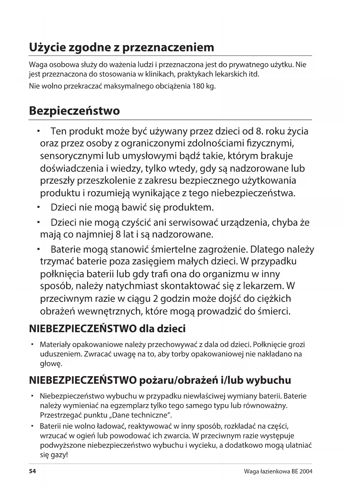 Waga łazienkowa BE 2004 Użycie zgodne z przeznaczeniem Waga osobowa służy do ważenia ludzi i przeznaczona jest do prywatnego użytku. Nie jest przeznaczona do stosowania w klinikach, praktykach lekarskich itd. Nie wolno przekraczać maksymalnego obciążenia 180 kg. Bezpieczeństwo Ten produkt może być używany przez dzieci od 8. roku życia oraz przez osoby z ograniczonymi zdolnościami zycznymi, sensorycznymi lub umysłowymi bądź takie, którym brakuje doświadczenia i wiedzy, tylko wtedy, gdy są nadzorowane lub przeszły przeszkolenie z zakresu bezpiecznego użytkowania produktu i rozumieją wynikające z tego niebezpieczeństwa. Dzieci nie mogą bawić się produktem. Dzieci nie mogą czyścić ani serwisować urządzenia, chyba że mają co najmniej 8lat i są nadzorowane. Baterie mogą stanowić śmiertelne zagrożenie. Dlatego należy trzymać baterie poza zasięgiem małych dzieci. W przypadku połknięcia baterii lub gdy tra ona do organizmu w inny sposób, należy natychmiast skontaktować się z lekarzem. W przeciwnym razie w ciągu 2godzin może dojść do ciężkich obrażeń wewnętrznych, które mogą prowadzić do śmierci. NIEBEZPIECZEŃSTWO dla dzieci Materiały opakowaniowe należy przechowywać z dala od dzieci. Połknięcie grozi uduszeniem. Zwracać uwagę na to, aby torby opakowaniowej nie nakładano na głowę. NIEBEZPIECZEŃSTWO pożaru/obrażeń i/lub wybuchu Niebezpieczeństwo wybuchu w przypadku niewłaściwej wymiany baterii. Baterie należy wymieniać na egzemplarz tylko tego samego typu lub równoważny. Przestrzegać punktu „Dane techniczne”. Baterii nie wolno ładować, reaktywować w inny sposób, rozkładać na części, wrzucać w ogień lub powodować ich zwarcia. W przeciwnym razie występuje podwyższone niebezpieczeństwo wybuchu i wycieku, a dodatkowo mogą ulatniać się gazy!Bezpieczeństwo