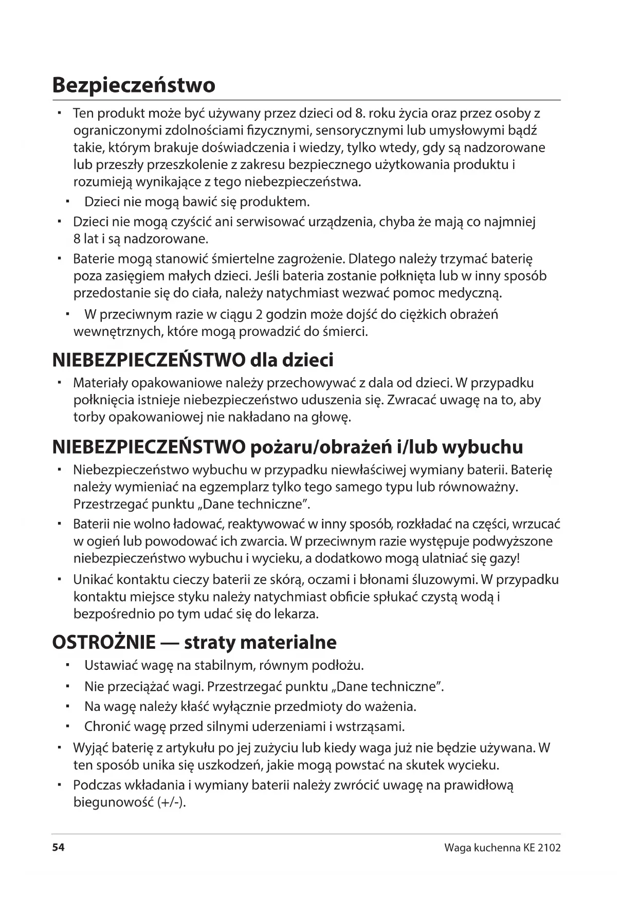 Waga kuchenna KE 2102 Bezpieczeństwo Ten produkt może być używany przez dzieci od 8. roku życia oraz przez osoby z ograniczonymi zdolnościami zycznymi, sensorycznymi lub umysłowymi bądź takie, którym brakuje doświadczenia i wiedzy, tylko wtedy, gdy są nadzorowane lub przeszły przeszkolenie z zakresu bezpiecznego użytkowania produktu i rozumieją wynikające z tego niebezpieczeństwa. Dzieci nie mogą bawić się produktem. Dzieci nie mogą czyścić ani serwisować urządzenia, chyba że mają co najmniej 8lat i są nadzorowane. Baterie mogą stanowić śmiertelne zagrożenie. Dlatego należy trzymać baterię poza zasięgiem małych dzieci. Jeśli bateria zostanie połknięta lub w inny sposób przedostanie się do ciała, należy natychmiast wezwać pomoc medyczną. W przeciwnym razie w ciągu 2godzin może dojść do ciężkich obrażeń wewnętrznych, które mogą prowadzić do śmierci. NIEBEZPIECZEŃSTWO dla dzieci Materiały opakowaniowe należy przechowywać z dala od dzieci. W przypadku połknięcia istnieje niebezpieczeństwo uduszenia się. Zwracać uwagę na to, aby torby opakowaniowej nie nakładano na głowę. NIEBEZPIECZEŃSTWO pożaru/obrażeń i/lub wybuchu Niebezpieczeństwo wybuchu w przypadku niewłaściwej wymiany baterii. Baterię należy wymieniać na egzemplarz tylko tego samego typu lub równoważny. Przestrzegać punktu „Dane techniczne”. Baterii nie wolno ładować, reaktywować w inny sposób, rozkładać na części, wrzucać w ogień lub powodować ich zwarcia. W przeciwnym razie występuje podwyższone niebezpieczeństwo wybuchu i wycieku, a dodatkowo mogą ulatniać się gazy! Unikać kontaktu cieczy baterii ze skórą, oczami i błonami śluzowymi. W przypadku kontaktu miejsce styku należy natychmiast obcie spłukać czystą wodą i bezpośrednio po tym udać się do lekarza. OSTROŻNIE — straty materialne Ustawiać wagę na stabilnym, równym podłożu. Nie przeciążać wagi. Przestrzegać punktu „Dane techniczne”. Na wagę należy kłaść wyłącznie przedmioty do ważenia. Chronić wagę przed silnymi uderzeniami i wstrząsami. Wyjąć baterię z artykułu po jej zużyciu lub kiedy waga już nie będzie używana. W ten sposób unika się uszkodzeń, jakie mogą powstać na skutek wycieku. Podczas wkładania i wymiany baterii należy zwrócić uwagę na prawidłową biegunowość(+/-).Użycie zgodne z przeznaczeniem