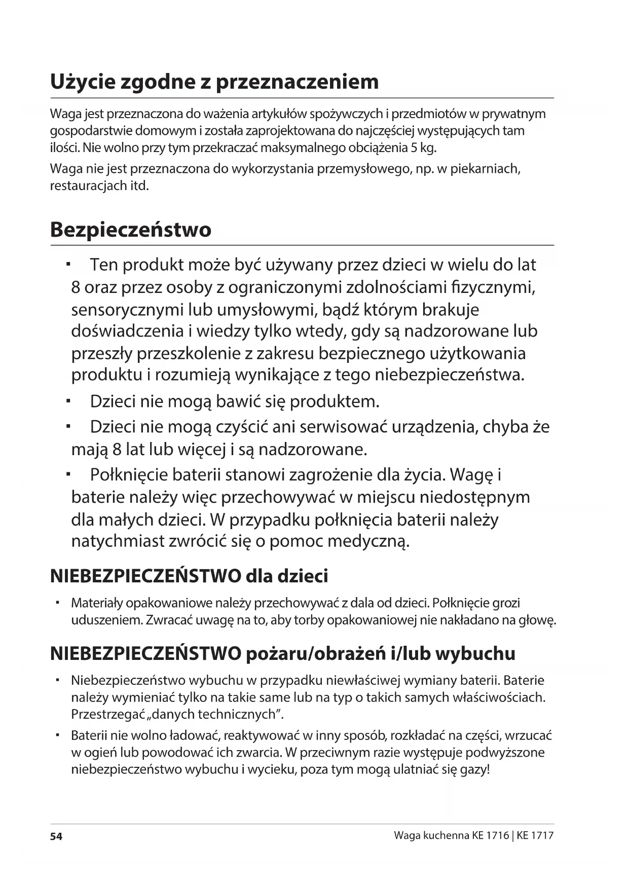 Waga kuchenna KE 1716 | KE 1717 Użycie zgodne z przeznaczeniem Waga jest przeznaczona do ważenia artykułów spożywczych i przedmiotów w prywatnym gospodarstwie domowym i została zaprojektowana do najczęściej występujących tam ilości. Nie wolno przy tym przekraczać maksymalnego obciążenia 5 kg. Waga nie jest przeznaczona do wykorzystania przemysłowego, np. w piekarniach, restauracjach itd. Bezpieczeństwo Ten produkt może być używany przez dzieci w wielu do lat 8oraz przez osoby z ograniczonymi zdolnościami zycznymi, sensorycznymi lub umysłowymi, bądź którym brakuje doświadczenia i wiedzy tylko wtedy, gdy są nadzorowane lub przeszły przeszkolenie z zakresu bezpiecznego użytkowania produktu i rozumieją wynikające z tego niebezpieczeństwa. Dzieci nie mogą bawić się produktem. Dzieci nie mogą czyścić ani serwisować urządzenia, chyba że mają 8 lat lub więcej i są nadzorowane. Połknięcie baterii stanowi zagrożenie dla życia. Wagę i baterie należy więc przechowywać w miejscu niedostępnym dla małych dzieci. W przypadku połknięcia baterii należy natychmiast zwrócić się o pomoc medyczną. NIEBEZPIECZEŃSTWO dla dzieci Materiały opakowaniowe należy przechowywać z dala od dzieci. Połknięcie grozi uduszeniem. Zwracać uwagę na to, aby torby opakowaniowej nie nakładano na głowę. NIEBEZPIECZEŃSTWO pożaru/obrażeń i/lub wybuchu Niebezpieczeństwo wybuchu w przypadku niewłaściwej wymiany baterii. Baterie należy wymieniać tylko na takie same lub na typ o takich samych właściwościach. Przestrzegać „danych technicznych”. Baterii nie wolno ładować, reaktywować w inny sposób, rozkładać na części, wrzucać w ogień lub powodować ich zwarcia. W przeciwnym razie występuje podwyższone niebezpieczeństwo wybuchu i wycieku, poza tym mogą ulatniać się gazy! Druckbuch SHIRIN THELMA.indb 54 18.05.2017 10:57:08Bezpieczeństwo