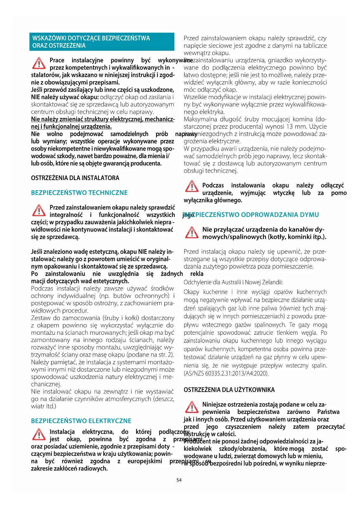 czącymibezpieczeństwawkrajuużytkowania;powin- na być również zgodna z europejskimi przepisami w zakresiezakłóceńradiowych. Przed zainstalowaniem okapu należy sprawdzić, czy napięcie sieciowe jest zgodne z danymi na tabliczce wewnątrz okapu. Po zainstalowaniu urządzenia, gniazdko wykorzysty- wane do podłączenia elektrycznego powinno być łatwo dostępne; jeśli nie jest to możliwe, należy prze- widzieć wyłącznik główny, aby w razie konieczności móc odłączyć okap. Wszelkie modykacje w instalacji elektrycznej powin- ny być wykonywane wyłącznie przez wykwalikowa- nego elektryka. Maksymalna długość śruby mocującej komina (do- starczonej przez producenta) wynosi 13 mm. Użycie śrub niezgodnych z instrukcją może powodować za- grożenia elektryczne. W przypadku awarii urządzenia, nie należy podejmo- wać samodzielnych prób jego naprawy, lecz skontak- tować się z dostawcą lub autoryzowanym centrum obsługi technicznej. Podczas instalowania okapu należy odłączyć urządzenie, wyjmując wtyczkę lub za pomocą wyłącznikagłównego. BEZPIECZEŃSTWOODPROWADZANIADYMU Nieprzyłączaćurządzeniadokanałówdy- mowych/spalinowych(kotły,kominkiitp.). Przed instalacją okapu należy się upewnić, że prze- strzegane są wszystkie przepisy dotyczące odprowa- dzania zużytego powietrza poza pomieszczenie. Odchylenie dla Australii i Nowej Zelandii: Okapy kuchenne i inne wyciągi oparów kuchennych mogą negatywnie wpływać na bezpieczne działanie urzą