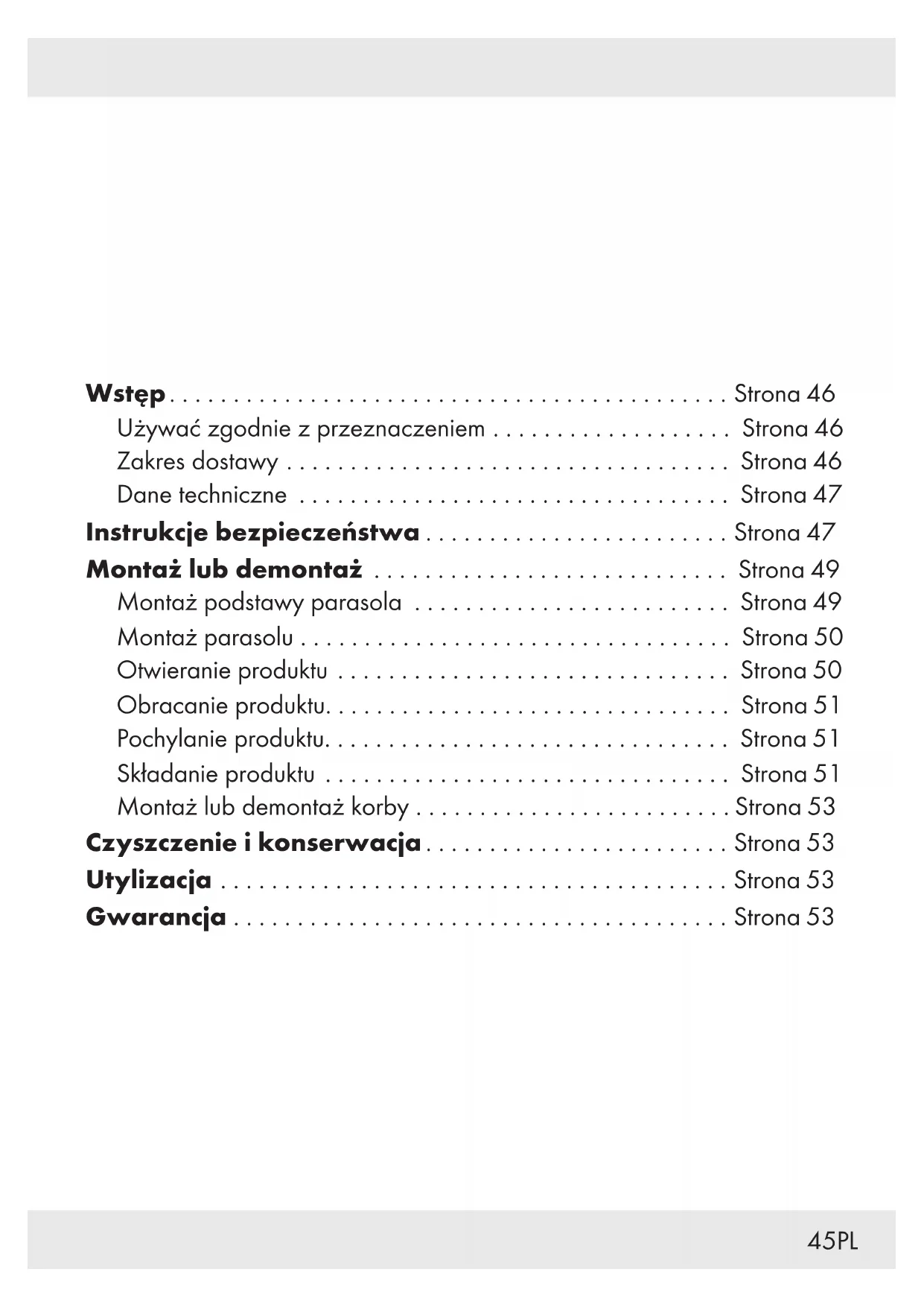 Czyszczenie i konserwacja Produkt należy czyścić lekko zwilżoną, niestrzępiącą się ściereczką. W okresie zimowym produkt należy przechowywać w chłodnym i suchym miejscu. Unikać przechowywania produktu w ogrzewanym pomieszczeniu. Utylizacja Opakowanie wykonane jest z materiałów przyjaznych dla środowiska, które można przekazać do utylizacji w lokalnym punkcie przetwarzania surowców wtórnych. Informacji na temat możliwości utylizacji wyeksploatowanego produktu udziela urząd gminy lub miasta. Gwarancja Produkt wyprodukowano według wysokich standardów jakości i poddano skrupulatnej kontroli przed wysyłką. W przypadku wad produktu nabywcy przysługują ustawowe prawa. Gwarancja nie ogranicza ustawowych praw nabywcy produktu. Produkt objęte jest 3 gwarancją, licząc od daty zakupu. Gwarancja wygasa w razie zawinionego przez użytkownika uszkodzenia produktu, niewłaściwego użycia lub konserwacji. W przypadku wystąpienia w ciągu 3 lat od daty zakupu wad materiałowych lub fabrycznych, dokonujemy – według własnej oceny – bezpłatnej naprawy lub wymiany produktu.54 PL Świadczenie gwarancyjne obejmuje wady materiałowe i fabryczne. Gwarancja nie obejmuje części produktu ulegających normalnemu zużyciu, uznawanych za części zużywalne (np. baterie) oraz uszkodzeń części łamliwych, np. przełączników, akumulatorów lub wykonanych ze szkła. Zgodnie z Kodeksem Cywilnym art. 581 §1 wraz z wymianą urządzenia lub ważnej części czas gwarancji rozpoczyna się na nowo. Sposób postępowania w przypadku naprawy gwarancyjnej Aby zapewnić szybkie rozpatrzenie Państwa wniosku, prosimy stosować się do następujących wskazówek: Przed skontaktowaniem się z działem serwisowym należy przygotować paragon i numer artykułu (IAN 384195_2107) jako dowód zakupu. Numery artykułów można znaleźć na tabliczce znamionowe, na grawerunku, na stronie tytułowej jego instrukcji (na dole po lewej stronie) lub jako naklejkę na stronie odwrotnej lub spodniej. W razie wystąpienia błędów w działaniu lub innych wad, należy skontaktować się najpierw z wymienionym poniżej działem serwisowym telefonicznie lub pocztą elektroniczną. Produkt uznany za uszkodzony można następnie z dołączeniem dowodu zakupu (paragonu) i podaniem, na czym polega wada i kiedy wystąpiła, przesłać bezpłatnie na podany Państwu adres serwisu. Serwis Serwis Polska Tel.: 008004911946 E-Mail: owim@lidl.pl55CZ Úvod............................................. Strana 56 Použití v souladu s určením .......................... Strana 56 Rozsah dodávky................................... Strana 56 Technické údaje . . . . . . . . . . . . . . . . . . . . . . . . . . . . . . . . . . . Strana 57 Bezpečnostní pokyny ............................. Strana 57 Montáž/Demontáž ............................... Strana 59 Deskový stojan na slunečník.......................... Strana 59 Instalace stínítka ................................... Strana 60 Otevřete výrobek .................................. Strana 60 Otočení výrobku................................... Strana 61 Náklon výrobku ................................... Strana 61 Uzavření výrobku .................................. Strana 61 Upevnění/odejmutí kliky ............................ Strana 63 Čištění a péče..................................... Strana 63 Zlikvidování...................................... Strana 63 Záruka........................................... Strana 6356 CZ