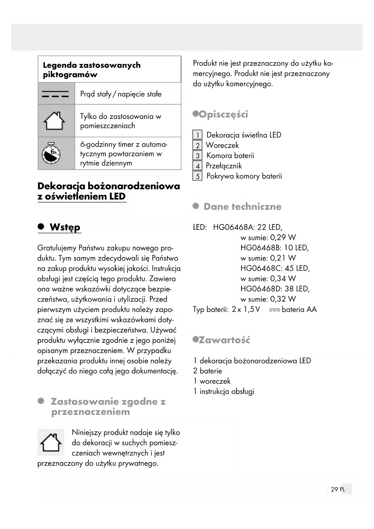 Pokrywa komory baterii Dane techniczne LED: HG06468A: 22 LED, w sumie: 0,29 W HG06468B: 10 LED, w sumie: 0,21 W HG06468C: 45 LED, w sumie: 0,34 W HG06468D: 38 LED, w sumie: 0,32 W Typ baterii: 2 x 1,5 V bateria AA Zawartość 1 dekoracja bożonarodzeniowa LED 2 baterie 1 woreczek 1 instrukcja obsługi30 PL Wskazówki bezpieczeństwa