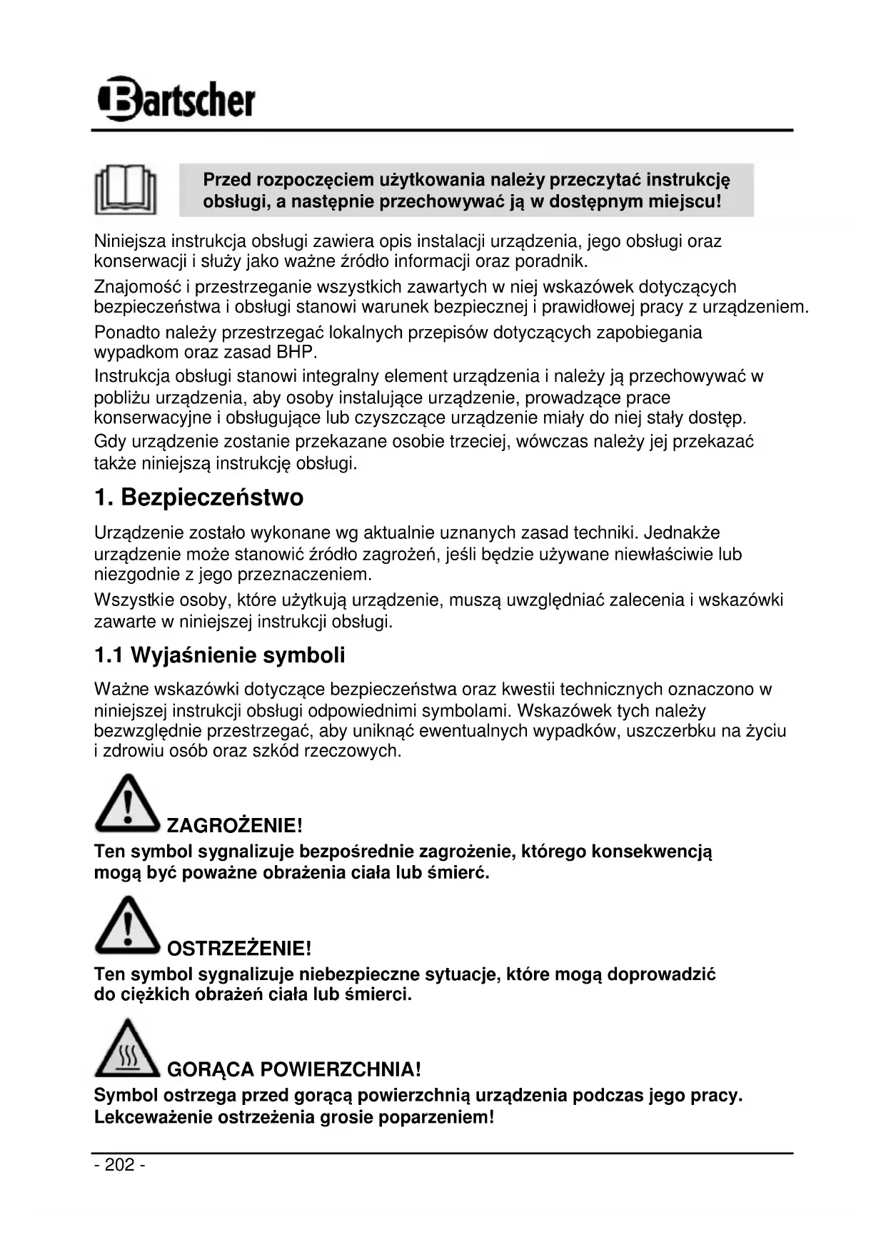 Ważne wskazówki dotyczące bezpieczeństwa oraz kwestii technicznych oznaczono w niniejszej instrukcji obsługi odpowiednimi symbolami. Wskazówek tych należy bezwzględnie przestrzegać, aby uniknąć ewentualnych wypadków, uszczerbku na życiu i zdrowiu osób oraz szkód rzeczowych. ZAGROŻENIE! Ten symbol sygnalizuje bezpośrednie zagrożenie, którego konsekwencją mogą być poważne obrażenia ciała lub śmierć. OSTRZEŻENIE! Ten symbol sygnalizuje niebezpieczne sytuacje, które mogą doprowadzić do ciężkich obrażeń ciała lub śmierci. GORĄCA POWIERZCHNIA! Symbol ostrzega przed gorącą powierzchnią urządzenia podczas jego pracy. Lekceważenie ostrzeżenia grosie poparzeniem!- 203 - OSTROŻNIE! Ten symbol sygnalizuje możliwość zaistnienia niebezpiecznych sytuacji, które mogą doprowadzić do lekkich obrażeń lub uszkodzenia, wadliwego działania i/lub zniszczenia urządzenia. OSTROŻNIE! Pole magnetyczne! Ten symbol informuje, że pola magnetyczne powstające podczas pracy urządzenia mogą powodować zakłócenia. WSKAZÓWKA! Symbol ten oznacza rady i informacje, których należy przestrzegać, aby obsługa urządzenia stała się efektywna i bezusterkowa.