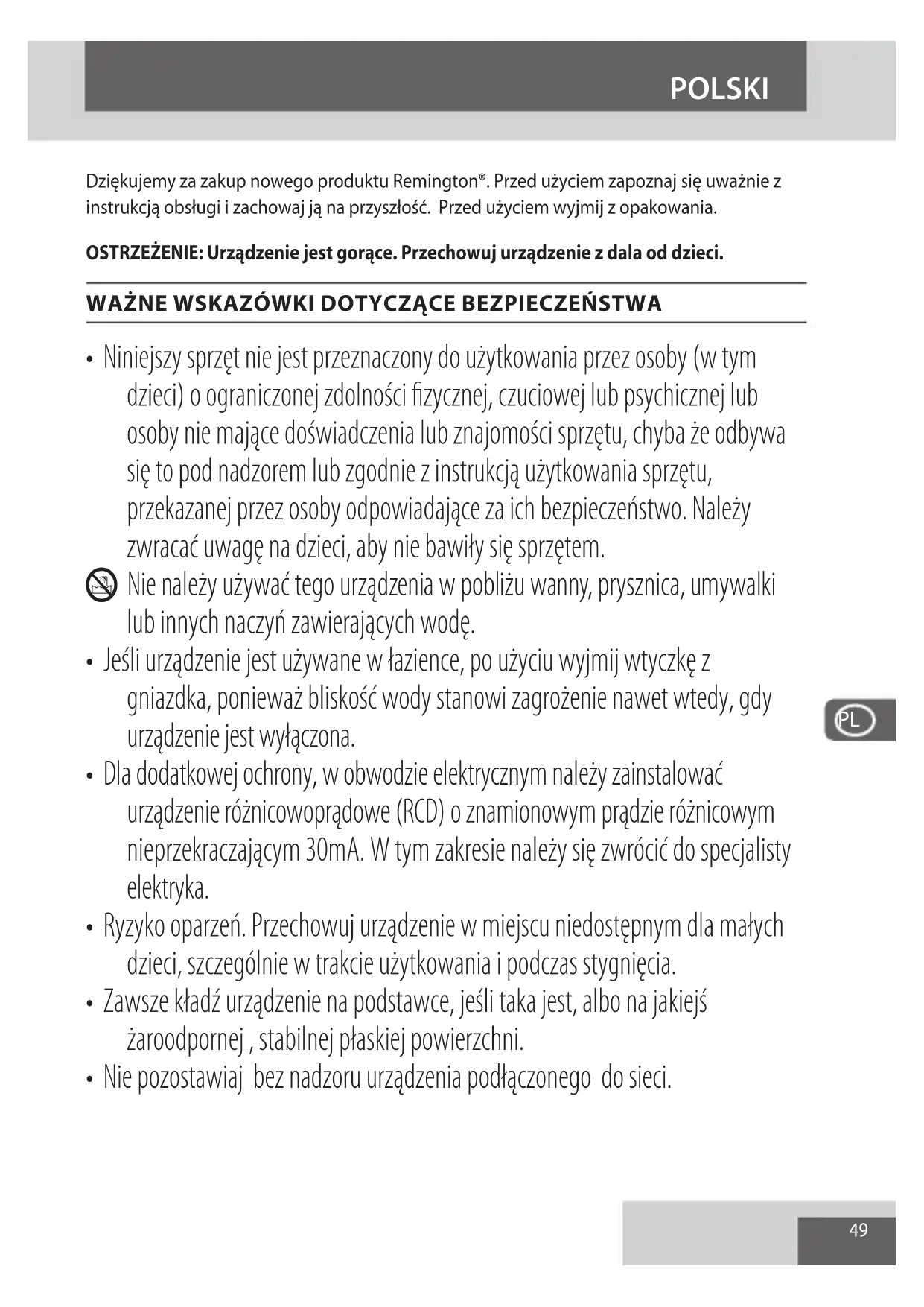 Aby uniknąć problemów środowiskowych i zdrowotnych spowodowanych niebezpiecznymi substancjami, sprzętu, akumulatorów i baterii oznaczonych jednym z tych symboli nie należy wyrzucać z nieposortowanymi odpadami komunalnymi. Produkty elektryczne i elektroniczne, w tym, baterie jednorazowe i akumulatory, należy zawsze utylizować w odpowiednim publicznym punkcie zbiórki odpadów/recyklingu. POLSKI53 MAGYAR Köszönjük, hogy ezt az új Remington® terméket választotta. Kérjük, olvassa el és őrizze meg a jelen utasítást. Használat előtt távolítsa el a csomagolóanyagokat. FIGYELMEZTETÉS: A készülék forró. Gyermekek elől mindig elzárva tartandó.