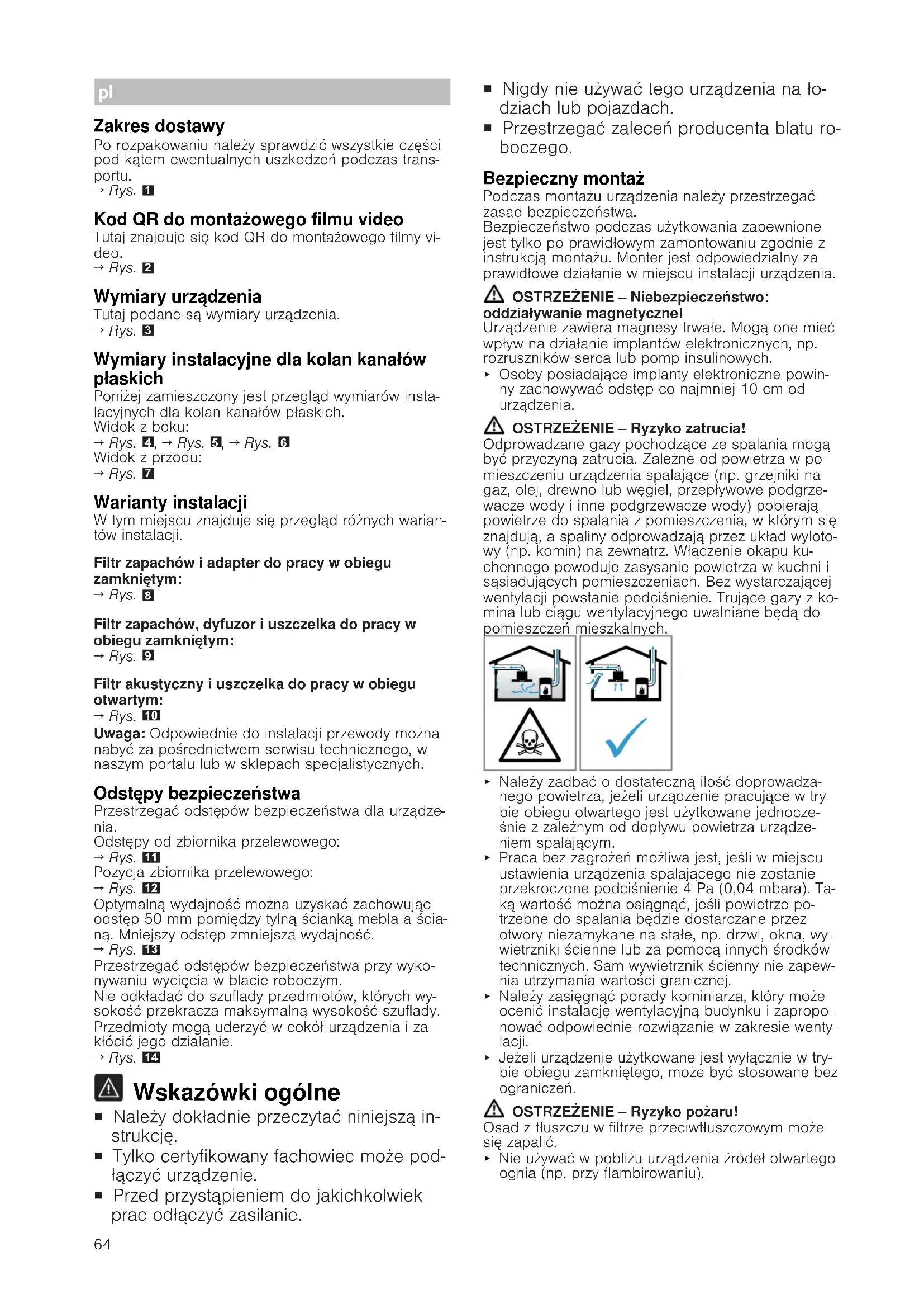 Wskazówki ogólne ¡ Należy dokładnie przeczytać niniejszą in- strukcję. ¡ Tylko certyfikowany fachowiec może pod- łączyć urządzenie. ¡ Przed przystąpieniem do jakichkolwiek prac odłączyć zasilanie. ¡ Nigdy nie używać tego urządzenia na ło- dziach lub pojazdach. ¡ Przestrzegać zaleceń producenta blatu ro- boczego. Bezpieczny montaż Podczas montażu urządzenia należy przestrzegać zasad bezpieczeństwa. Bezpieczeństwo podczas użytkowania zapewnione jest tylko po prawidłowym zamontowaniu zgodnie z instrukcją montażu. Monter jest odpowiedzialny za prawidłowe działanie w miejscu instalacji urządzenia. OSTRZEŻENIE‒Niebezpieczeństwo: oddziaływanie magnetyczne! Urządzenie zawiera magnesy trwałe. Mogą one mieć wpływ na działanie implantów elektronicznych, np. rozruszników serca lub pomp insulinowych. ▶ Osoby posiadające implanty elektroniczne powin- ny zachowywać odstęp co najmniej 10cm od urządzenia. OSTRZEŻENIE‒Ryzyko zatrucia! Odprowadzane gazy pochodzące ze spalania mogą być przyczyną zatrucia. Zależne od powietrza w po- mieszczeniu urządzenia spalające (np. grzejniki na gaz, olej, drewno lub węgiel, przepływowe podgrze- wacze wody i inne podgrzewacze wody) pobierają powietrze do spalania z pomieszczenia, w którym się znajdują, a spaliny odprowadzają przez układ wyloto- wy (np. komin) na zewnątrz. Włączenie okapu ku- chennego powoduje zasysanie powietrza w kuchni i sąsiadujących pomieszczeniach. Bez wystarczającej wentylacji powstanie podciśnienie. Trujące gazy z ko- mina lub ciągu wentylacyjnego uwalniane będą do pomieszczeń mieszkalnych. ▶ Należy zadbać o dostateczną ilość doprowadza- nego powietrza, jeżeli urządzenie pracujące w try- bie obiegu otwartego jest użytkowane jednocze- śnie z zależnym od dopływu powietrza urządze- niem spalającym. ▶ Praca bez zagrożeń możliwa jest, jeśli w miejscu ustawienia urządzenia spalającego nie zostanie przekroczone podciśnienie 4 Pa (0,04 mbara). Ta- ką wartość można osiągnąć, jeśli powietrze po- trzebne do spalania będzie dostarczane przez otwory niezamykane na stałe, np. drzwi, okna, wy- wietrzniki ścienne lub za pomocą innych środków technicznych. Sam wywietrznik ścienny nie zapew- nia utrzymania wartości granicznej. ▶ Należy zasięgnąć porady kominiarza, który może ocenić instalację wentylacyjną budynku i zapropo- nować odpowiednie rozwiązanie w zakresie wenty- lacji. ▶ Jeżeli urządzenie użytkowane jest wyłącznie w try- bie obiegu zamkniętego, może być stosowane bez ograniczeń. OSTRZEŻENIE‒Ryzyko pożaru! Osad z tłuszczu w filtrze przeciwtłuszczowym może się zapalić. ▶ Nie używać w pobliżu urządzenia źródeł otwartego ognia (np. przy flambirowaniu).65 ▶ Urządzenie można zainstalować w pobliżu pieca opalanego paliwem stałym (np. drewnem lub wę- glem) tylko wtedy, gdy występuje zamknięta, za- mocowana na stałe osłona ochronna. Nie może dochodzić do iskrzenia. OSTRZEŻENIE‒Ryzyko odniesienia obrażeń! Wszelkie zmiany i modyfikacje w zakresie układu elektrycznego lub konstrukcji mechanicznej są nie- bezpieczne i mogą być przyczyną nieprawidłowego działania urządzenia. ▶ Nie dokonywać żadnych zmian w zakresie układu elektrycznego lub konstrukcji mechanicznej. Części, które są dostępne podczas montażu, mogą mieć ostre krawędzie i powodować skaleczenia. ▶ Nosić rękawice ochronne Urządzenie jest ciężkie. ▶ Do przenoszenia urządzenia potrzebne są 2 oso- by. ▶ Używać wyłącznie odpowiednich narzędzi pomoc- niczych. OSTRZEŻENIE‒Ryzyko uduszenia się! Dzieci mogą sobie naciągnąć materiały opakowania na głowę lub zawinąć się w nie i udusić się. ▶ Materiały z opakowania należy trzymać poza za- sięgiem dzieci. ▶ Nie pozwalać dzieciom na zabawę opakowaniem, aszczególnie folią. OSTRZEŻENIE‒Ryzyko zatrucia! Zasysane z powrotem gazy spalinowe mogą prowa- dzić do zatruć. ▶ Nie odprowadzać powietrza wylotowego do pracu- jącego komina dymowego lub komina spalinowe- go. ▶ Nie odprowadzać powietrza wylotowego do szybu, który służy do odpowietrzania pomieszczeń komin- kami. ▶ Jeżeli powietrze wylotowe ma być odprowadzane do komina dymowego lub komina spalinowego, który nie pracuje, trzeba mieć na to zgodę od od- powiedniego mistrza kominiarskiego. Odprowadzane gazy pochodzące ze spalania mogą być przyczyną zatrucia. ▶ Jeżeli okap kuchenny jest zainstalowany z komin- kiem zależnym od powietrza w pomieszczeniu, za- silanie elektryczne okapu kuchennego musi być wyposażone w odpowiedni obwód zabezpieczają- cy. Wskazówki dotyczące przyłącza elektrycznego Aby móc bezpiecznie podłączyć urządzenie do sieci elektrycznej, należy przestrzegać poniższych wskazó- wek. OSTRZEŻENIE‒Ryzyko porażenia prądem! Odłączenie urządzenia od zasilania musi być możli- we w każdej chwili. Urządzenie można podłączyć wy- łącznie do gniazda zainstalowanego zgodnie z prze- pisami. ▶ Jeśli nie jest to możliwe, w stałej instalacji elek- trycznej należy zamontować rozłącznik wielobiegu- nowy zgodnie z warunkami kategorii przepięciowej III i przepisami instalacyjnymi. ▶ Jedynie osoba z uprawnieniami elektryka może wykonać stałą instalację elektryczną. Zalecamy za- instalowanie wyłącznika różnicowo-prądowego (wyłącznik RP) w obwodzie elektrycznym zasilania urządzenia. ¡ Nie zaginać ani nie zaciskać przewodu przyłącze- niowego i trzymać go z dala od ostrych krawędzi. ¡ Ułożyć kabel przyłączeniowy tak, aby nie dotykał gorącej obudowy urządzenia. ¡ Używać wyłącznie przewodu przyłączeniowego do- starczonego wraz z urządzeniem lub przewodu do- starczonego przez serwisanta. ¡ To urządzenie spełnia wymogi zarządzeń WE w sprawie układów przeciwzakłóceniowych. ¡ Urządzenie odpowiada klasie ochrony 1. Dlatego może być użytkowane wyłącznie, jeśl