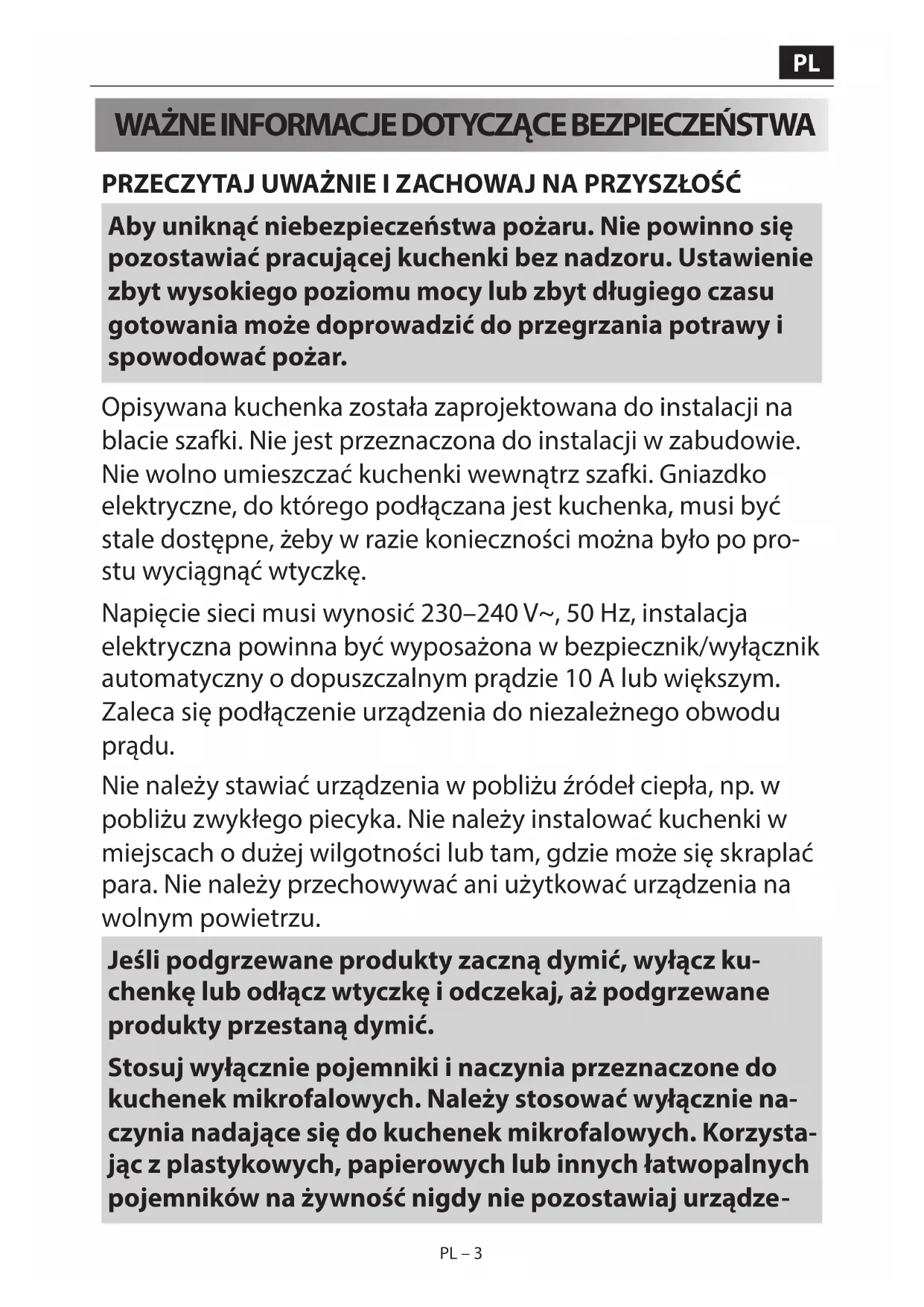 OSTRZEŻENIE: Nie należy stawiać urządzenia w pobliżu źródeł ciepła, w miejscach o dużej wilgotności (np. w pobliżu zwykłego piekarnika) lub w pobliżu palnych materiałów (np. zasłon). Nie należy blokować ani zasłaniać otworów wentylacyjnych. Nie należy ustawiać żadnych przedmiotów na obudowie urządzenia. Nie wolno dotykać zewnętrznych powierzchni kuchenki podczas pracy lub krótko po jej zakończeniu, ponieważ są gorące. PL – 13 PL – 13