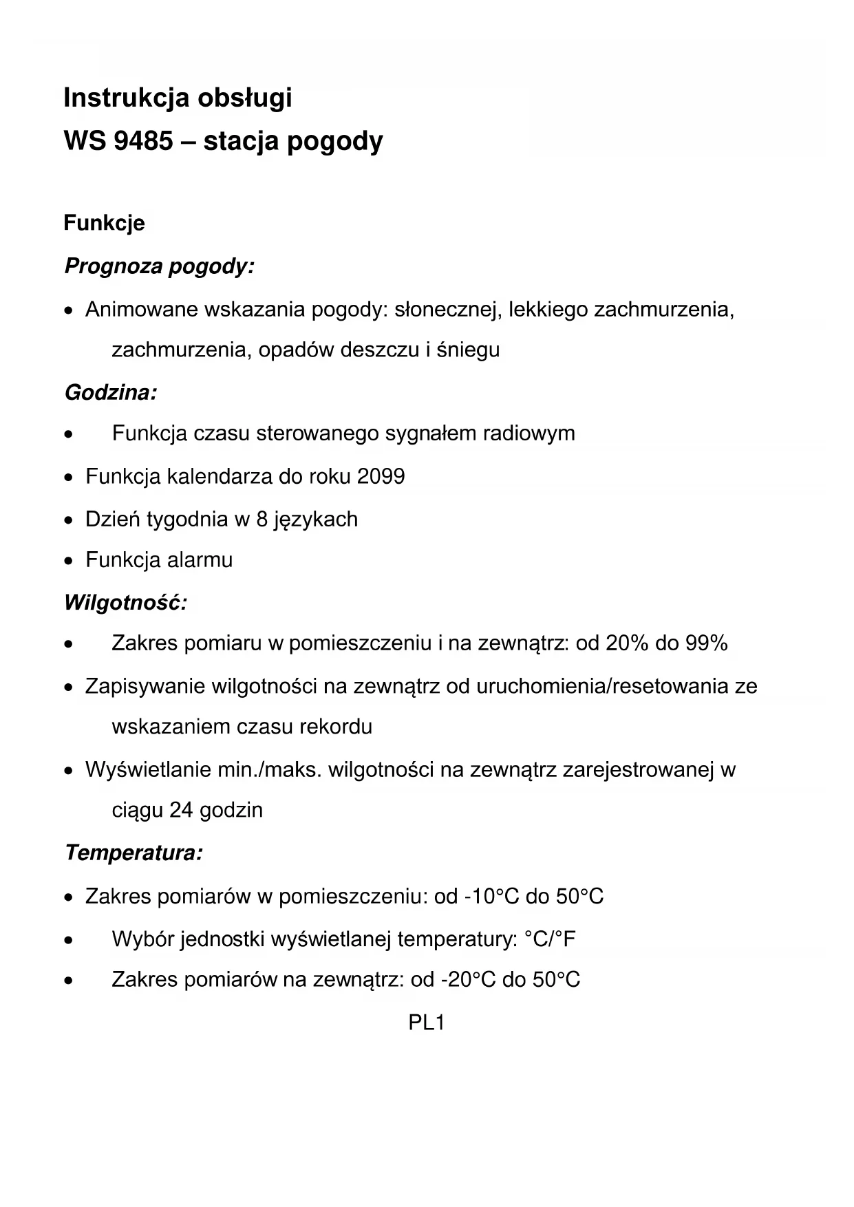 Tento symbol znamená, že po ukončení životnosti elektrického zařízení je nutno jej likvidovat odděleně od běžného domovního odpadu. Zařízení vraťte do místního sběrného místa nebo centra pro recyklaci. To platí pro všechny země Evropské unie a ostatní evropské země se samostatným systémem shromažďování odpadu.PL1 Instrukcja obsługi WS 9485 – stacja pogody Funkcje Prognoza pogody: Animowane wskazania pogody: słonecznej, lekkiego zachmurzenia, zachmurzenia, opadów deszczu i śniegu Godzina: Funkcja czasu sterowanego sygnałem radiowym Funkcja kalendarza do roku 2099 Dzień tygodnia w 8 językach Funkcja alarmu Wilgotność: Zakres pomiaru w pomieszczeniu i na zewnątrz: od 20% do 99% Zapisywanie wilgotności na zewnątrz od uruchomienia/resetowania ze wskazaniem czasu rekordu Wyświetlanie min./maks. wilgotności na zewnątrz zarejestrowanej w ciągu 24 godzin Temperatura: Zakres pomiarów w pomieszczeniu: od -10°C do 50°C Wybór jednostki wyświetlanej temperatury: °C/°F Zakres pomiarów na zewnątrz: od -20°C do 50°CPL2 Rejestracja temperatury na zewnątrz od uruchomienia/resetowania ze wskazaniem czasu rekordu Wyświetlanie min./maks. temperatury na zewnątrz zarejestrowanej w ciągu 24 godzin Czujnik zewnętrzny Wskaźnik niskiego stanu energii w bateriach dla czujnika temperatury na zewnątrz Montaż na ścianie lub ustawienie na stole W zestawie jeden bezprzewodowy czujnik temperatury Częstotliwość sygnału: 433 MHz Maksymalna moc transmisji: 8 dBm Zasięg transmisji: 60 metrów w otwartej przestrzeniPL3 Jednostka główna, informacje ogólne