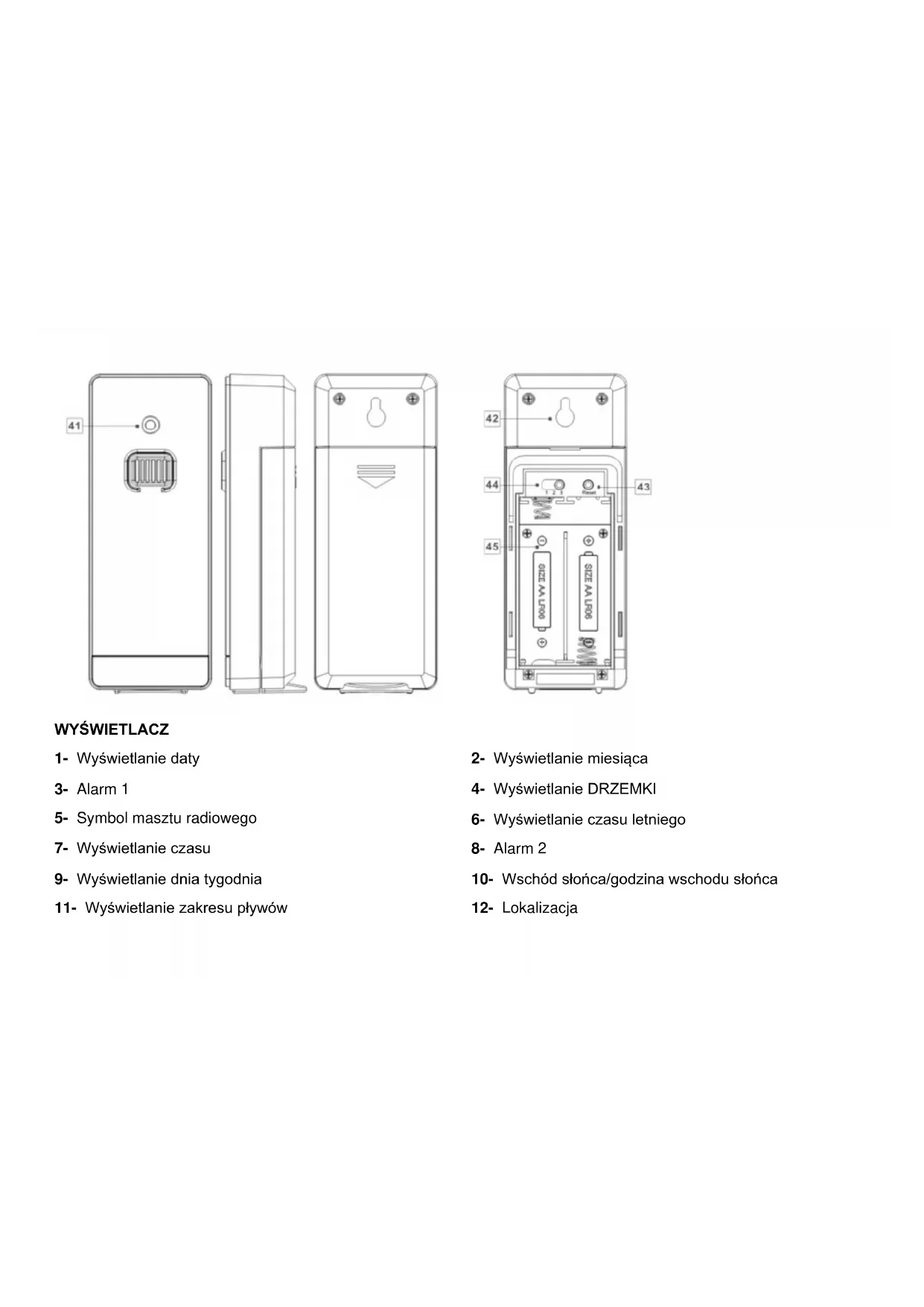 Dane techniczne Stacja pogodowa: Zakres pomiaru temperatury: od 0 do +50°C (od +32 do +122°F) Stopniowanie temperatury: 0.1°C Zakres pomiaru wilgotności: 20%–95% Stopniowanie wilgotności: 1% Sygnał radiowy: DCF Baterie: 2x AA, 1,5 V (prąd bezpośredni) Zakres ciśnienia powietrza: 850 - 1050 hPa Pasmo częstotliwości: od 433,050 do 434,790 MHz Czujnik zewnętrzny: Zakres pomiaru temperatury: od -20 do +65°C (od -4 do +149°F) Zakres pomiaru wilgotności: 20%–95% Stopniowanie wilgotności: 1% Sygnał przekazu RF: 433,92 MHzZakres przekazu RF: maks. 60 metrów (na otwartym terenie) Baterie: 2 x AA, 1,5 V (prąd bezpośredni) Przed użyciem Konfiguracja urządzeń Najpierw należy włożyć baterie w czujnik zewnętrzny. UWAGA!: Podczas wybierania miejsca ustawienia stacji pogodowej należy się upewnić, że nie będzie ona narażona na działanie bezpośredniego światła słonecznego, drgań, pyłu, wysokich temperatur, niskich temperatur lub wilgoci. Nie ustawiać urządzenia w pobliżu źródeł ciepła, np. grzejników. Może to spowodować jego uszkodzenie. Nie ustawiać urządzeń na powierzchniach wartościowych lub wrażliwych, jeżeli nie są one odpowiednio zabezpieczone. Może to spowodować jego uszkodzenie. Należy zapewnić, że sąsiednie urządzenia nie będą pracowały na tej samej częstotliwości 433 MHz. Takie urządzenia mogą spowodować zakłócenia połączenia radiowego. Nie ustawiać urządzeń obok płyt metalowych ani na nich. Może to ograniczyć jakość przesyłania fal radiowych. Nie montować urządzeń w budynkach wykonanych z żelbetu, np. na lotniskach, w wieżowcach, fabrykach lub piwnicach. Może to poważnie zakłócać przesyłanie fal radiowych między urządzeniami. Przygotowanie do użycia czujnika zewnętrznego Zdjąć osłonę komory baterii z tyłu czujnika zewnętrznego. Włożyć 2 baterie AA zgodnie z biegunowością (+/-). Czujnik zewnętrzny jest teraz gotowy do działania, dioda LED sterowania (41) zaświeci się na krótko. Zamknąć pokrywę komory baterii. Montaż czujnika zewnętrznego: Znaleźć odpowiednie miejsce na czujnik zewnętrzny. Uwaga: Upewnić się, że czujnik zewnętrzny jest montowany w promieniu 60 m (otwarty teren) od stacji pogodowej. Sprawdzić, czy nie ma przeszkód między czujnikiem zewnętrznym a stacją pogodową. Może to spowodować zakłócenia przesyłanych danych. Montaż na ścianie: Zawiesić czujnik zewnętrzny elementem montażowym (42) na jednej śrubie. Przygotowanie stacji pogodowej do użycia Otworzyć komorę baterii (40) z tyłu stacji pogodowej. Włożyć 2 baterie AA zgodnie z biegunowością (+/-). Następnie zamknąć komorę baterii. Po zdjęciu paska zabezpieczającego baterii stacja pogodowa rozpoczyna odbiór sygnału radiowego. Uwaga: Nie przesuwać stacji pogodowej, kiedy odbiera sygnał. Może to zakłócić odbiór.Łączenie stacji pogodowej z czujnikiem zewnętrznym i sygnałem radiowym DCF: Po włożeniu baterii stacja pogodowa próbuje nawiązać połączenie z czujnikiem zewnętrznym. Ten proces może potrwać kilka minut. Symbol będzie migał przez kilka minut. Po pomyślnym nawiązaniu połączenia z czujnikiem zewnętrznym symbol wybranego kanału (27) pojawia się na wyświetlaczu LC z kanałem czujnika zewnętrznego (w razie potrzeby można zmienić kanał czujnika zewnętrznego, tak jak pokazano w punkcie „Ustawienia kanału”). Jeżeli połączenie z czujnikiem zewnętrznym nie zostało nawiązane automatycznie, można to zrobić ręcznie w następujący sposób: Nacisnąć na krótko przycisk kanału (CH) (37) aż pojawi się wybrany kanał (27), następnie nacisnąć i przytrzymać przycisk CH, aż zacznie migać ikona fali radiowej. T Następnie nacisnąć przycisk RESET (43) czujnika. Wyświetli się temperatura na zewnątrz stacji (25) oraz wilgotność (na zewnątrz) (22). Po nawiązaniu połączenia przez stację pogodową z czujnikiem zewnętrznym zaczyna ona automatycznie odbierać sygnał radiowy DCF. Ten proces trwa kilka minut i jest sygnalizowany migającym symbolem masztu radiowego (5). Sygnał radiowy DCF jest odbierany pomyślnie, sygnał masztu radiowego cały czas jest widoczny na wyświetlaczu. Jeżeli po uruchomieniu urządzenia nie ma możliwości synchronizacji z zegarem atomowym, można również ręcznie wprowadzić ustawienia zegara („Ustawienie trybu 12/24 godz./°C/°F/hPa/mmHg/strefa czasowa/czas/data/język ręcznie”).Sygnał radiowy (DCF): Sygnał DCF (przekaźnik sygnału czasu) składa się z impulsów czasowych emitowanych przez jeden z najbardziej dokładnych zegarów na świecie w pobliżu Frankfurtu nad Menem w Niemczech. W idealnych warunkach stacja pogodowa może odebrać ten sygnał z odległości ok. 2000 km wokół Frankfurtu nad Menem. Odbiór sygnału radiowego zasadniczo trwa ok. 3–10 minut. Odbiór może być znacznie zakłócany przez przeszkody (np. betonowe ściany) lub źródła zakłóceń (np. inne urządzenia elektryczne). W przypadku problemów z odbiorem należy zmienić pozycję stacji pogodowej (np. bliżej okna). Działanie Odbiór sygnału czasu radiowego DCF Po nawiązaniu połączenia z czujnikiem zewnętrznym lub 3 minuty po włożeniu baterii stacja pogodowa automatycznie rozpoczyna wyszukiwanie sygnału radiowego DCF. To wyszukiwanie jest widoczne na wyświetlaczu LC w postaci migającego symbolu masztu radiowego (5). Uwaga: W budynkach wykonanych z żelbetu odbiór sygnału radiowego może być poważnie zakłócony (patrz „Konfiguracja urządzeń”). Aby skorygować wszystkie niezgodności z dokładnym czasem, zegar jest automatycznie synchronizowany z sygnałem radiowym DCF codziennie o godz. 1:00, 2:00 i 3:00. Odbiór sygnału radiowego DCF można również uruchomić ręcznie na stacji pogodowej. Nacisnąć jednocześnie przycisk + i – (35), (36). Stacja pogodowa próbuje odebrać sygnał radiowy DCF. Tenproces trwa kilka minut i jest sygnalizowany migającym symbolem masztu r