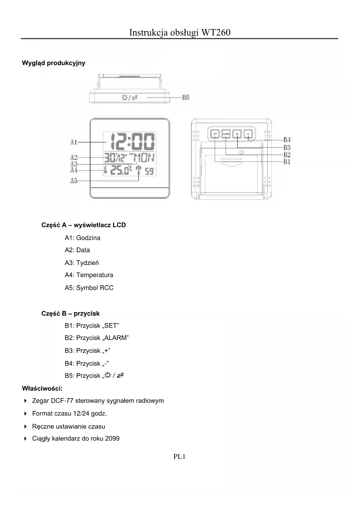 Część A – wyświetlacz LCD A1: Godzina A2: Data A3: Tydzień A4: Temperatura A5: Symbol RCC Część B – przycisk B1: Przycisk „SET” B2: Przycisk „ALARM” B3: Przycisk „+” B4: Przycisk „-” B5: Przycisk „ ” Właściwości: Zegar DCF-77 sterowany sygnałem radiowym Format czasu 12/24 godz. Ręczne ustawianie czasu Ciągły kalendarz do roku 2099PL2 Wyświetlacz daty i dnia tygodnia Temperatura w °C lub °F Automatyczna funkcja drzemki (5 minut) Termometr: Zakresy pomiarowe wewnątrz: -9.9 °C ~ 49.9 °C Bateria: 2 baterie 1,5 V typu „AAA” (nie zawarte w zestawie) Działania wstępne: Otworzyć pokrywę komory baterii Włożyć 2 baterie AAA zgodnie z biegunowością [oznaczenia „+” i „–”] Po włożeniu baterii, na 3 sekundy zapalają się wszystkie ikony na wyświetlaczu LCD, użytkownik usłyszy sygnał dźwiękowy, a stacja wykrywa temperaturę wewnątrz. Odbiór sygnału radiowego DCF: Zegar automatycznie rozpoczyna wyszukiwanie sygnału DCF po uruchomieniu urządzenia. Zaczyna migać symbol masztu radiowego. O godzinie 1:00 zegar sterowany sygnałem radiowym automatycznie wykonuje procedurę synchronizacji z sygnałem DCF, aby poprawić wszelkie odchylenia dokładnego czasu. Jeśli próby synchronizacji nie powiodą się (symbol masztu radiowego znika z wyświetlacza), system automatycznie ponownej synchronizacji o następnej pełnej godzinie. Procedura powtarza się automatycznie do 5 razy. Aby rozpocząć ręczną procedurę odbioru sygnału DCF, należy nacisnąć i przytrzymać przycisk „-”, jeśli w ciągu siedmiu minut urządzenie nie uzyska sygnału, wyszukiwanie sygnału DCF zostanie zatrzymane (symbol masztu radiowego znika) i rozpocznie się ponownie o następnej pełnej godzinie. Uwaga: Jeśli zegar nie może pobrać sygnału DCF (ponieważ odległość jest zbyt duża, aby odebrać sygnał z nadajnika w Mainflingen, Niemcy), masz opcję ustawienia czasu ręcznie, zgodnie z poniższą informacją. Jak tylko możliwy jest odbiór sygnału DCF, zegar zostanie ponownie automatycznie nastawiony. Zalecamy minimalną odległość 2,5 m (8,2 stopy) od wszystkich źródeł zakłóceń, takich tak odbiorniki telewizyjne czy komputery. Odbiór sygnału radiowego jest słabszy w pomieszczeniach o betonowych ścianach i w biurach. W takich ekstremalnych warunkach zegar należy umieścić blisko okna. Ręczne ustawianie czasu: Nacisnąć i przytrzymać przycisk „SET” przez 2 sekundy, zaczyna migać wskazanie 12/24HR. Teraz użyć przycisków „+” oraz „-”, aby przełączyć tryb 12/24-godziny.PL3 Nacisnąć przycisk „SET”, aby potwierdzić swoje ustawienie, zacznie migać strefa czasowa. Użyć przycisków „+” oraz „-”, aby ustawić prawidłową strefę czasową. W Wielkiej Brytanii strefa czasowa jest ustawiana na -1. Nacisnąć „SET”, aby potwierdzić ustawienia, wyświetlacz godziny zacznie migać. Teraz użyć przycisków „+” oraz „-”, aby ustawić godzinę. Nacisnąć „SET”, aby potwierdzić ustawienia, wyświetlacz minut zacznie migać. Teraz użyć przycisków „+” oraz „-”, aby ustawić minuty. Nacisnąć „SET”, aby potwierdzić ustawienia, wyświetlacz roku 2009 zacznie migać. Teraz użyć przycisków „+” oraz „-”, aby ustawić rok. Nacisnąć „SET”, aby potwierdzić ustawienia, wyświetlacz miesiąca zacznie migać. Teraz użyć przycisków „+” oraz „-”, aby ustawić miesiąc. Nacisnąć „SET”,aby potwierdzić ustawienia, wyświetlacz daty zacznie migać. Teraz użyć przycisków „+” oraz „-”, aby ustawić dzień. Nacisnąć przycisk „SET”, aby potwierdzić swoje ustawienie, zaczyna migać wyświetlacz języka. Teraz użyć przycisków „+” oraz „-”, aby ustawić język na GER, ENG, ITA, FRE, DUT,SPA lub DAN. Nacisnąć „SET”, aby potwierdzić ustawienia i zakończyć procedurę ustawiania, przejść do trybu zegara. Uwaga: Jeśli w ciągu 30 sekund nie dojdzie do żadnej czynności, zegar automatycznie przejdzie z trybu ustawiania do trybu normalnego czasu. Ustawianie codziennego alarmu: Nacisnąć i przytrzymać przycisk „ALARM” przez 2 sekundy, aż zacznie migać wyświetlacz czasu alarmu. Wyświetlacz godziny czasu alarmu zacznie migać. Użyć przycisków „+” oraz „-”, aby ustawić godzinę. Nacisnąć przycisk „ALARM”, aby potwierdzić ustawienia. Wyświetlacz minut czasu alarmu zacznie migać. Użyć przycisków „+” oraz „-”, aby ustawić minuty. Nacisnąć przycisk „ALARM”, aby potwierdzić ustawienia i zakończyć procedurę ustawiania. Aby aktywować lub wyłączyć codzienne alarmy, należy krótko nacisnąć jeden raz przycisk „ALARM”. Po uaktywnieniu wyświetla się ikona dzwonka. Uwaga: Jeśli w ciągu 30 sekund nie dojdzie do żadnej czynności, zegar automatycznie przejdzie z trybu ustawiania do trybu normalnego czasu. Dźwięk alarmu będzie trwał przez 2 minuty, jeśli nie zostanie wyłączony poprzez naciśnięcie dowolnego przycisku. W takim przypadku alarm powtórzy się automatycznie po 24 godzinach.PL4 Nasilający się dźwięk alarmu (crescendo, czas trwania: 2 minuty) Funkcja automatycznej drzemki: Kiedy rozlega się alarm, nacisnąć „ ”, aby aktywować funkcję drzemki. Funkcja drzemki jest aktywna, a na wyświetlaczu miga ikona „ ”. Wstrzymuje ona alarm na 5 minut, po czym alarm rozlega się ponownie. Funkcję drzemki można wyłączyć, naciskając jakikolwiek inny przycisk. Wyświetlanie temperatury °C/°F: Temperatura jest wyświetlana w formacie °C lub °F. Naciśnięcie przycisku „-” umożliwia przełączenie formatu na °C lub °F. Niniejszym Technotrade oświadcza, że WT260 jest zgodny z zasadniczymi wymogami oraz pozostałymi stosownymi postanowieniami Dyrektywy 2014/53/EU i ROHS 2011/65/EC.Kopię pełnej deklaracji zgodności można pobrać pod adresem: www.technoline.de/doc/4029665002606 Dane techniczne: Czas życia baterii 12 miesięcy Wymagania otocze