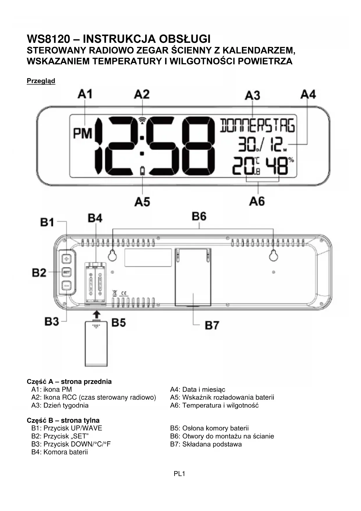 Część A – strona przednia A1: ikona PM A4: Data i miesiąc A2: Ikona RCC (czas sterowany radiowo) A5: Wskaźnik rozładowania baterii A3: Dzień tygodnia A6: Temperatura i wilgotność