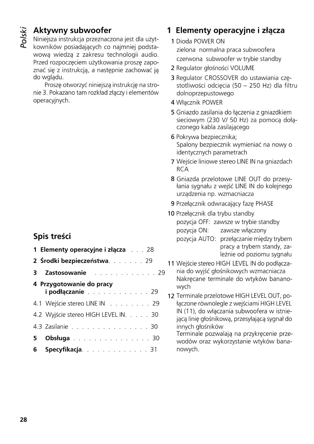 5 Obsługa . . . . . . . . . . . . . . . 30 6 Specyfikacja. . . . . . . . . . . . . 31 Aktywny subwoofer Niniejsza instrukcja przeznaczona jest dla użyt- kowników posiadających co najmniej podsta- wową wiedzą z zakresu technologii audio. Przed rozpoczęciem użytkowania proszę zapo- znać się z instrukcją, a następnie zachować ją do wglądu. Proszę otworzyć niniejszą instrukcję na stro- nie 3. Pokazano tam rozkład złączy i elementów operacyjnych. 1 Elementy operacyjne i złącza 1 Dioda POWER ON zielona normalna praca subwoofera czerwona subwoofer w trybie standby 2 Regulator głośności VOLUME 3 Regulator CROSSOVER do ustawiania czę- stotliwości odcięcia (50 – 250 Hz) dla filtru dolnoprzepustowego 4 Włącznik POWER 5 Gniazdo zasilania do łączenia z gniazdkiem sieciowym (230 V/ 50 Hz) za pomocą dołą- czonego kabla zasilającego 6 Pokrywa bezpiecznika; Spalony bezpiecznik wymieniać na nowy o identycznych parametrach
