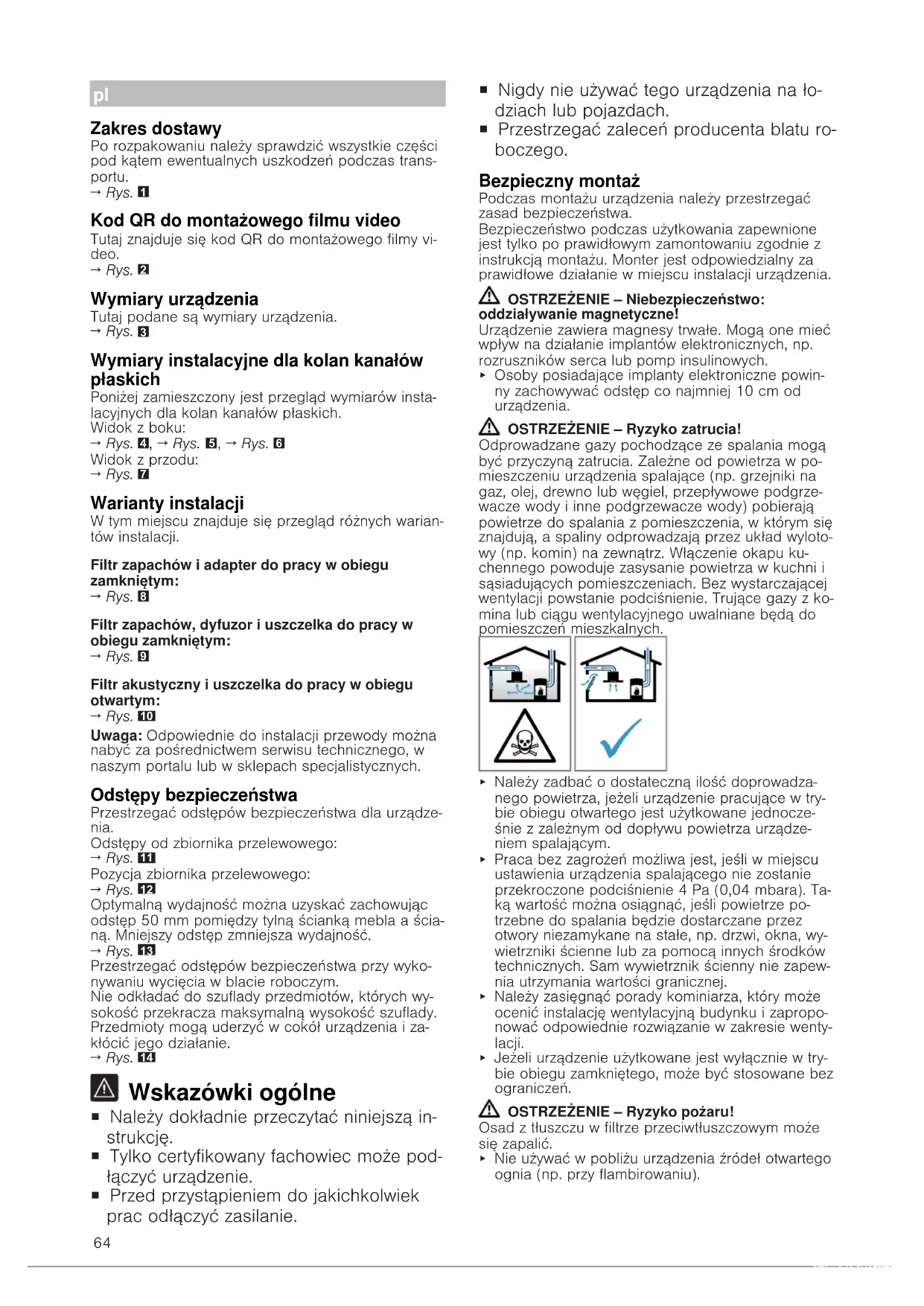 Wskazówki ogólne ¡ Należy dokładnie przeczytać niniejszą in- strukcję. ¡ Tylko certyfikowany fachowiec może pod- łączyć urządzenie. ¡ Przed przystąpieniem do jakichkolwiek prac odłączyć zasilanie. ¡ Nigdy nie używać tego urządzenia na ło- dziach lub pojazdach. ¡ Przestrzegać zaleceń producenta blatu ro- boczego. Bezpieczny montaż Podczas montażu urządzenia należy przestrzegać zasad bezpieczeństwa. Bezpieczeństwo podczas użytkowania zapewnione jest tylko po prawidłowym zamontowaniu zgodnie z instrukcją montażu. Monter jest odpowiedzialny za prawidłowe działanie w miejscu instalacji urządzenia. OSTRZEŻENIE‒Niebezpieczeństwo: oddziaływanie magnetyczne! Urządzenie zawiera magnesy trwałe. Mogą one mieć wpływ na działanie implantów elektronicznych, np. rozruszników serca lub pomp insulinowych. ▶ Osoby posiadające implanty elektroniczne powin- ny zachowywać odstęp co najmniej 10cm od urządzenia. OSTRZEŻENIE‒Ryzyko zatrucia! Odprowadzane gazy pochodzące ze spalania mogą być przyczyną zatrucia. Zależne od powietrza w po- mieszczeniu urządzenia spalające (np. grzejniki na gaz, olej, drewno lub węgiel, przepływowe podgrze- wacze wody i inne podgrzewacze wody) pobierają powietrze do spalania z pomieszczenia, w którym się znajdują, a spaliny odprowadzają przez układ wyloto- wy (np. komin) na zewnątrz. Włączenie okapu ku- chennego powoduje zasysanie powietrza w kuchni i sąsiadujących pomieszczeniach. Bez wystarczającej wentylacji powstanie podciśnienie. Trujące gazy z ko- mina lub ciągu wentylacyjnego uwalniane będą do pomieszczeń mieszkalnych. ▶ Należy zadbać o dostateczną ilość doprowadza- nego powietrza, jeżeli urządzenie pracujące w try- bie obiegu otwartego jest użytkowane jednocze- śnie z zależnym od dopływu powietrza urządze- niem spalającym. ▶ Praca bez zagrożeń możliwa jest, jeśli w miejscu ustawienia urządzenia spalającego nie zostanie przekroczone podciśnienie 4 Pa (0,04 mbara). Ta- ką wartość można osiągnąć, jeśli powietrze po- trzebne do spalania będzie dostarczane przez otwory niezamykane na stałe, np. drzwi, okna, wy- wietrzniki ścienne lub za pomocą innych środków technicznych. Sam wywietrznik ścienny nie zapew- nia utrzymania wartości granicznej. ▶ Należy zasięgnąć porady kominiarza, który może ocenić instalację wentylacyjną budynku i zapropo- nować odpowiednie rozwiązanie w zakresie wenty- lacji. ▶ Jeżeli urządzenie użytkowane jest wyłącznie w try- bie obiegu zamkniętego, może być stosowane bez ograniczeń. OSTRZEŻENIE‒Ryzyko pożaru! Osad z tłuszczu w filtrze przeciwtłuszczowym może się zapalić. ▶ Nie używać w pobliżu urządzenia źródeł otwartego ognia (np. przy flambirowaniu).65 ▶ Urządzenie można zainstalować w pobliżu pieca opalanego paliwem stałym (np. drewnem lub wę- glem) tylko wtedy, gdy występuje zamknięta, za- mocowana na stałe osłona ochronna. Nie może dochodzić do iskrzenia. OSTRZEŻENIE‒Ryzyko odniesienia obrażeń! Wszelkie zmiany i modyfikacje w zakresie układu elektrycznego lub konstrukcji mechanicznej są nie- bezpieczne i mogą być przyczyną nieprawidłowego działania urządzenia. ▶ Nie dokonywać żadnych zmian w zakresie układu elektrycznego lub konstrukcji mechanicznej. Części, które są dostępne podczas montażu, mogą mieć ostre krawędzie i powodować skaleczenia. ▶ Nosić rękawice ochronne. Urządzenie jest ciężkie. ▶ Do przenoszenia urządzenia potrzebne są 2 oso- by. ▶ Używać wyłącznie odpowiednich narzędzi pomoc- niczych. OSTRZEŻENIE‒Ryzyko uduszenia się! Dzieci mogą sobie naciągnąć materiały opakowania na głowę lub zawinąć się w nie i udusić się. ▶ Materiały z opakowania należy trzymać poza za- sięgiem dzieci. ▶ Nie pozwalać dzieciom na zabawę opakowaniem, aszczególnie folią. OSTRZEŻENIE‒Ryzyko zatrucia! Zasysane z powrotem gazy spalinowe mogą prowa- dzić do zatruć. ▶ Nie odprowadzać powietrza wylotowego do pracu- jącego komina dymowego lub komina spalinowe- go. ▶ Nie odprowadzać powietrza wylotowego do szybu, który służy do odpowietrzania pomieszczeń komin- kami. ▶ Jeżeli powietrze wylotowe ma być odprowadzane do komina dymowego lub komina spalinowego, który nie pracuje, trzeba mieć na to zgodę od od- powiedniego mistrza kominiarskiego. Odprowadzane gazy pochodzące ze spalania mogą być przyczyną zatrucia. ▶ Jeżeli okap kuchenny jest zainstalowany z komin- kiem zależnym od powietrza w pomieszczeniu, za- silanie elektryczne okapu kuchennego musi być wyposażone w odpowiedni obwód zabezpieczają- cy. Wskazówki dotyczące przyłącza elektrycznego Aby móc bezpiecznie podłączyć urządzenie do sieci elektrycznej, należy przestrzegać poniższych wskazó- wek. OSTRZEŻENIE‒Ryzyko porażenia prądem! Odłączenie urządzenia od zasilania musi być możli- we w każdej chwili. Urządzenie można podłączyć wy- łącznie do gniazda zainstalowanego zgodnie z prze- pisami. ▶ Jeśli nie jest to możliwe, w stałej instalacji elek- trycznej należy zamontować rozłącznik wielobiegu- nowy zgodnie z warunkami kategorii przepięciowej III i przepisami instalacyjnymi. ▶ Jedynie osoba z uprawnieniami elektryka może wykonać stałą instalację elektryczną. Zalecamy za- instalowanie wyłącznika różnicowo-prądowego (wyłącznik RP) w obwodzie elektrycznym zasilania urządzenia. ¡ Nie zaginać ani nie zaciskać przewodu przyłącze- niowego i trzymać go z dala od ostrych krawędzi. ¡ Ułożyć kabel przyłączeniowy tak, aby nie dotykał gorącej obudowy urządzenia. ¡ Używać wyłącznie przewodu przyłączeniowego do- starczonego wraz z urządzeniem lub przewodu do- starczonego przez serwisanta. ¡ To urządzenie spełnia wymogi zarządzeń WE w sprawie układów przeciwzakłóceniowych. ¡ Urządzenie odpowiada klasie ochrony 1. Dlatego może być użytkowane wyłącznie, jeś