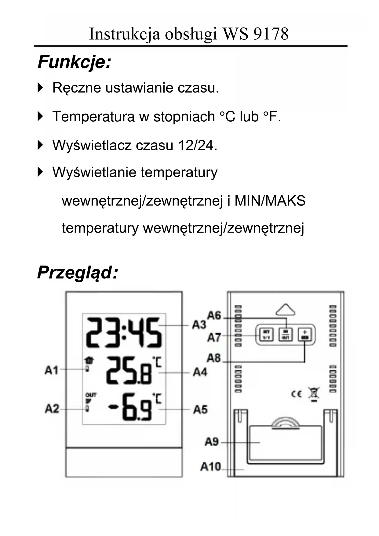 Tento symbol znamená, že elektrická zařízení na konci jejich životnosti je třeba likvidovat odděleně od běžného domácího odpadu. Zařízení vraťte do místního sběrného místa nebo centra pro recyklaci. To platí pro všechny země Evropské unie a ostatní evropské země se samostatným systémem shromažďování odpadu.Instrukcja obsługi WS 9178 Funkcje: Ręczne ustawianie czasu. Temperatura w stopniach °C lub °F. Wyświetlacz czasu 12/24. Wyświetlanie temperatury wewnętrznej/zewnętrznej i MIN/MAKS temperatury wewnętrznej/zewnętrznej Przegląd:Instrukcja obsługi WS 9178 Główna stacja A1: Wskaźnik słabej baterii stacji A2: Wskaźnik niskiego poziomu naładowania akumulatora czujnika A3: Czas A4: Temperatura wewnętrzna A5: Temperatura zewnętrzna A6: Przycisk "IN / OUT"Instrukcja obsługi WS 9178 A7: Przycisk "SET / ° C / ° F" A8: przycisk "+ / MEM" A9: Komora baterii A10: Podstawka Nadajnik zewnętrzny B1: Transmit wskazuje LED B2: Komora baterii B3: Przycisk resetowania Rozpoczęcie działania: Otworzyć komorę baterii z tyłu zdalnego czujnika zewnętrznego i włożyć 2 baterie AA. Należy przy tym przestrzegać prawidłowej biegunowości. Przełącznik kanałów (obok przycisku "Reset") musi byćInstrukcja obsługi WS 9178 ustawiony na 1. Zamknąć komorę baterii. Otworzyć komorę baterii z tyłu stacji bazowej i włożyć 2 baterie AAA. Należy przy tym przestrzegać prawidłowej biegunowości. Zamknąć komorę baterii. Po włożeniu baterii, na 3 sekundy zapalają się wszystkie ikony na wyświetlaczu LCD. Stacja bazowa rozpocznie teraz łączenie się z czujnikiem zewnętrznym. Niniejsze działanie trwa około 3 minuty i jest wyświetlane poprzez miganie symbolu odbiorczej anteny radiowej w obszarze wyświetlacza „OUTDOOR” na odbiorniku. Ręczne ustawianie czasu: Nacisnąć przycisk „SET” przez około 3Instrukcja obsługi WS 9178 sekundy, aby zatwierdzić swoje ustawienie, wyświetlacz trybu godziny 12/24 zaczyna migać. Nacisnąć przycisk „+”, aby ustawić odpowiedni tryb godziny 12/24. Nacisnąć przycisk „SET”, aby potwierdzić swoje ustawienie, wyświetlacz godziny zaczyna migać. Nacisnąć przycisk „+”, aby ustawić odpowiednią godzinę. Ponownie nacisnąć przycisk „SET”, aby zatwierdzić swoje ustawienie, wyświetlacz minut zaczyna migać. Nacisnąć przycisk „+”, aby ustawić odpowiednie minuty. Ponownie nacisnąć przycisk „SET”, aby zatwierdzić swoje ustawienie i zakończyć procedurę ustawiania, a następnie przejść na tryb wyświetlania czasu.Instrukcja obsługi WS 9178 Uwaga: Jeśli przez 30 sekund nie zostanie naciśnięty żaden przycisk, zegar przełączy się automatycznie z trybu ustawiania na tryb wyświetlania czasu. Wyświetlanie temperatury °C/°F: Temperatura wyświetla się w stopniach °C lub °F. Nacisnąć przycisk „°C/°F”, aby przełączyć między indywidualnymi jednostkami miary. Wyświetlanie minimalnej/maksymalnej temperatury: W celu przełączania maksymalnej wartościInstrukcja obsługi WS 9178 temperatury wewnątrz/na zewnątrz należy nacisnąć przycisk „MEM”. Jeden raz, aby wyświetlić maksymalne wartości temperatury wewnątrz/na zewnątrz. Dwa razy, aby wyświetlić minimalne wartości temperatury wewnątrz/na zewnątrz. Trzy razy, aby powrócić do bieżących wartości temperatury. Aby zresetować maksymalną i minimalną temperaturę, nacisnąć i przytrzymać przycisk „MEM” przez około 3 sekundy. Zresetuje to wszystkie zapisane minimalne i maksymalne dane do wyświetlanych obecnie wartości.Instrukcja obsługi WS 9178 Wyświetlanie temperatury wewnątrz/na zewnątrz: Naciśnij przycisk "IN / OUT", aby wyświetlić na wyświetlaczu pozycję temperatury wewnętrznej i zewnętrznej. Bezprzewodowy czujnik zdalny (przekaźnik) Częstotliwość przekaźnika: 433,92 MHz. Zakres transmisji do 60 m (200 stóp). Do przekaźnika włożyć 2 baterie AA, przestrzegając przy tym prawidłowej biegunowości. Przytrzymaj przycisk "IN / OUT" przez 3 sekundy, aby ręcznie wyszukać sygnał czujnika zewnętrznego.Instrukcja obsługi WS 9178 Specyfikacje: Termometr: Zakresy pomiarowe wewnątrz: 0°C (32°F) – 50°C (122°F)
