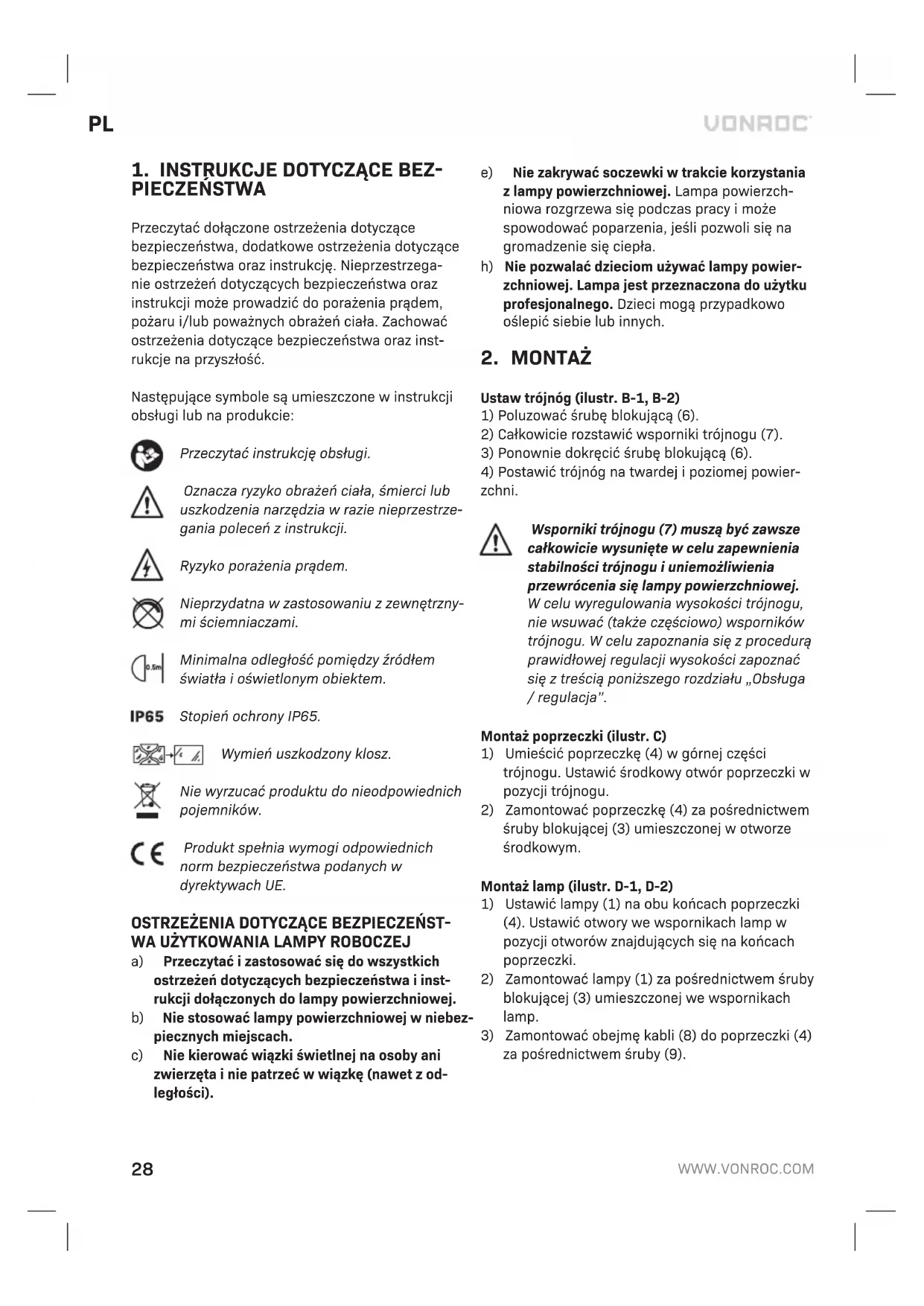 Czyszczenie Odłączyć lampę powierzchniową od głównego zasilania iodczekać do jej schłodzenia się przed rozpoczęciem czyszczenia. Nie stosować żadnych rozpuszczalników, kaustycznych środków czyszc- zących lub podobnych związków chemicznych. Do czyszczenia stosuj suchą lub zwilżoną szmatę. OCHRONA ŚRODOWISKA Uszkodzone i/lub niepotrzebne urządzenia elektryczne lub elektroniczne podlegają zbiórce w odpowiednich punktach recyklingu. Tylko kraje WE Nie wyrzucać elektronarzędzi wraz zodpadami zgospodarstw domowych. Zgodnie zdyrektywą 2012/19/WE dotyczącą zużytych urządzeń elektrycz- nych ielektronicznych oraz jej wdrożeniem do prawo- dawstwa krajowego, elektronarzędzia, które już nie nadają się do użytku, podlegają oddzielnej zbiórce oraz utylizacji w sposób przyjazny dla środowiska. GWARANCJA Produkty VONROC są wytwarzane zgodnie znajwyż- szymi standardami jakości iproducent udziela gwarancji na wady materiałowe iwady wykonania na okres wymagany prawem, licząc od dnia zaku- pu. Jeśli wystąpi usterka produktu w tym okresie spowodowana wadą materiałową i/lub wadą wykonania, proszę bezpośrednio skontaktować się ze sprzedawcą VONROC. Następujące okoliczności powodują unieważnienie gwarancji: