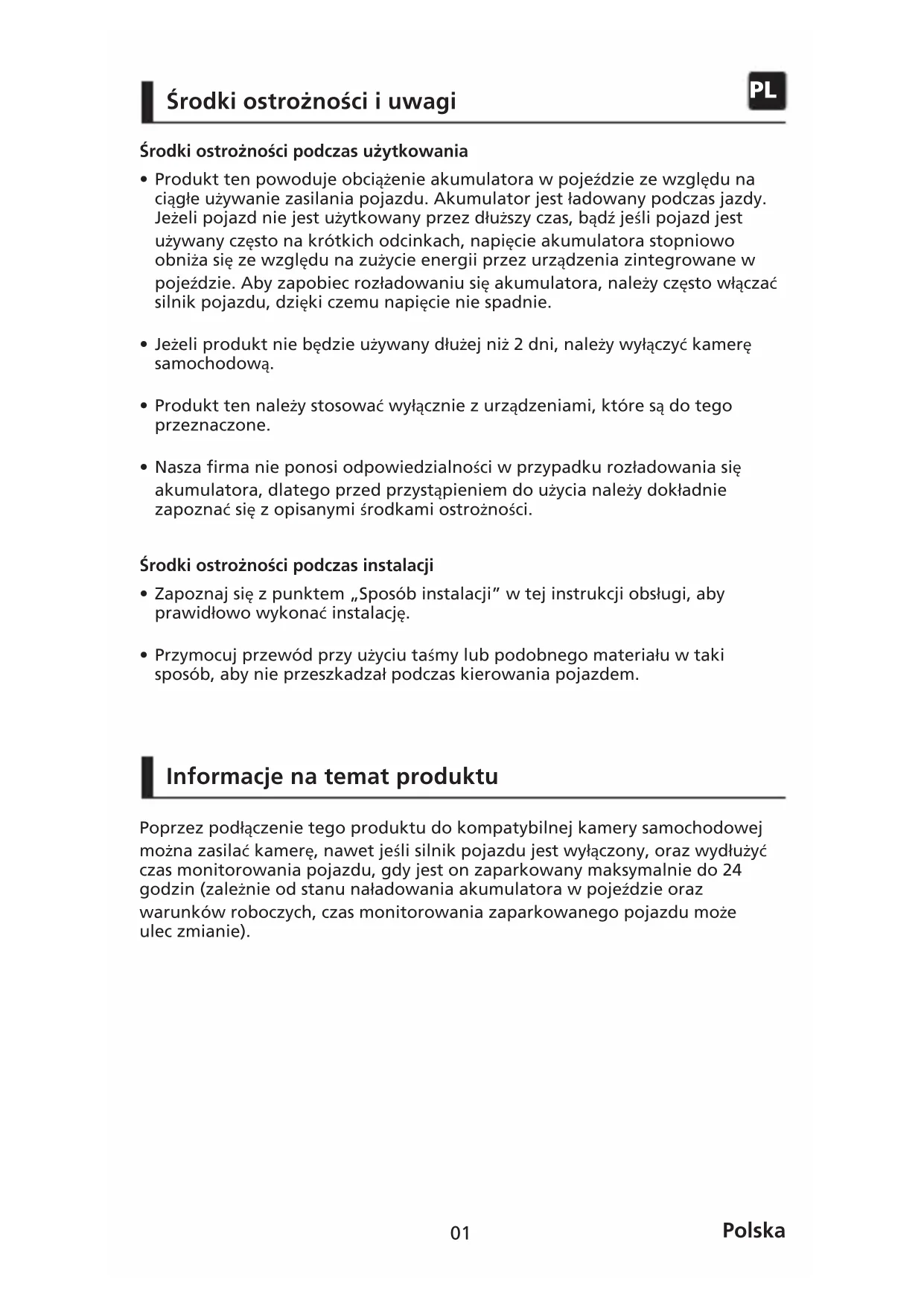 Środki ostro¿ności podczas u¿ytkowania Środki ostro¿ności podczas instalacji Informacje na temat produktu Poprzez podłączenie tego produktu do kompatybilnej kamery samochodowej można zasilać kamerę, nawet jeśli silnik pojazdu jest wyłączony, oraz wydłużyć czas monitorowania pojazdu, gdy jest on zaparkowany maksymalnie do 24 godzin (zależnie od stanu naładowania akumulatora w pojeździe oraz warunków roboczych, czas monitorowania zaparkowanego pojazdu może ulec zmianie).