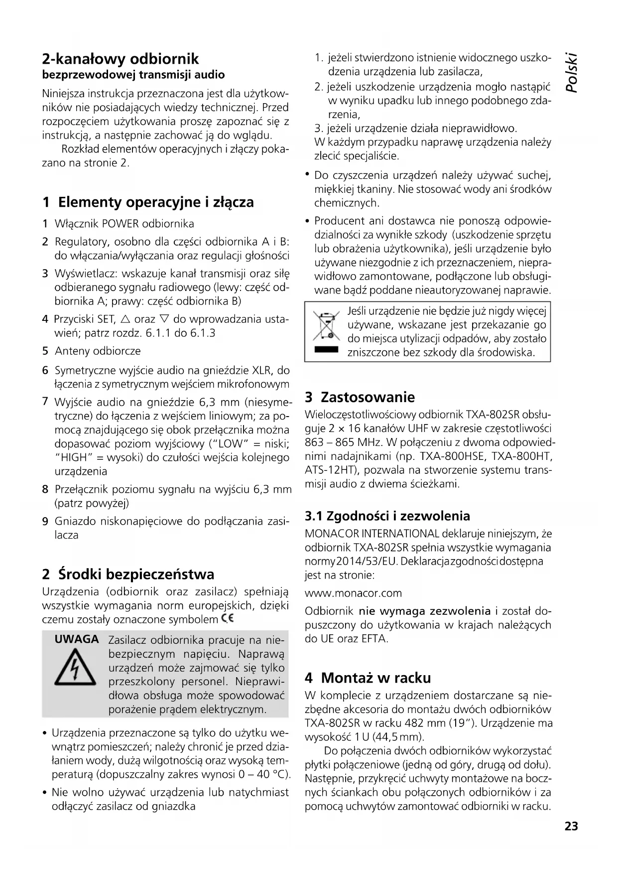 MONACOR INTERNATIONAL deklaruje niniejszym, że odbiornik TXA-802SR spełnia wszystkie wymagania normy 20 14 / 53 / E U. Deklaracja zgodności dostępna jest na stronie: www.monacor.com Odbiornik nie wymaga zezwolenia i został do- puszczony do użytkowania w krajach należących do UE oraz EFTA. 4 Montaż w racku W komplecie z urządzeniem dostarczane są nie- zbędne akcesoria do montażu dwóch odbiorników TXA-802SR w racku 482 mm (19”). Urządzenie ma wysokość 1 U (44,5 mm). Do połączenia dwóch odbiorników wykorzystać płytki połączeniowe (jedną od góry, drugą od dołu). Następnie, przykręcić uchwyty montażowe na bocz- nych ściankach obu połączonych odbiorników i za pomocą uchwytów zamontować odbiorniki w racku.24 Polski 5 Przygotowanie do pracy