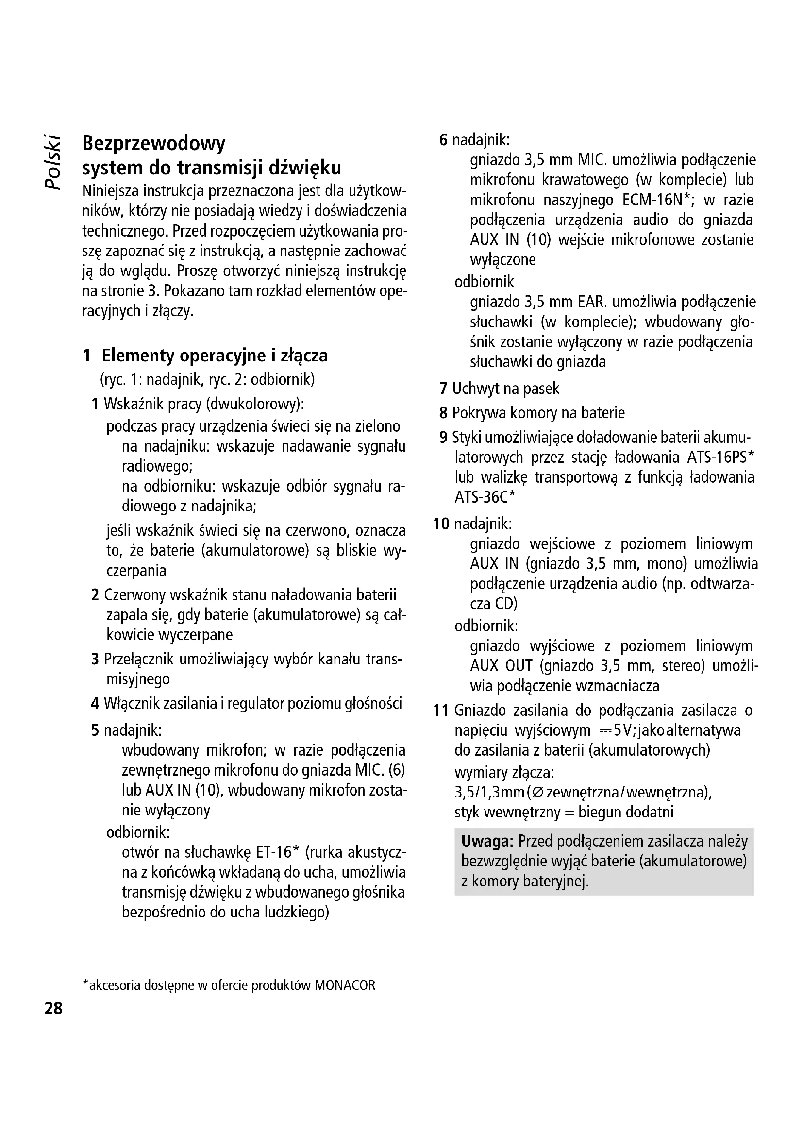 INTERNATIONAL GmbH & Co. KG. Toda reproduc- ción mismo parcial para fines comerciales está prohibida.28 Polski Deutsch Deutsch Seite Inhalt English English Page Contents Français Français Page Table des matières Italiano Italiano Pagina Indice Español Español Página Contenidos Nederlands Nederlands Pagina Inhoud Magyar Magyar Oldal Bezprzewodowy system do transmisji dźwięku Niniejsza instrukcja przeznaczona jest dla użytkow- ników, którzy nie posiadają wiedzy i doświadczenia technicznego. Przed rozpoczęciem użytkowania pro- szę zapoznać się z instrukcją, a następnie zachować ją do wglądu. Proszę otworzyć niniejszą instrukcję na stronie3. Pokazano tam rozkład elementów ope- racyjnych i złączy. 1 Elementy operacyjne i złącza (ryc. 1: nadajnik, ryc. 2: odbiornik) 1 Wskaźnik pracy (dwukolorowy): podczas pracy urządzenia świeci się na zielono na nadajniku: wskazuje nadawanie sygnału radiowego; na odbiorniku: wskazuje odbiór sygnału ra- diowego z nadajnika; jeśli wskaźnik świeci się na czerwono, oznacza to, że baterie (akumulatorowe) są bliskie wy- czerpania 2 Czerwony wskaźnik stanu naładowania baterii zapala się, gdy baterie (akumulatorowe) są cał- kowicie wyczerpane 3 Przełącznik umożliwiający wybór kanału trans- misyjnego 4 Włącznik zasilania i regulator poziomu głośności 5 nadajnik: wbudowany mikrofon; w razie podłączenia zewnętrznego mikrofonu do gniazda MIC. (6) lub AUX IN (10), wbudowany mikrofon zosta- nie wyłączony odbiornik: otwór na słuchawkę ET-16* (rurka akustycz- na z końcówką wkładaną do ucha, umożliwia transmisję dźwięku z wbudowanego głośnika bezpośrednio do ucha ludzkiego) 6 nadajnik: gniazdo 3,5 mm MIC. umożliwia podłączenie mikrofonu krawatowego (w komplecie) lub mikrofonu naszyjnego ECM-16N*; w razie podłączenia urządzenia audio do gniazda AUX IN (10) wejście mikrofonowe zostanie wyłączone odbiornik gniazdo 3,5 mm EAR. umożliwia podłączenie słuchawki (w komplecie); wbudowany gło- śnik zostanie wyłączony w razie podłączenia słuchawki do gniazda 7 Uchwyt na pasek 8 Pokrywa komory na baterie 9 Styki umożliwiające doładowanie baterii akumu- latorowych przez stację ładowania ATS-16PS* lub walizkę transportową z funkcją ładowania ATS-36C* 10 nadajnik: gniazdo wejściowe z poziomem liniowym AUX IN (gniazdo 3,5 mm, mono) umożliwia podłączenie urządzenia audio (np. odtwarza- cza CD) odbiornik: gniazdo wyjściowe z poziomem liniowym AUX OUT (gniazdo 3,5 mm, stereo) umożli- wia podłączenie wzmacniacza 11 Gniazdo zasilania do podłączania zasilacza o napięciu wyjściowym