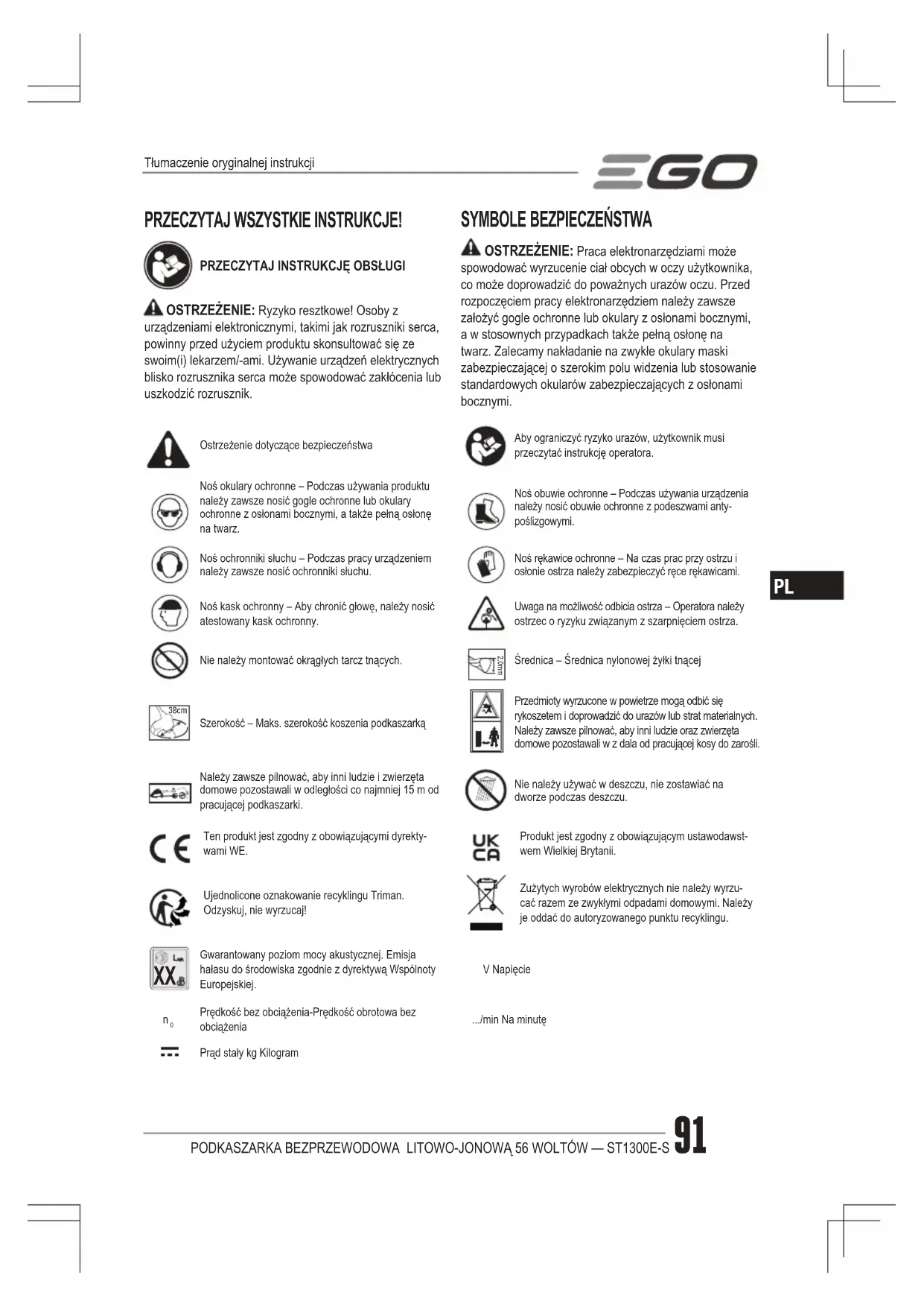 OSTRZEŻENIE: Praca elektronarzędziami może spowodować wyrzucenie ciał obcych w oczy użytkownika, co może doprowadzić do poważnych urazów oczu. Przed rozpoczęciem pracy elektronarzędziem należy zawsze założyć gogle ochronne lub okulary z osłonami bocznymi, a w stosownych przypadkach także pełną osłonę na twarz. Zalecamy nakładanie na zwykłe okulary maski zabezpieczającej o szerokim polu widzenia lub stosowanie standardowych okularów zabezpieczających z osłonami bocznymi. Ostrzeżenie dotyczące bezpieczeństwaAby ograniczyć ryzyko urazów, użytkownik musi przeczytać instrukcję operatora.Noś okulary ochronne – Podczas używania produktu należy zawsze nosić gogle ochronne lub okulary ochronne z osłonami bocznymi, a także pełną osłonę na twarz.Noś obuwie ochronne – Podczas używania urządzenia należy nosić obuwie ochronne z podeszwami anty-poślizgowymi.Noś ochronniki słuchu – Podczas pracy urządzeniem należy zawsze nosić ochronniki słuchu.Noś rękawice ochronne – Na czas prac przy ostrzu i osłonie ostrza należy zabezpieczyć ręce rękawicami.Noś kask ochronny – Aby chronić głowę, należy nosić atestowany kask ochronny.Uwaga na możliwość odbicia ostrza – Operatora należy ostrzec o ryzyku związanym z szarpnięciem ostrza.Nie należy montować okrągłych tarcz tnących. 2.0mmŚrednica – Średnica nylonowej żyłki tnącej 38cm Szerokość – Maks. szerokość koszenia podkaszarkąPrzedmioty wyrzucone w powietrze mogą odbić się rykoszetem i doprowadzić do urazów lub strat materialnych. Należy zawsze pilnować, aby inni ludzie oraz zwierzęta domowe pozostawali w z dala od pracującej kosy do zarośli. 15m Należy zawsze pilnować, aby inni ludzie i zwierzęta domowe pozostawali w odległości co najmniej 15 m od pracującej podkaszarki.Nie należy używać w deszczu, nie zostawiać na dworze podczas deszczu.Ten produkt jest zgodny z obowiązującymi dyrekty-wami WE.Produkt jest zgodny z obowiązującym ustawodawst-wem Wielkiej Brytanii.Ujednolicone oznakowanie recyklingu Triman. Odzyskuj, nie wyrzucaj! Zużytych wyrobów elektrycznych nie należy wyrzu-cać razem ze zwykłymi odpadami domowymi. Należy je oddać do autoryzowanego punktu recyklingu.