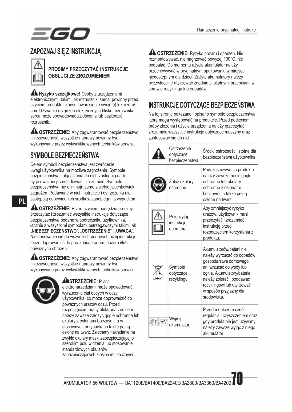 Wat Power min Minuty Time Prąd zmienny Type of current Prąd stały Type or a characteristic of current OSTRZEŻENIE: Prosimy przeczytać ze zrozumieniem wszystkie instrukcje. Niestosowanie się do wszystkich instrukcji może doprowadzić do porażenia prądem, pożaru i/lub poważnych obrażeń. Termin „elektronarzędzie” występujący we wszystkich podanych ostrzeżeniach oznacza zasilane akumulatorowo (bezprzewodowe) maszyny ogrodnicze EGO Power+ lub inne służące do pielęgnacji trawników.
