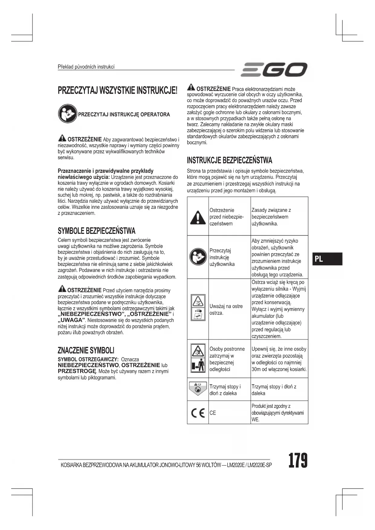Strona ta przedstawia i opisuje symbole bezpieczeństwa, które mogą pojawić się na tym urządzeniu. Przeczytaj ze zrozumieniem i przestrzegaj wszystkich instrukcji na urządzeniu przed jego montażem i obsługą.Ostrzeżenie przed niebezpie-czeństwemZasady związane z bezpieczeństwem użytkownika.Przeczytaj instrukcję użytkownikaAby zmniejszyć ryzyko obrażeń, użytkownik powinien przeczytać ze zrozumieniem instrukcje użytkownika przed obsługą tego urządzenia.Uważaj na ostre ostrza.Ostrza wciąż się kręcą po wyłączeniu silnika - Wyjmij urządzenie odłączające przed konserwacją. Wyłącz i wyjmij wymienny akumulator (lub urządzenie odłączające) przed regulacją lub czyszczeniem.Osoby postronne zatrzymaj w bezpiecznej odległościUpewnij się, że inne osoby oraz zwierzęta pozostają w odległości co najmniej 30m od włączonej kosiarki.Trzymaj stopy i dłoń z dalekaTrzymaj stopy i dłoń z daleka Produkt jest zgodny z obowiązującymi dyrektywami WE. Překlad původních instrukcíKOSIARKA BEZPRZEWODOWA NA AKUMULATOR JONOWO-LITOWY 56 WOLTÓW — LM2020E / LM2020E-SP