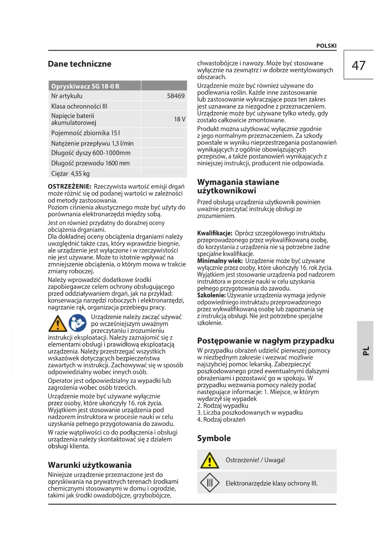 Klasa ochronności III Napięcie baterii akumulatorowej 18 V Pojemność zbiornika 15 l Natężenie przepływu 1,3 l/min Długość dyszy 600-1000mm Długość przewodu 1600 mm Ciężar 4,55 kg OSTRZEŻENIE: Rzeczywista wartość emisji drgań może różnić się od podanej wartości w zależności od metody zastosowania. Poziom ciśnienia akustycznego może być użyty do porównania elektronarzędzi między sobą. Jest on również przydatny do doraźnej oceny obciążenia drganiami. Dla dokładnej oceny obciążenia drganiami należy uwzględnić także czas, który wprawdzie biegnie, ale urządzenie jest wyłączone i w rzeczywistości nie jest używane. Może to istotnie wpływać na zmniejszenie obciążenia, o którym mowa w trakcie zmiany roboczej. Należy wprowadzić dodatkowe środki zapobiegawcze celem ochrony obsługującego przed oddziaływaniem drgań, jak na przykład: konserwacja narzędzi roboczych i elektronarzędzi, nagrzanie rąk, organizacja przebiegu pracy. Urządzenie należy zacząć używać po wcześniejszym uważnym przeczytaniu i zrozumieniu instrukcji eksploatacji. Należy zaznajomić się z elementami obsługi i prawidłową eksploatacją urządzenia. Należy przestrzegać wszystkich wskazówek dotyczących bezpieczeństwa zawartych w instrukcji. Zachowywać się w sposób odpowiedzialny wobec innych osób. Operator jest odpowiedzialny za wypadki lub zagrożenia wobec osób trzecich. Urządzenie może być używane wyłącznie przez osoby, które ukończyły 16. rok życia. Wyjątkiem jest stosowanie urządzenia pod nadzorem instruktora w procesie nauki w celu uzyskania pełnego przygotowania do zawodu. W razie wątpliwości co do podłączenia i obsługi urządzenia należy skontaktować się z działem obsługi klienta. Warunki użytkowania Niniejsze urządzenie przeznaczone jest do opryskiwania na prywatnych terenach środkami chemicznymi stosowanymi w domu i ogrodzie, takimi jak środki owadobójcze, grzybobójcze, chwastobójcze i nawozy. Może być stosowane wyłącznie na zewnątrz i w dobrze wentylowanych obszarach. Urządzenie może być również używane do podlewania roślin. Każde inne zastosowanie lub zastosowanie wykraczające poza ten zakres jest uznawane za niezgodne z przeznaczeniem. Urządzenie może być używane tylko wtedy, gdy zostało całkowicie zmontowane. Produkt można użytkować wyłącznie zgodnie z jego normalnym przeznaczeniem. Za szkody powstałe w wyniku nieprzestrzegania postanowień wynikających z ogólnie obowiązujących przepisów, a także postanowień wynikających z niniejszej instrukcji, producent nie odpowiada. Wymagania stawiane użytkownikowi Przed obsługą urządzenia użytkownik powinien uważnie przeczytać instrukcję obsługi ze zrozumieniem. Kwalikacje: Oprócz szczegółowego instruktażu przeprowadzonego przez wykwalikowaną osobę, do korzystania z urządzenia nie są potrzebne żadne specjalne kwalikacje. Minimalny wiek: Urządzenie może być używane wyłącznie przez osoby, które ukończyły 16. rok życia. Wyjątkiem jest stosowanie urządzenia pod nadzorem instruktora w procesie nauki w celu uzyskania pełnego przygotowania do zawodu. Szkolenie: Używanie urządzenia wymaga jedynie odpowiedniego instruktażu przeprowadzonego przez wykwalikowaną osobę lub zapoznania się z instrukcją obsługi. Nie jest potrzebne specjalne szkolenie. Postępowanie w nagłym przypadku W przypadku obrażeń udzielić pierwszej pomocy w niezbędnym zakresie i wezwać możliwie najszybciej pomoc lekarską. Zabezpieczyć poszkodowanego przed ewentualnymi dalszymi obrażeniami i pozostawić go w spokoju. W przypadku wezwania pomocy należy podać następujące informacje: 1. Miejsce, w którym wydarzył się wypadek