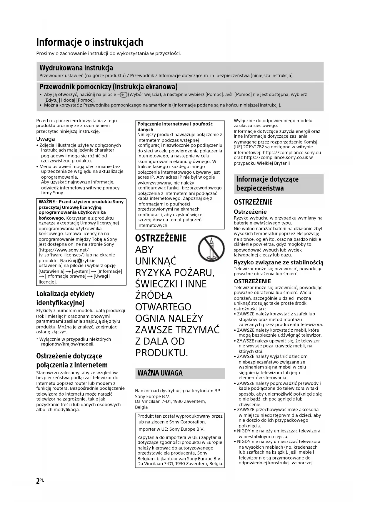 PRODUKTU. Nadzór nad dystrybucją na terytorium RP :Sony Europe B.V.Da Vincilaan 7-D1, 1930 Zaventem,BelgiaWyłącznie do odpowiedniego modelu zasilacza sieciowego:Informacje dotyczące zużycia energii oraz inne informacje dotyczące zasilania wymagane przez rozporządzenie Komisji (UE) 2019/1782 są dostępne w witrynie internetowej: https://compliance.sony.eu oraz https://compliance.sony.co.uk w przypadku Wielkiej Brytanii OSTRZEŻENIE Ostrzeżenie Ryzyko wybuchu w przypadku wymiany na baterie niewłaściwego typu.Nie wolno narażać baterii na działanie zbyt wysokich temperatur poprzez ekspozycję na słońce, ogień itd. oraz na bardzo niskie ciśnienie powietrza, gdyż mogłoby to spowodować wybuch lub wyciek łatwopalnej cieczy lub gazu. Ryzyko związane ze stabilnością Telewizor może się przewrócić, powodując poważne obrażenia lub śmierć. OSTRZEŻENIE Telewizor może się przewrócić, powodując poważne obrażenia lub śmierć. Wielu obrażeń, szczególnie u dzieci, można uniknąć stosując takie proste środki ostrożności jak:• ZAWSZE należy korzystać z szafek lub stojaków oraz metod montażu zalecanych przez producenta telewizora.• ZAWSZE należy korzystać z mebli, które mogą bezpiecznie udźwignąć telewizor.• ZAWSZE należy upewnić się, że telewizor nie wystaje poza krawędź mebli, na których stoi.• ZAWSZE należy wyjaśnić dzieciom niebezpieczeństwo związane ze wspinaniem się na mebel w celu sięgnięcia telewizora lub jego elementów sterowania.• ZAWSZE należy poprowadzić przewody i kable podłączone do telewizora w taki sposób, aby uniemożliwić potknięcie się o nie bądź ich pociągnięcie lub chwycenie.• ZAWSZE przechowywać małe akcesoria w miejscu niedostępnym dla dzieci, aby nie doszło do ich przypadkowego połknięcia.• NIGDY nie należy umieszczać telewizora w niestabilnym miejscu.• NIGDY nie należy umieszczać telewizora na wysokich meblach (np. kredensach lub szafkach na książki), jeśli meble i telewizor nie są przymocowane do odpowiedniej konstrukcji wsporczej. Informacje o instrukcjach Prosimy o zachowanie instrukcji do wykorzystania w przyszłości. Wydrukowana instrukcja Przewodnik ustawień (na górze produktu) / Przewodnik / Informacje dotyczące m. in. bezpieczeństwa (niniejsza instrukcja). Przewodnik pomocniczy (Instrukcja ekranowa)