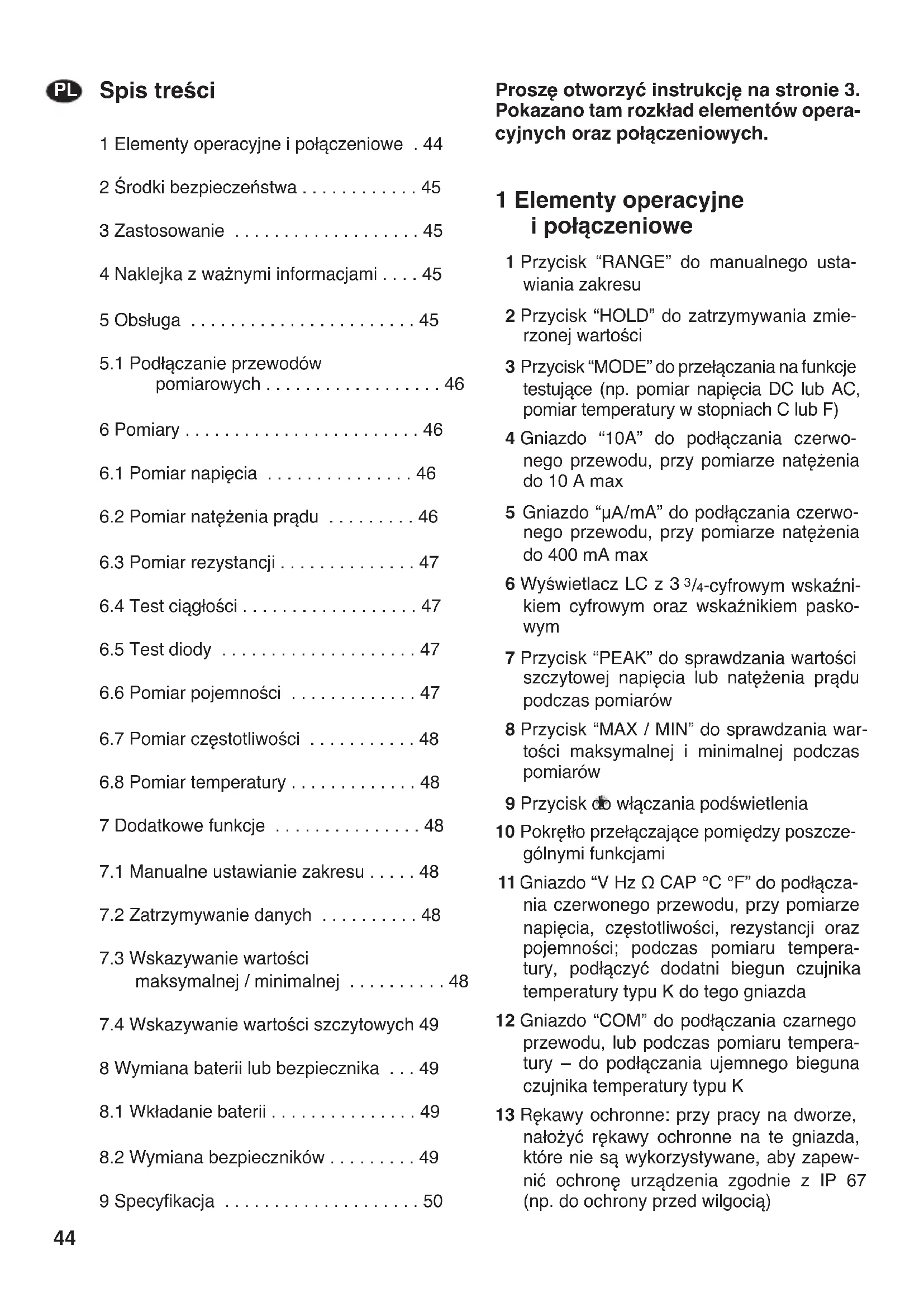 /4-cyfrowym wskaźni- kiem cyfrowym oraz wskaźnikiem pasko- wym 7 Przycisk “PEAK” do sprawdzania wartości szczytowej napięcia lub natężenia prądu podczas pomiarów 8 Przycisk “MAX / MIN” do sprawdzania war- tości maksymalnej i minimalnej podczas pomiarów 9 Przycisk do włączania podświetlenia 10 Pokrętło przełączające pomiędzy poszcze- gólnymi funkcjami 11 Gniazdo “V Hz Ω CAP °C °F” do podłącza- nia czerwonego przewodu, przy pomiarze napięcia, częstotliwości, rezystancji oraz pojemności; podczas pomiaru tempera- tury, podłączyć dodatni biegun czujnika temperatury typu K do tego gniazda 12 Gniazdo “COM” do podłączania czarnego przewodu, lub podczas pomiaru tempera- tury – do podłączania ujemnego bieguna czujnika temperatury typu K 13 Rękawy ochronne: przy pracy na dworze, nałożyć rękawy ochronne na te gniazda, które nie są wykorzystywane, aby zapew- nić ochronę urządzenia zgodnie z IP 67 (np. do ochrony przed wilgocią)