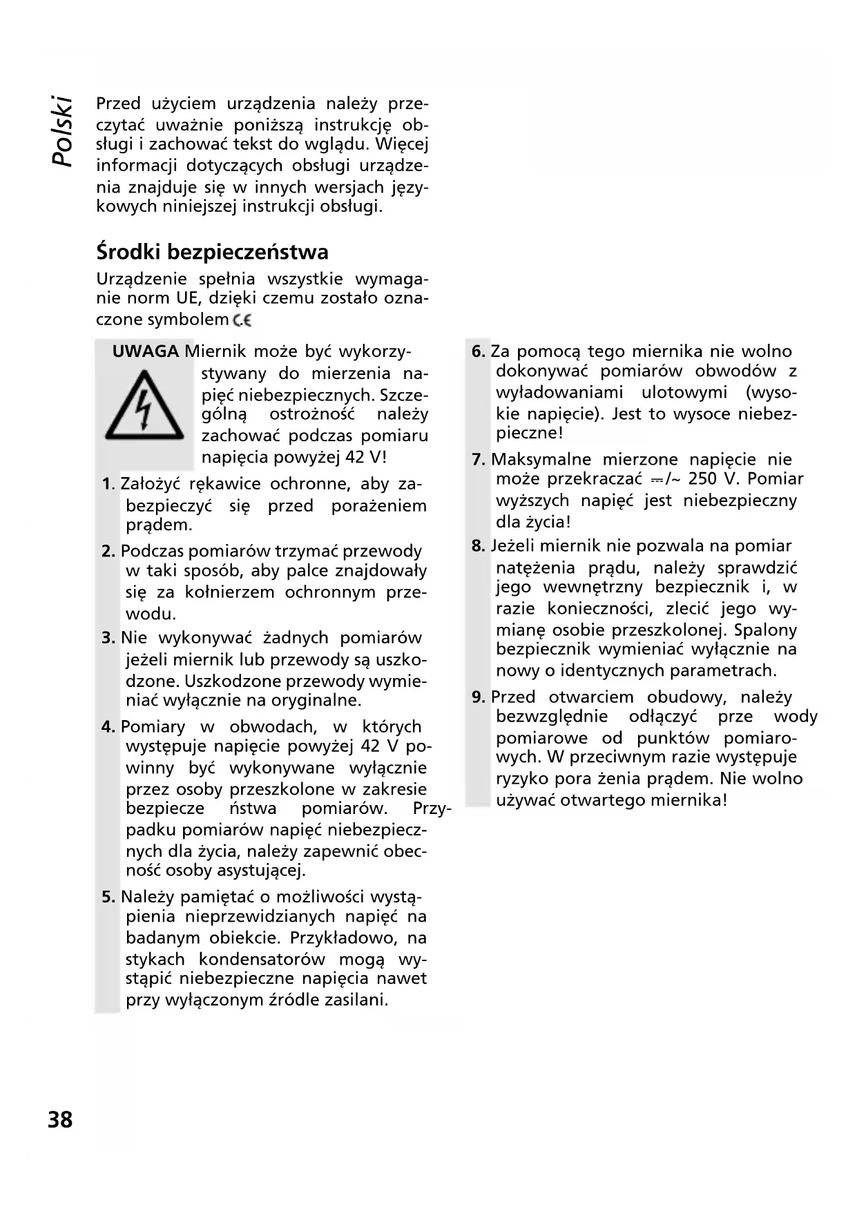 bezwzględnie odłączyć prze wody pomiarowe od punktów pomiaro- wych. W przeciwnym razie występuje ryzyko pora żenia prądem. Nie wolno używać otwartego miernika!39 Polski Należy zawsze przestrzegać poniższych zasad: