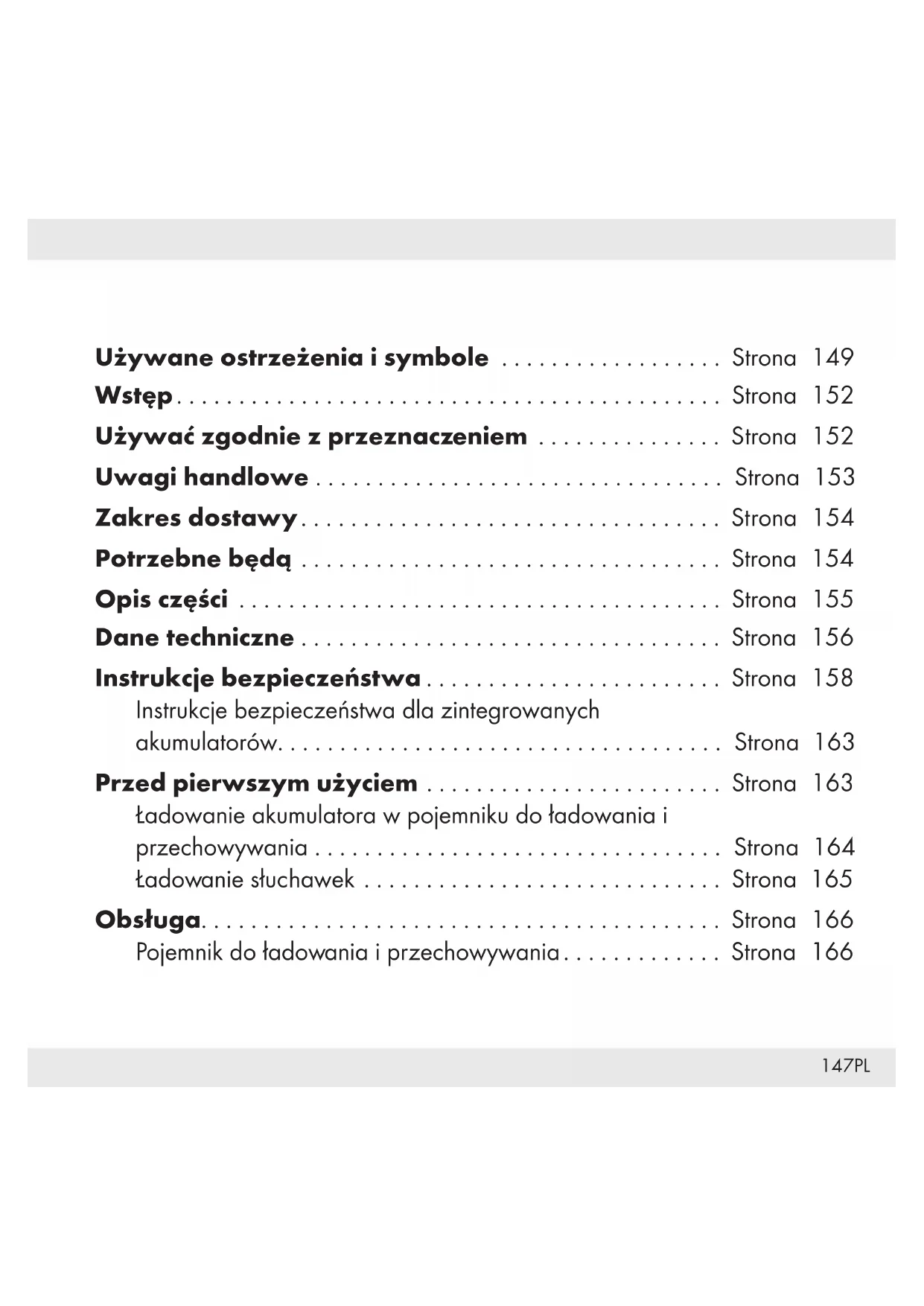 Obsługiwany profil A2DP, AVRCP, HSP, HFP Zakres częstotliwości 2402do 2480 MHz Maks. moc transmisji < 20 mW Zasięg ok.10 m Akumulator Litowo-jonowy, 3,7 V, 85 mAh, 0,32 Wh Czas ładowania ok.2godziny (pełny cykl ładowania) Czas pracy Muzyka: ok.7godzin (średni poziom głośności) Telefon: ok. 2,5 godziny Stopień ochronyIP IPX4 Temperatura robocza +10do +35 °C Wilgotność (bez kondensacji) 10 do 70% względnej wilgotności powietrza Temperatura przechowywania 0do +40 °C Wymiary ok. 51 x 28 x 44 mm (słuchawka) ok. 75 x 76 x 50 mm (pudełko do ładowania) Waga ok. 11,6 g (obie słuchawki) ok. 72 g (pojemnik do ładowania) Specyfikacja i wygląd mogą ulec zmianie bez powiadomienia.158 PL Instrukcje bezpieczeństwa PRZED PIERWSZYM UŻYCIEM PRODUKTU ZAPOZNAĆ SIĘ ZE