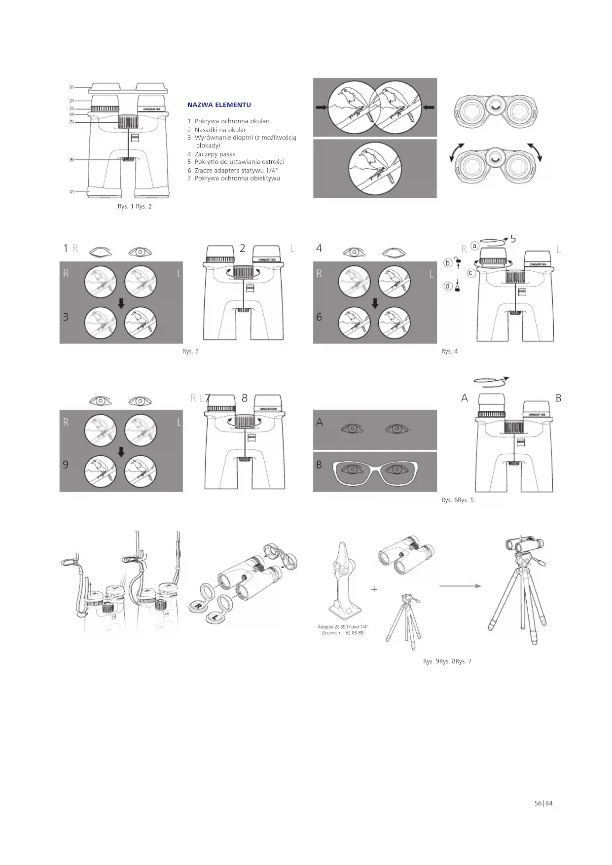 . Teraz mogą się Państwo cieszyć imponującym doświadczeniem naturalnego oddawania obrazu, charakteryzującego się świetną jasnością i wysoką wiernością odwzorowania kolorów. Produkty marki ZEISS wyróżniają się nadzwyczajnymi właściwościami optycznymi, precyzyjnym wykonaniem i długą żywotnością. Aby móc optymalnie korzystać z produktu i cieszyć się nim przez wiele lat, należy przestrzegać poniższych wskazówek dotyczących użytkowania. Należy przestrzegać wskazówek bezpieczeństwa, które są dostępne na stronie internetowej: www.zeiss.com/cop/safety ZAKRES DOSTAWY Produkt Numer katalogowy Zakres dostawy 8 x32 52 32 14 Lornetka Pokrywa ochronna okularu Pokrywa ochronna obiektywu Pasek Torba transportowa wraz zpaskiem Ściereczka do czyszczenia elementów optycznych Skrócona instrukcja Wskazówki dotyczące bezpieczeństwa Adapter statywu ¼” (tylko w przypadku 15 x 56 i LRP 15x56) 10 x32 52 32 15 8 x42 52 42 14 10 x42 52 42 15 8 x56 52 56 34 10 x56 52 56 35 15 x56 52 56 36 15 x 56 LRP 52 56 36 -9901-000 Dostosowanie do rozstawu oczu (odległości między źrenicami) Zgiąć obie połówki lornetki wstosunku do siebie wokół osi środkowej, aż odstęp obu okularów będzie odpowiadał rozstawowi oczu. Pozwoli to uzyskać optymalny dla oczu obraz. Optymalny rozstaw oczu ustawiono, jeśli podczas obserwacji przez lornetkę za pomocą obojga oczu widoczny jest jeden kolisty obraz (rys. 2). Ustawienie ostrości obrazu Lornetka jest wyposażona wpokrętło do regulacji ostrości oraz pokrętło ustawiania ostrości. W celu ustawienia należy zamknąć prawe oko i za pomocą pokrętła ustawiania ostrości ustawić obraz w lewym okularze lornetki tak, aby był ostry (rys.3). Następnie należy zamknąć lewe oko i – o ile jest to konieczne – wyregulować ostrość obrazu wprawym okularze lornetki za pomocą pokrętła wyrównania dioptrii (rys. 4). Szczegóły znajdują się w następnym rozdziale. Funkcja wyrównywania dioptrii jest wyposażona w skalę ze znakami „+” oraz „-” oraz punkt indeksowy służący jako punkt referencyjny. Aby móc szybko ustawić własne wyrównanie dioptrii wkażdej lornetce, warto zapamiętać osobiste parametry. W celu dalszego ustawienia ostrości obrazu na różne odległości wystarczy użyć pokrętła do ustawiania ostrości (rys. 5). Wskazówka: aby ustawić ostrość obydwu obrazów, należy zawsze korzystać ztego samego obiektu! Blokowanie dioptrii Lornetka posiada mechanizm blokujący, który zapobiega niezamierzonemu przestawieniu wyrównywania dioptrii (rys. 4). W celu wyregulowania dioptrii, należy najpierw odkręcić nasadki na okular (a). Następnie można pociągnąć pierścień regulacji dioptrii do góry, aby go odblokować (b). Należy zmienić dioptrie wsposób opisany powyżej, obracając pierścień regulacji dioptrii (c). Po prawidłowym ustawieniu ostrości obrazu należy ponownie nacisnąć pierścień regulacji dioptrii wdół, aby go zablokować (d). Regulacja nasadek na okular, obserwacja zokularami lub bez nich Wprzypadku obserwacji bez okularów należy korzystać zurządzenia zwysuniętymi nasadkami na okular. W tym celu należy wykręcić nasadki na okular, obracając przeciwnie do kierunku ruchu wskazówek zegara do góry lub ew. do najwyższej blokady (rys. 6 – ilustracja A). Nasadki na okular można zablokować wczterech pozycjach – dolnej, górnej oraz w dwóch pozycjach pośrednich. Dzięki tej opcji ustawienia można wyregulować odstęp oka od źrenicy wyjściowej, dostosowując go indywidualnie dla każdego użytkownika. Wprzypadku prowadzenia obserwacji wokularach, nasadki na okular należy obrócić wdół (zgodnie zkierunkiem ruchu wskazówek zegara), aż znajdą się wnajniższym położeniu (rys. 6 – ilustracja B). Wskazówka: nasadki na okular mogą się poluzować, jeśli w stanie wysuniętym zostaną przekręcone nadmiernie w kierunku przeciwnym do ruchu wskazówek zegara. Jest to sytuacja zamierzona, patrz „Czyszczenie i wymiana nasadek na okular”. Czyszczenie iwymiana nasadek na okular W celu przeprowadzenia wymiany lub czyszczenia nasadki na okular można całkowicie odkręcić od lornetki. Wykręcić nasadki na okular jak pokazano na rys. 6 do najwyższego stopnia blokady iwtym samym kierunku dalej przez gwint, aż do całkowitego wykręcenia. Po oczyszczeniu lub wymianie nasadek wkręcić je całkowicie na okular zgodnie z kierunkiem ruchu wskazówek zegara (patrz też rozdział „Regulacja nasadek na okular, obserwacja zokularami lub bez nich”). Poprzez lekkie przesunięcie wprawo gwinty nasadek na okular zablokują się wnajniższym położeniu. Następnie, dzięki stopniom blokady, można w zwykły sposób ustawić właściwy odstęp pomiędzy okiem iokularem. Mocowanie paska iosłony ochronnej Pasek, pokrywa ochronna okularu oraz pokrywa ochronna obiektywu znajdują się wopakowaniu. Pokrywa ochronna okularu oraz pasek są mocowane do lornetki za pomocą zaczepów, jak pokazano na rys. 7. Pasek można wyregulować do wybranej długości, regulując go lub luzując. Po drugiej stronie pokrywy ochronnej okularu należy wrazie potrzeby postępować wtej samej kolejności. Pokrywę ochronną okularu można zamocować wedle własnego uznania, także tylko po jednej stronie. Na pokrywach ochronnych obiektywu, zakładanych odpowiednio na lewy iprawy tubus, naniesiono oznaczenia strony lewej „L” oraz prawej „R” (rys. 8). Korzystanie zpokryw ochronnych okularu iobiektywu Pokrywa ochronna okularu nakładana jest na nasadkę okularu (rys. 8). Można utrzymać pożądaną odległość źrenicy wyjściowej. Przed użyciem lornetki należy ściągnąć osłonę. Pokrywy ochronne obiektywu mogą po zamocowaniu pozostać na lornetce i nie trzeba ich demontować przed użyciem. Montaż adaptera statywu
