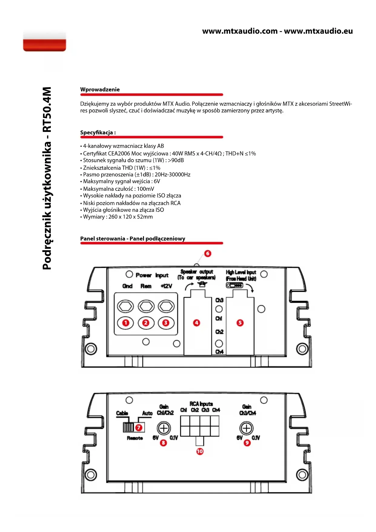 - Wymiary : 260 x 120 x 52mm Panel sterowania - Panel podłączeniowy Podręcznik użytkownika - RT50.4MPanel sterowania - Panel podłączeniowy Złącze (Gnd) : do prawidłowego podłączenia masy użyj krótkiego przewodu o identycznym przekroju jak prze- wód zasilający. Usuń lakier w miejscu podłączenia masy do elementu karoserii samochodu aby uzyskać optymal- ne przewodzenie. Właściwie wykonane uziemienie wpływa znacząco na wydajność wzmacniacza. Terminal wzbudzenia wzmacniacza (Rem) : wzmacniacz może zostać uruchomiony przez ten terminal po zasi- leniu napięciem 12V. Napięcie 12V dostarczne jest z gniazda “remote” bądź z przewodu sterowania anteną elek- tryczną jednostki sterującej. Złącze zasilania (+12V) : jest główne źródło zasilania wzmacniacza i musi być bezpośrednio podłączone do dodatniej klemy akumulatora. Zwróć uwagę na prawidłowe ułożenie przewodu zasilającego w samochodzie. Unikaj układania przewodu wraz z kablami sygnałowymi, antenowymi lub w pobliżu innego sprzętu elektronicz- nego. Ważne jest również korzystanie z wysokiej jakości przewodów o odpowiednim przekroju. Do zasialania wzmacniacza MTX RT50.4M zaleca się uzywanie przewodów o przekroju 8-10mm