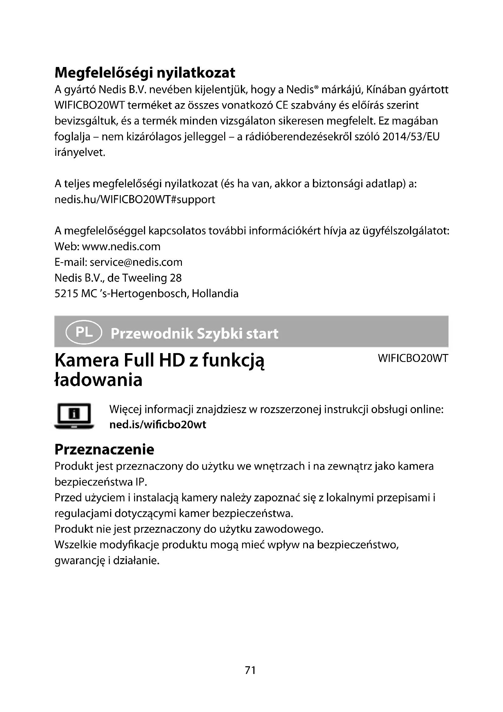 Ustawienia Dotknij przycisk ustawień , aby otworzyć ekran ustawień. Zmiana nazwy produktu Zmiana nazwy kamery bezpieczeństwa. Udostępnianie produktu Udostępnianie dostępu do produktu innym osobom. Informacje o produkcie Wyświetlanie informacji o produkcie. Zarządzanie zasilaniem Sprawdzanie stanu akumulatora i ustawianie sygnału niskiego poziomu naładowania akumulatora. Podstawowe ustawienia funkcji Zmiana ustawień kamery. Przełącznik PIR Regulacja czułości wykrywania ruchu. Ustawienia karty SD Wyświetlanie ustawień karty microSD i konguracja ustawień nagrywania. Opinia Wysyłanie opinii o produkcie do rmy Nedis. Informacje o oprogramowaniu sprzętowym Wersja oprogramowania. Usuwanie produktu Usuwanie produktu z aplikacji Nedis SmartLife. Deklaracja zgodności Niniejszym rma Nedis B.V. deklaruje jako producent, że produkt WIFICBO20WT naszej marki Nedis®, produkowany w Chinach, został przetestowany zgodnie ze wszystkimi odpowiednimi normami i przepisami WE oraz że we wszystkich77 testach uzyskał on pozytywny rezultat. Obejmuje to, ale nie ogranicza się do rozporządzenia RED 2014/53/UE. Pełną deklarację zgodności (oraz kartę danych bezpieczeństwa, jeśli dotyczy) można znaleźć i pobrać tutaj: nedis.pl/WIFICBO20WT#support Aby uzyskać dodatkowe informacje dotyczące zgodności, skontaktuj się z obsługą klienta: Strona www: www.nedis.com E-mail: service@nedis.com Nedis B.V., de Tweeling 28 5215 MC ’s-Hertogenbosch, Holandia.