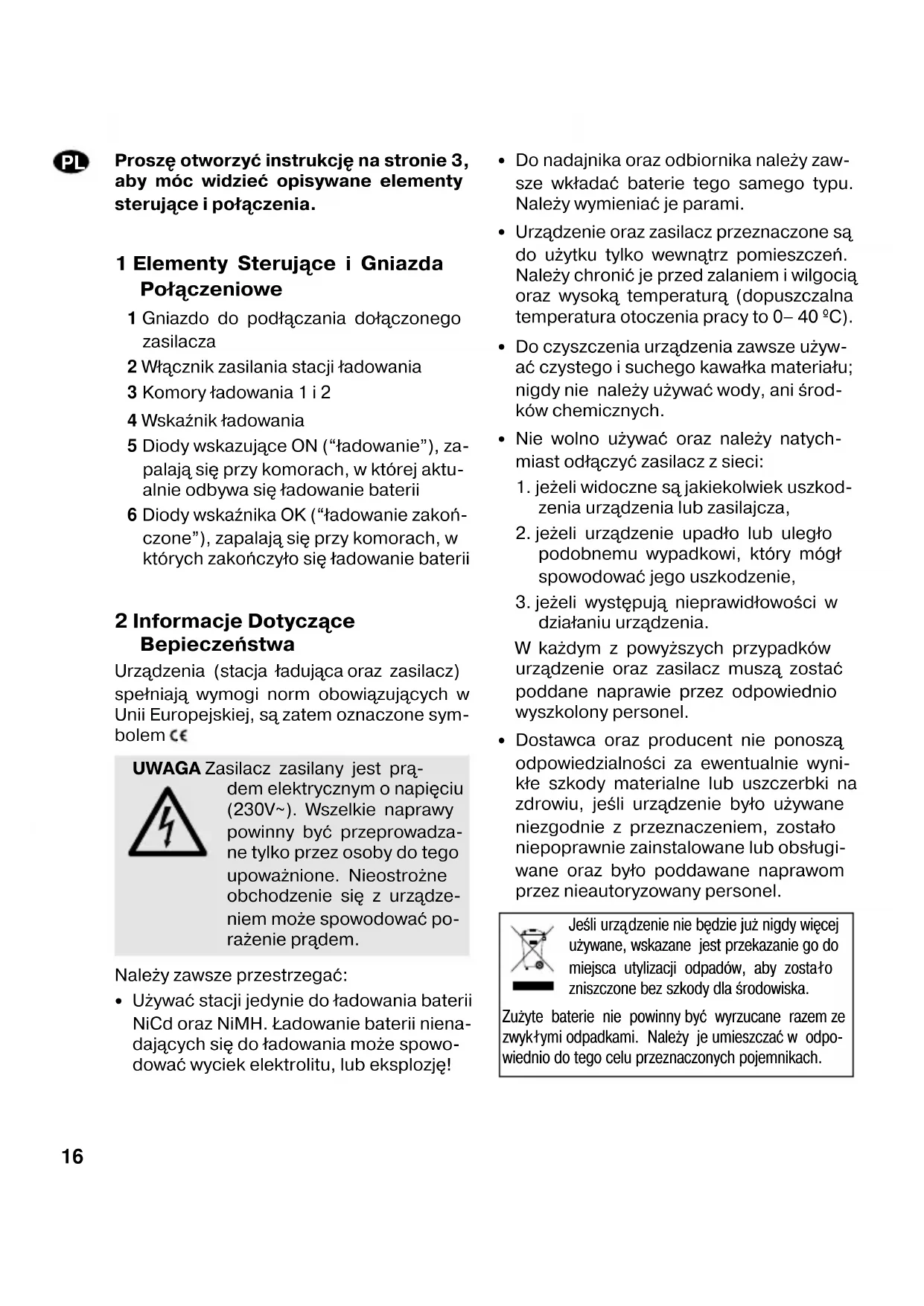 INTERNATIONAL GmbH & Co. KG. Toda reproducción mismo parcial para fines comerciales está prohibida.Proszę otworzyć instrukcję na stronie 3, aby móc widzieć opisywane elementy sterujące i połączenia. 1 Elementy Sterujące i Gniazda Połączeniowe 1 Gniazdo do podłączania dołączonego zasilacza 2 Włącznik zasilania stacji ładowania 3 Komory ładowania 1 i 2 4 Wskaźnik ładowania 5 Diody wskazujące ON (“ładowanie”), za- palają się przy komorach, w której aktu- alnie odbywa się ładowanie baterii 6 Diody wskaźnika OK (“ładowanie zakoń- czone”), zapalają się przy komorach, w których zakończyło się ładowanie baterii 2 Informacje Dotyczące Bepieczeństwa Urządzenia (stacja ładująca oraz zasilacz) spełniają wymogi norm obowiązujących w Unii Europejskiej, są zatem oznaczone sym- bolem . Należy zawsze przestrzegać: