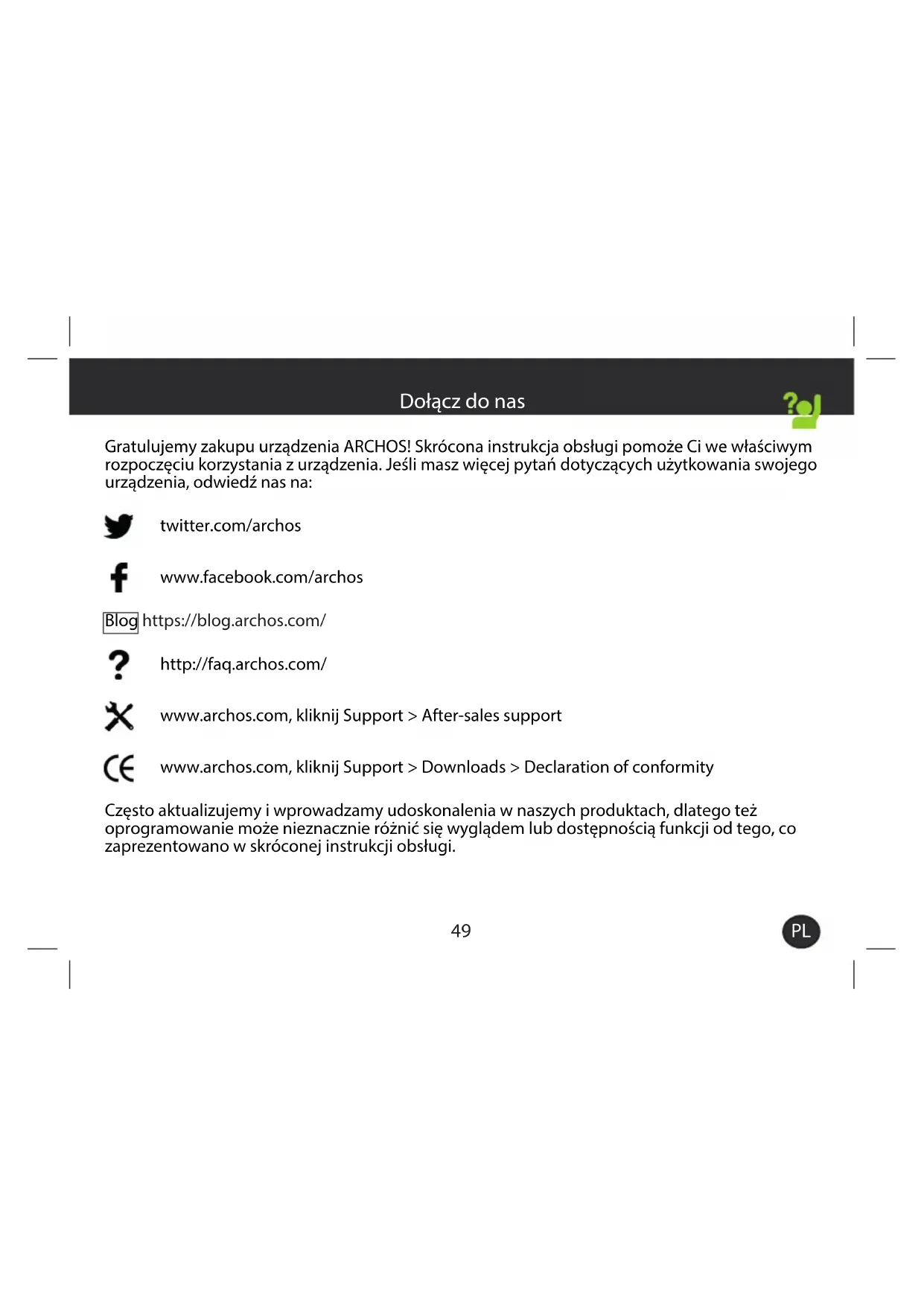 Gratulujemy zakupu urządzenia ARCHOS! Skrócona instrukcja obsługi pomoże Ci we właściwym rozpoczęciu korzystania z urządzenia. Jeśli masz więcej pytań dotyczących użytkowania swojego urządzenia, odwiedź nas na: twitter.com/archos www.facebook.com/archos Blog https://blog.archos.com/ http://faq.archos.com/ www.archos.com, kliknij Support > After-sales support www.archos.com, kliknij Support > Downloads > Declaration of conformity Często aktualizujemy iwprowadzamy udoskonalenia wnaszych produktach, dlatego też oprogramowanie może nieznacznie różnić się wyglądem lub dostępnością funkcji od tego, co zaprezentowano wskróconej instrukcji obsługi. Dołącz do nasINPUT: 5V 2AModel: AC101CR3GMADE IN PRCCore 1013G