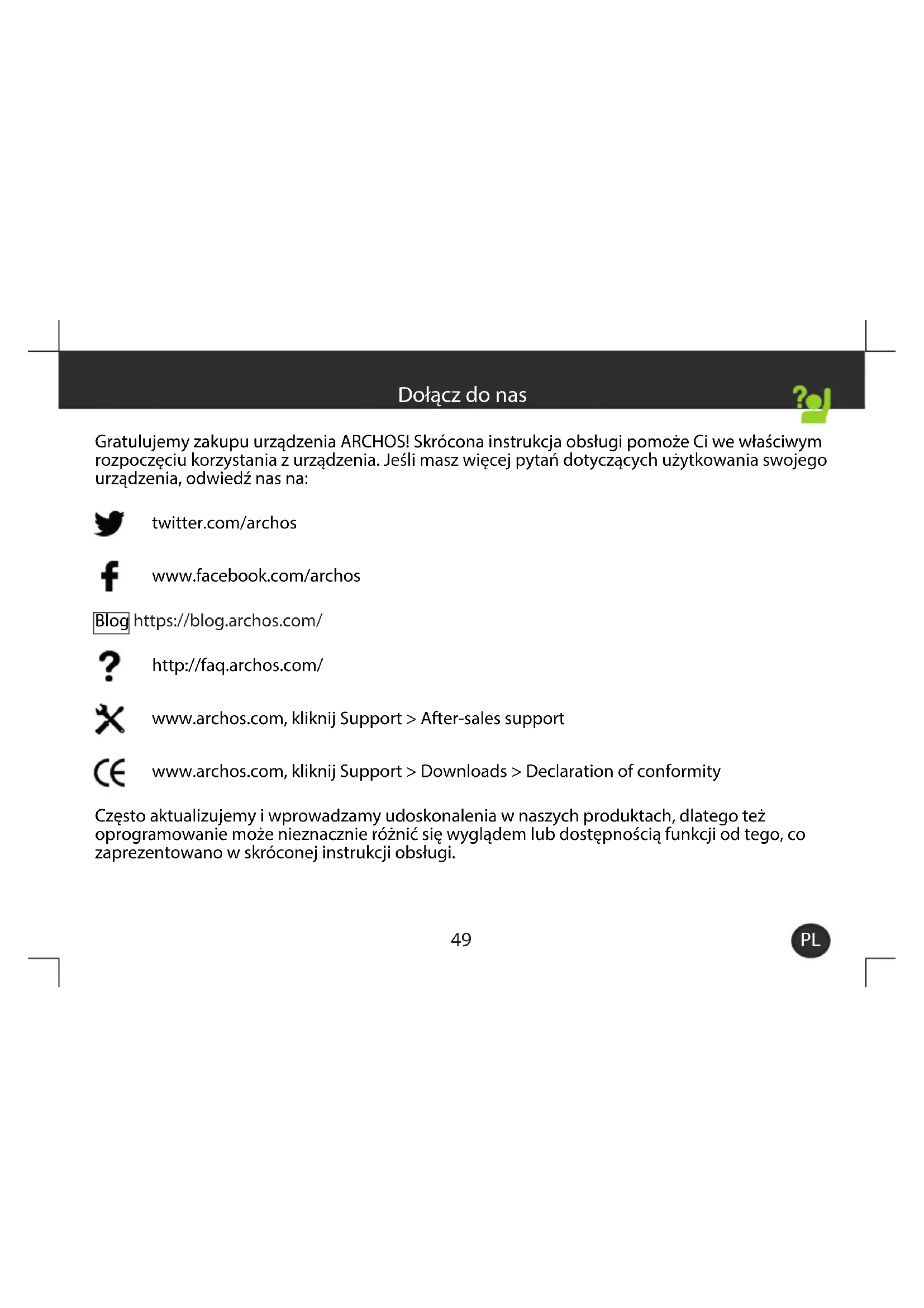 Gratulujemy zakupu urządzenia ARCHOS! Skrócona instrukcja obsługi pomoże Ci we właściwym rozpoczęciu korzystania z urządzenia. Jeśli masz więcej pytań dotyczących użytkowania swojego urządzenia, odwiedź nas na: twitter.com/archos www.facebook.com/archos Blog https://blog.archos.com/ http://faq.archos.com/ www.archos.com, kliknij Support > After-sales support www.archos.com, kliknij Support > Downloads > Declaration of conformity Często aktualizujemy iwprowadzamy udoskonalenia wnaszych produktach, dlatego też oprogramowanie może nieznacznie różnić się wyglądem lub dostępnością funkcji od tego, co zaprezentowano wskróconej instrukcji obsługi. Dołącz do nas70C Neon 19-12-2016last modification:ARCHOS 70c NeonCONFIDENTIAL CMFRev scale 1:1mm Silk Screening (丝印颜色): White AC70CNE