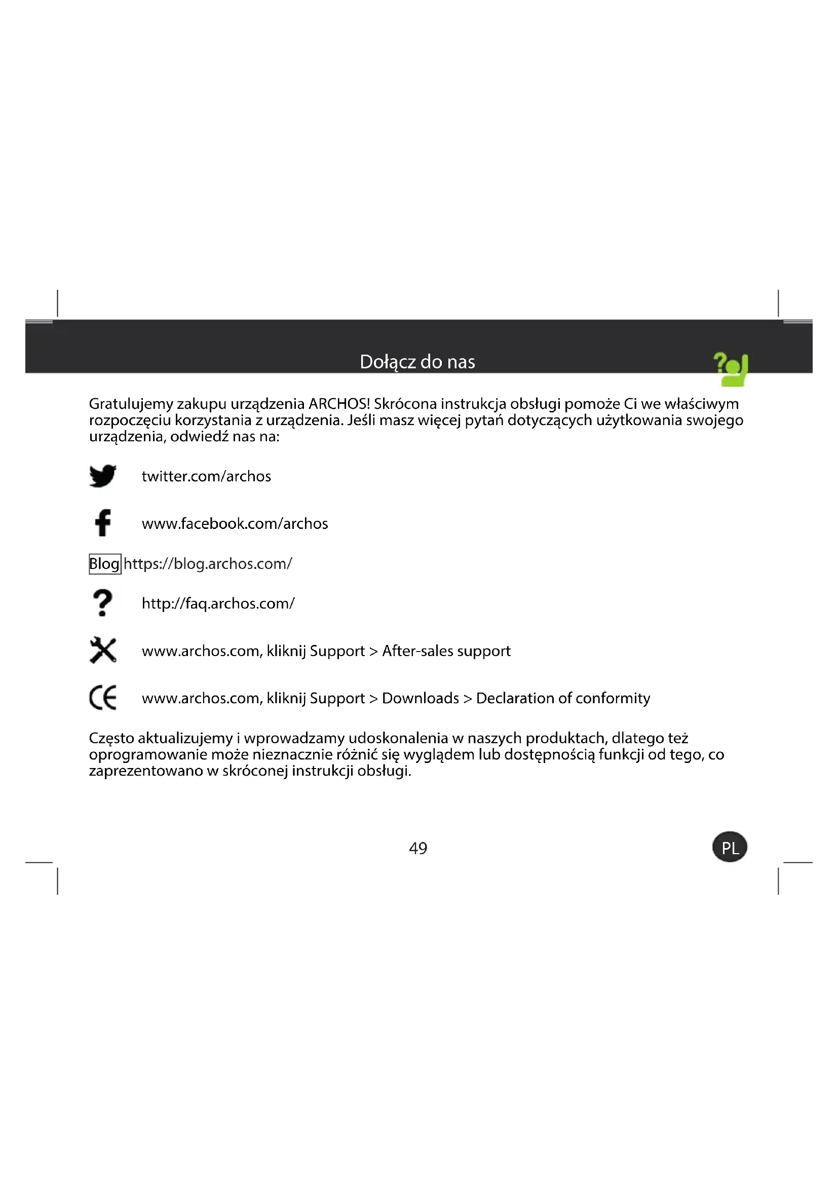 Gratulujemy zakupu urządzenia ARCHOS! Skrócona instrukcja obsługi pomoże Ci we właściwym rozpoczęciu korzystania z urządzenia. Jeśli masz więcej pytań dotyczących użytkowania swojego urządzenia, odwiedź nas na: twitter.com/archos www.facebook.com/archos Blog https://blog.archos.com/ http://faq.archos.com/ www.archos.com, kliknij Support > After-sales support www.archos.com, kliknij Support > Downloads > Declaration of conformity Często aktualizujemy iwprowadzamy udoskonalenia wnaszych produktach, dlatego też oprogramowanie może nieznacznie różnić się wyglądem lub dostępnością funkcji od tego, co zaprezentowano wskróconej instrukcji obsługi. Dołącz do nasINPUT: 5V 1.5AModel: AC101AS3GV2MADE IN PRCARCHOS SA. 12 rue Ampère 91430 Igny France Access 101