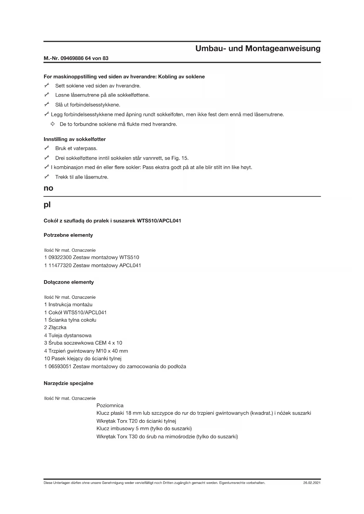 A Przymocować ściankę tylną do dolnej części cokołu (2) za pomocą 1 śruby soczewkowej CEM4x10, patrz rys. 7. A Zawiesić złączki (3) na śrubach mimośrodów, patrz rys. 7. A Przymocować złączki i ściankę tylną do górnej części cokołu (1) za pomocą 2 śrub soczewkowych CEM4x10, patrz rys. 8. A Dokręcić śruby na mimośrodach (2), patrz rys. 8. A Wyrównać urządzenie i cokół za pomocą poziomnicy. A Zakontrować nóżki cokołu. A Przymocować cokół do podłoża za pomocą zestawu montażowego M.-Nr. 06593051. Montaż cokołu pod pralką Przed właściwym montażem należy zamocować złączki do cokołu. Służą one do bezpiecznego łączenia dwóch cokołów. Złączki należy zamocować także wtedy, gdy nie ma jeszcze drugiego cokołu. W ten sposób można uniknąć późniejszego kosztownego doposażenia, a także zapewnić bezpieczne przechowanie złączek. Ustawienie suszarki po lewej stronie i pralki po prawej stronie: patrz rys. 9. Ustawienie pralki po lewej stronie i suszarki po prawej stronie: patrz rys. 10. A Przytrzymać gniazda gwintowe w cokole za pomocą szczypiec do rur i poluzować wszystkie nóżki cokołu. A Odkręcić 2nóżki cokołu po lewej lub po prawej stronie, w zależności od sytuacji montażowej, patrz rys. 9 lub rys. 10. A Przyłożyć podkładki do wanny podłogowej, patrz rys. 9 lub rys. 10. A Przyłożyć złączkę (1) do podkładki, patrz rys. 9 lub rys. 10. A Przykręcić z powrotem 2nóżki cokołu, ale nie mocować ich jeszcze za pomocą przeciwnakrętek.Umbau- und Montageanweisung M.-Nr. 09469886 67 von 83 Diese Unterlagen dürfen ohne unsere Genehmigung weder vervielfältigt noch Dritten zugänglich gemacht werden. Eigentumsrechte vorbehalten. 26.02.2021 WSKAZÓWKA Uszkodzenia pralki i okładziny podłogowej. A Spuścić wodę z pralki. A Wyjąć moduł dozujący. A Kłaść pralkę na boku, wyłącznie z zamontowanym zabezpieczeniem transportowym. A Położyć pralkę na płaskiej, miękkiej podkładce (np. na dywanie). A Zamontować zabezpieczenie transportowe, jeśli zostało ono usunięte – patrz instrukcja użytkowania urządzenia. A Położyć pralkę na boku. A Wykręcić i wyjąć nóżki pralki. A Założyć tuleje dystansowe (1) na trzpienie gwintowane, patrz rys. 11. A Połączyć cokół i pralkę. A Od wewnętrznej strony cokołu dokręcić korki gwintowe za pomocą klucza płaskiego. Korki gwintowe należy dokręcać równomiernie, tzn. na przemian. A Ustawić zestaw pionowo. A Umieścić paski taśmy uszczelniającej zgodnie z ilustracją na wewnętrznej stronie ścianki tylnej, patrz rys. 6. A Przymocować złączki i ściankę tylną do cokołu za pomocą 3śrub soczewkowych CEM4x10, patrz rys. 12. A Wyrównać urządzenie i cokół za pomocą poziomnicy. A Złożyć złączki na cokole. A Zakontrować nóżki cokołu. A Przymocować cokół do podłoża za pomocą zestawu montażowego M.-Nr. 06593051. WSKAZÓWKA A Usunąć zabezpieczenie transportowe. Wkładanie szuflady A Umieścić szufladę na prowadnicach i ją zamknąć.