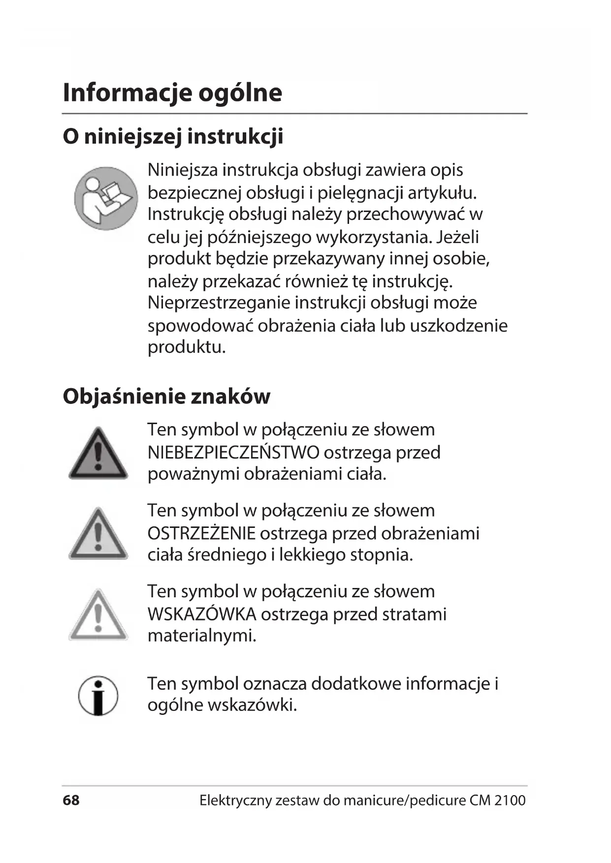- Utylizacja Elektryczny zestaw do manicure/pedicure CM2100 Informacje ogólne O niniejszej instrukcji Niniejsza instrukcja obsługi zawiera opis bezpiecznej obsługi i pielęgnacji artykułu. Instrukcję obsługi należy przechowywać w celu jej późniejszego wykorzystania. Jeżeli produkt będzie przekazywany innej osobie, należy przekazać również tę instrukcję. Nieprzestrzeganie instrukcji obsługi może spowodować obrażenia ciała lub uszkodzenie produktu. Objaśnienie znaków Ten symbol w połączeniu ze słowem NIEBEZPIECZEŃSTWO ostrzega przed poważnymi obrażeniami ciała. Ten symbol w połączeniu ze słowem OSTRZEŻENIE ostrzega przed obrażeniami ciała średniego i lekkiego stopnia. Ten symbol w połączeniu ze słowem WSKAZÓWKA ostrzega przed stratami materialnymi. Ten symbol oznacza dodatkowe informacje i ogólne wskazówki.69 Elektryczny zestaw do manicure/pedicure CM2100 Użycie zgodne z przeznaczeniem Zestaw przeznaczony jest do pielęgnacji paznokci palców urąk inóg oraz do usuwania zrogowaciałego naskórka. Nie nadaje się do użytku komercyjnego, np. wstudiach pielęgnacji paznokci lub do medycznej pielęgnacji stóp. Jeśli to możliwe, nakładki nie powinny być używane przez więcej niż jedną osobę. Wten sposób unika się możliwości przenoszenia chorób, takich jak grzybica paznokci. Bezpieczeństwo Ten produkt może być używany przez dzieci od 8. roku życia oraz przez osoby z ograniczonymi zdolnościami fizycznymi, sensorycznymi lub umysłowymi bądź takie, którym brakuje doświadczenia i wiedzy, tylko wtedy, gdy są nadzorowane lub przeszły przeszkolenie z zakresu bezpiecznego użytkowania produktu i rozumieją wynikające z tego niebezpieczeństwa. Przechowywać urządzenie i zasilacz z dala od dzieci poniżej 8roku życia. Dzieci nie mogą czyścić ani serwisować urządzenia, chyba że mają co najmniej 8lat i są nadzorowane. Polski70 Elektryczny zestaw do manicure/pedicure CM2100 Nie pozostawiać zestawu do manicure/ pedicure bez nadzoru podczas pracy. Zestaw do manicure/pedicure należy przechowywać w miejscu niedostępnym dla dzieci. Nie pozwalać dzieciom na zabawę folią opakowaniową. Mogą się wnią zaplątać podczas zabawy iudusić. W zakresie dostawy znajdują się małe części, które mogą zostać połknięte. Przechowywać z dala od dzieci. Mogą one połknąć małe części izadławić się nimi. Należy używać wyłącznie dostarczonego zasilacza sieciowego KH8-300025EUG iwymieniać go wyłącznie na zasilacz tego samego typu. Zasilacz wolno stosować wyłącznie w suchych pomieszczeniach, chroniąc go przed wilgocią. NIEBEZPIECZEŃSTWO spowodowane elektrycznością Nie zanurzać głowicy ani zasilacza sieciowego wwodzie lub innych płynach. Niebezpieczeństwo porażenia prądem! Dlatego nie należy używać zestawu wpobliżu źródeł wilgoci. Nie użytkować urządzenia na wolnym powietrzu.71 Elektryczny zestaw do manicure/pedicure CM2100 Urządzenie należy podłączyć do prawidłowo zamontowanego gniazdka elektrycznego, które odpowiada napięciu podanemu w części „Dane techniczne”. Upewnić się, że gniazdko jest łatwo dostępne, aby w razie potrzeby można było szybko odłączyć wtyczkę adaptera sieciowego. Nie używać urządzenia gdy: − urządzenie lub jego części są uszkodzone, − kabel zasilacza sieciowego lub wtyczka są uszko- dzone, − po upadku urządzenia. Przed każdym użyciem należy całkowicie rozwinąć kabel zasilacza. Upewnić się, że kabel zasilacza nie został uszkodzony przez ostre krawędzie lub gorące przedmioty. Wyjąć wtyczkę adaptera sieciowego z gniazdka: − gdy urządzenie nie jest używane, − przed napełnieniem lub wylewaniem wody, − przed czyszczeniem lub odstawieniem urządzenia, − jeżeli podczas eksploatacji wystąpi widoczna usterka, − podczas burzy. − Zawsze ciągnąć za wtyczkę adaptera sieciowego, a nie za kabel. Nie modykować urządzenia ani kabla zasilającego. Przeprowadzać naprawy u specjalisty, niewłaściwa naprawa urządzenia może stanowić zagrożenie dla użytkownika. Polski72 Elektryczny zestaw do manicure/pedicure CM2100 NIEBEZPIECZEŃSTWO obrażeń ciała Nie należy używać urządzenia wotoczeniu, wktórym niedawno używano pojemników zaerozolem lub tlenu. Podczas użytkowania stosować ochronę oczu. Urządzenie należy użytkować wczystym otoczeniu. Zawsze należy upewnić się, że urządzenie jest wyłączone przed podłączeniem go do prądu za pomocą zasilacza sieciowego. Wymiana nakładek może być dokonywana tylko przy wyłączonej głowicy. UWAGA – Szkody materialne Chronić urządzenie przed wstrząsami, ekstremalnymi temperaturami ibezpośrednim działaniem promieni słonecznych. Unikać nagrzewania się urządzenia, nie używać go pod kocem lub poduszką. Zurządzenia należy korzystać maksymalnie przez 10minut bez przerwy. Następnie urządzenie musi stygnąć przez ok. 10minut. Używać tylko oryginalnych akcesoriów. Jeśli używane są nieoryginalne akcesoria, istnieje zwiększone ryzyko wypadków. Wrazie wypadków lub szkód spowodowanych nieoryginalnymi akcesoriami nie ponosimy odpowiedzialności. Nie należy przykrywać zasilacza sieciowego, aby zapobiec gromadzeniu się ciepła. Nie należy czyścić artykułu twardymi, drapiącymi lub ściernymi środkami czyszczącymi, wełną stalową itp.73 Elektryczny zestaw do manicure/pedicure CM2100 Zapytaj lekarza przed użyciem jeśli cierpisz na otwarte rany, wysypki na palcach rąk inóg, podrażnienia skóry lub choroby skóry, takie jak atopowe zapalenie skóry, łuszczyca, itp jeśli cierpisz na cukrzycę, masz problemy zżyłami inaczyniami lub masz problemy zgojeniem się ran jeśli nie jesteś pewien, czy urządzenie jest dla Ciebie odpowiednie. Symbole na zasilaczu sieciowym Klasa ochrony II Klasa ochrony III Transformator bezpieczeństwa odporny na zwarcia Ta=40°C Zasilacz sieciowy może być używany wtemperaturze otoczenia do 40